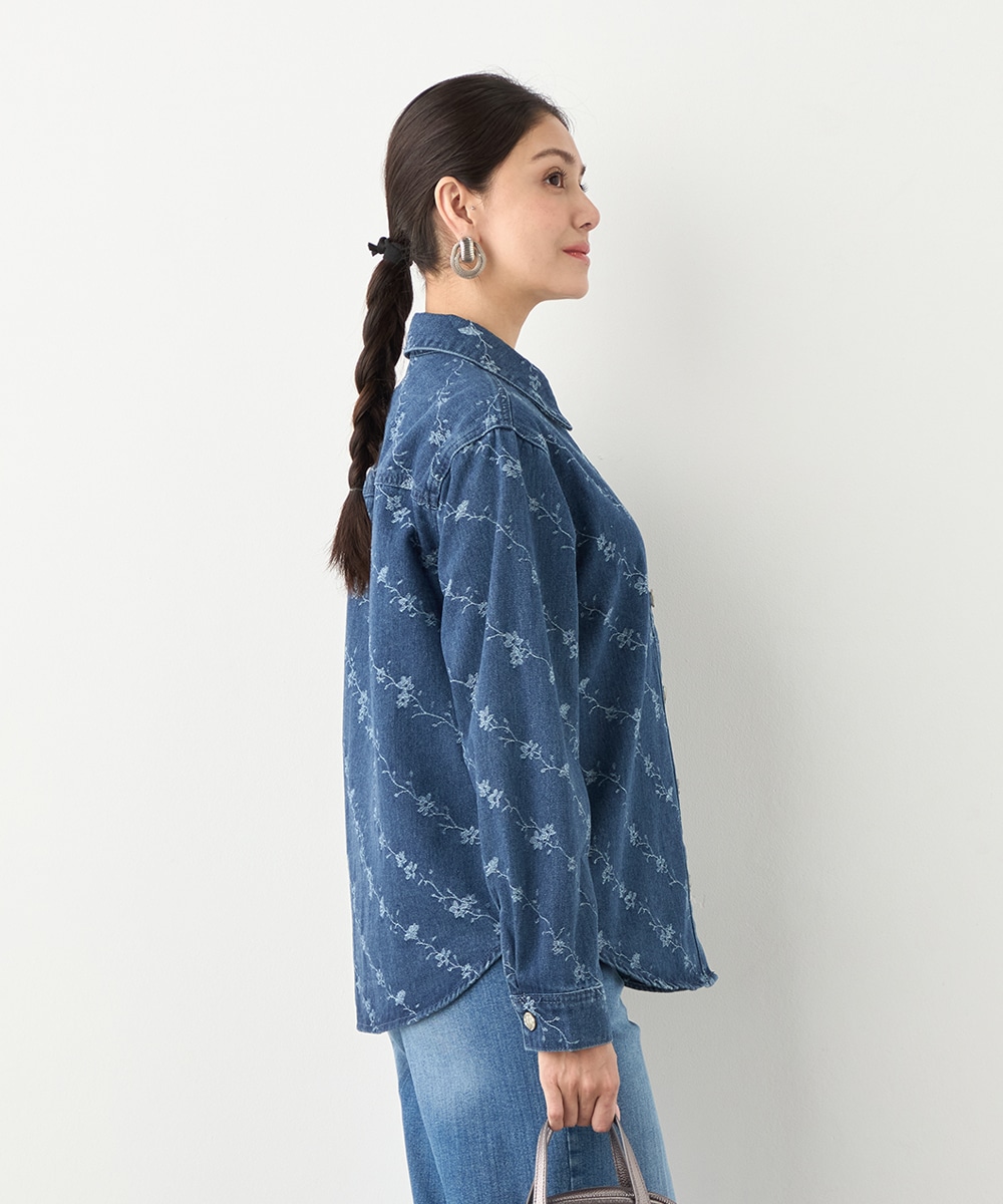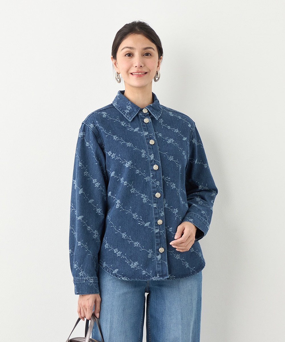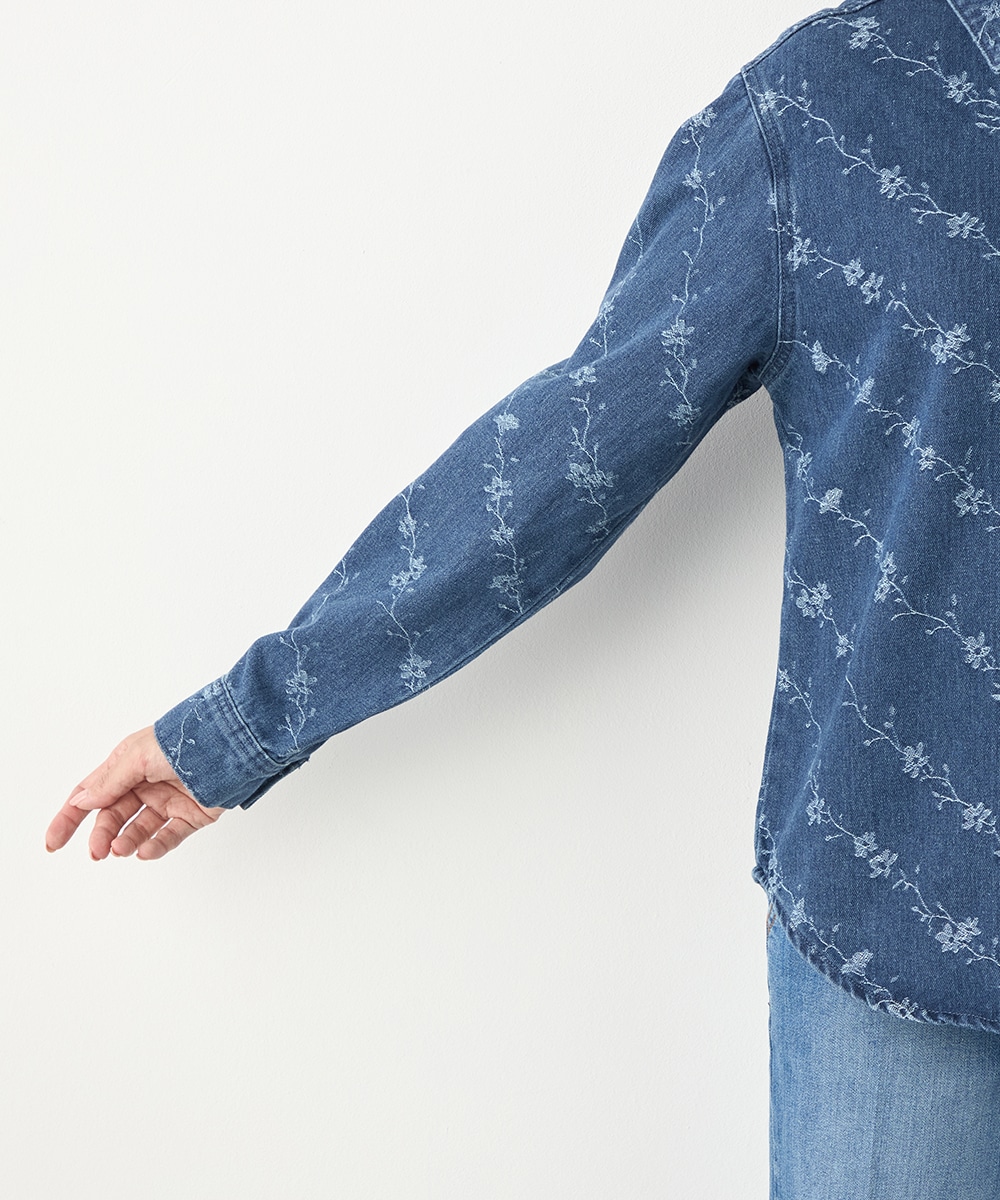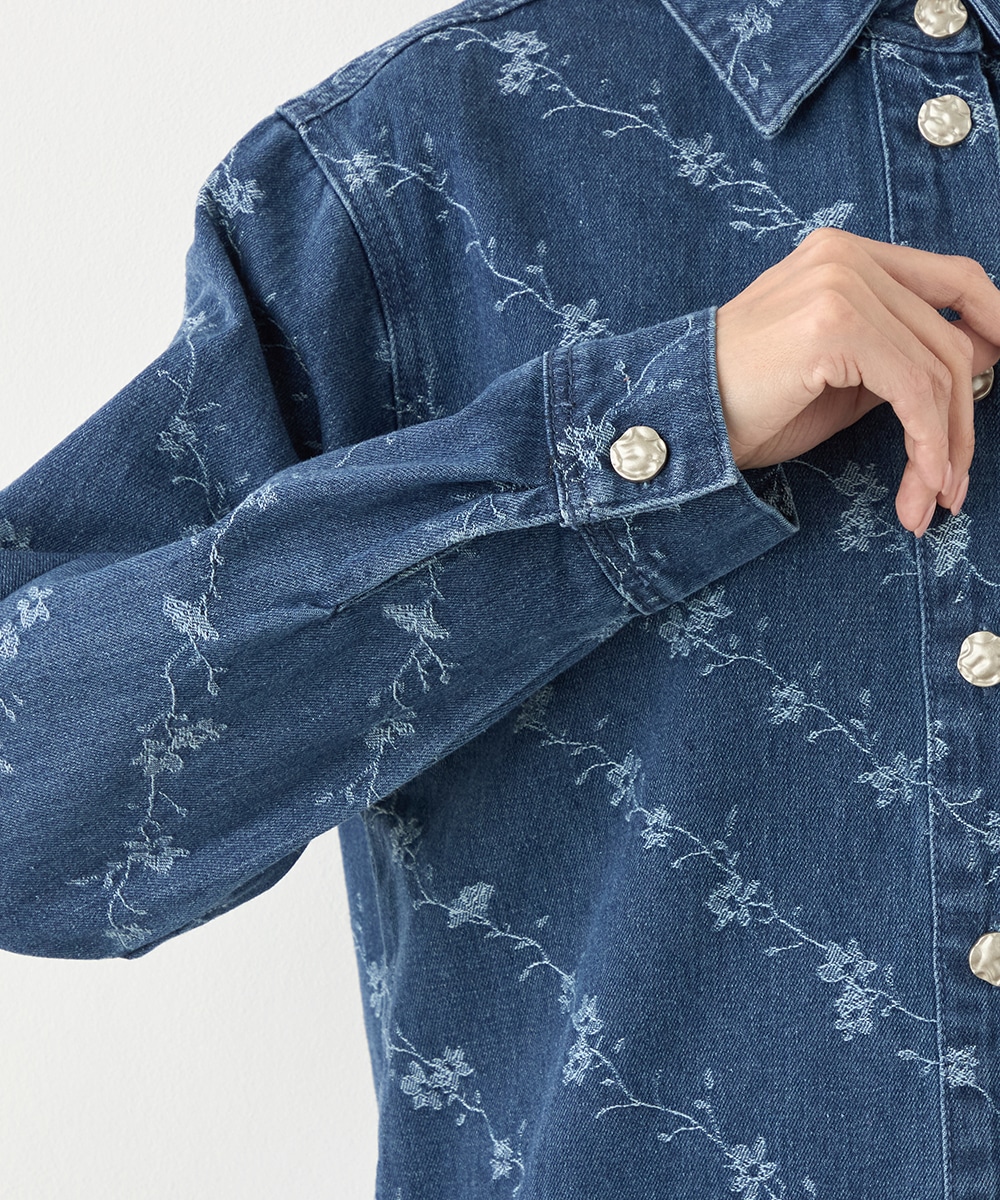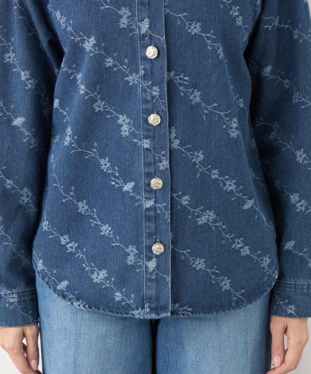 カジュアルに着こなせるデニムシャツを刺繍によりアップデート。色数を抑えたことで、存在感がありながらもすっきりとまとまっています。柄がバイアスストライプ状に配置されてモードな雰囲気も魅力です。メタリックな表情やランダムなフォルムが特徴のボタンも目を引きます。