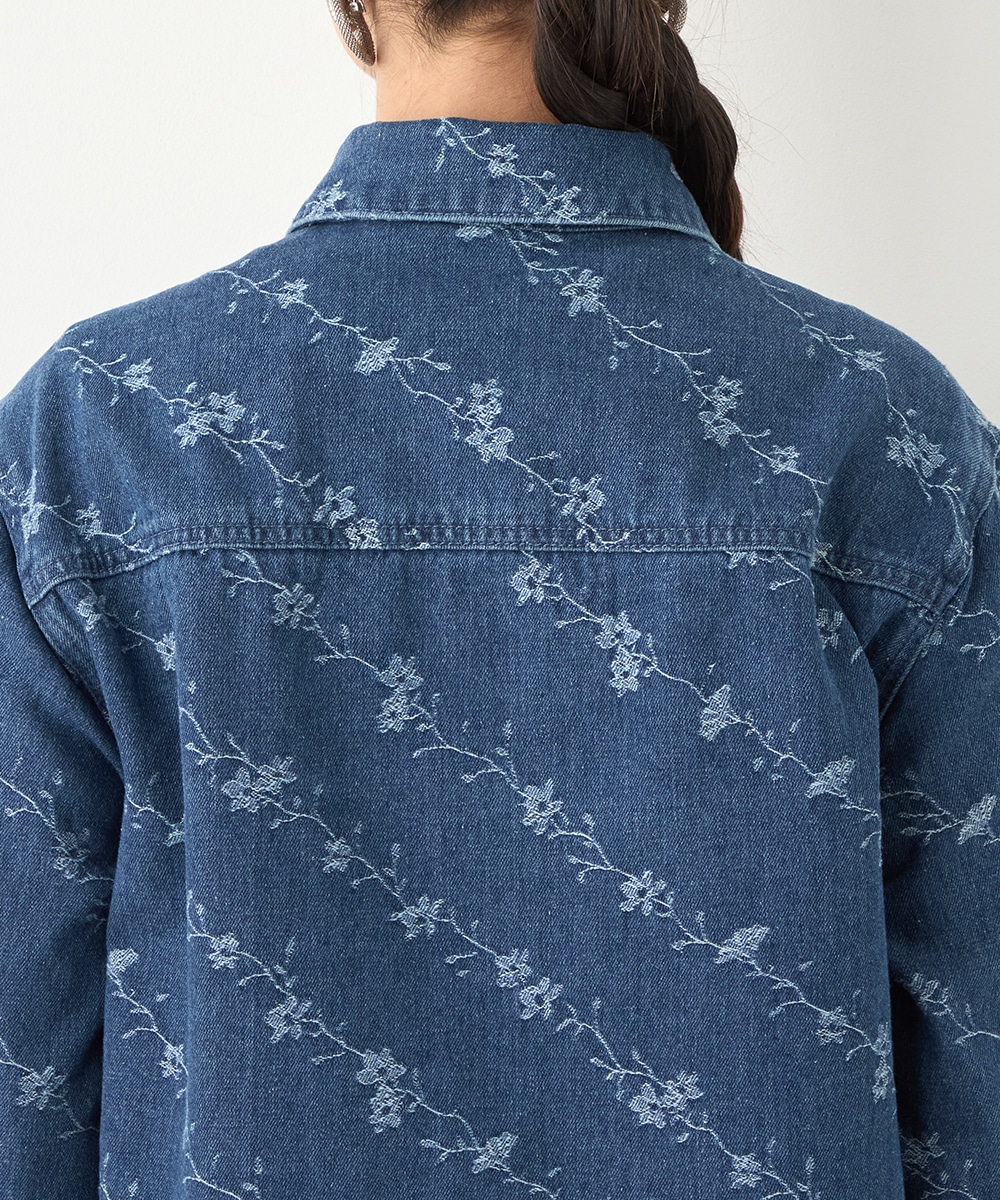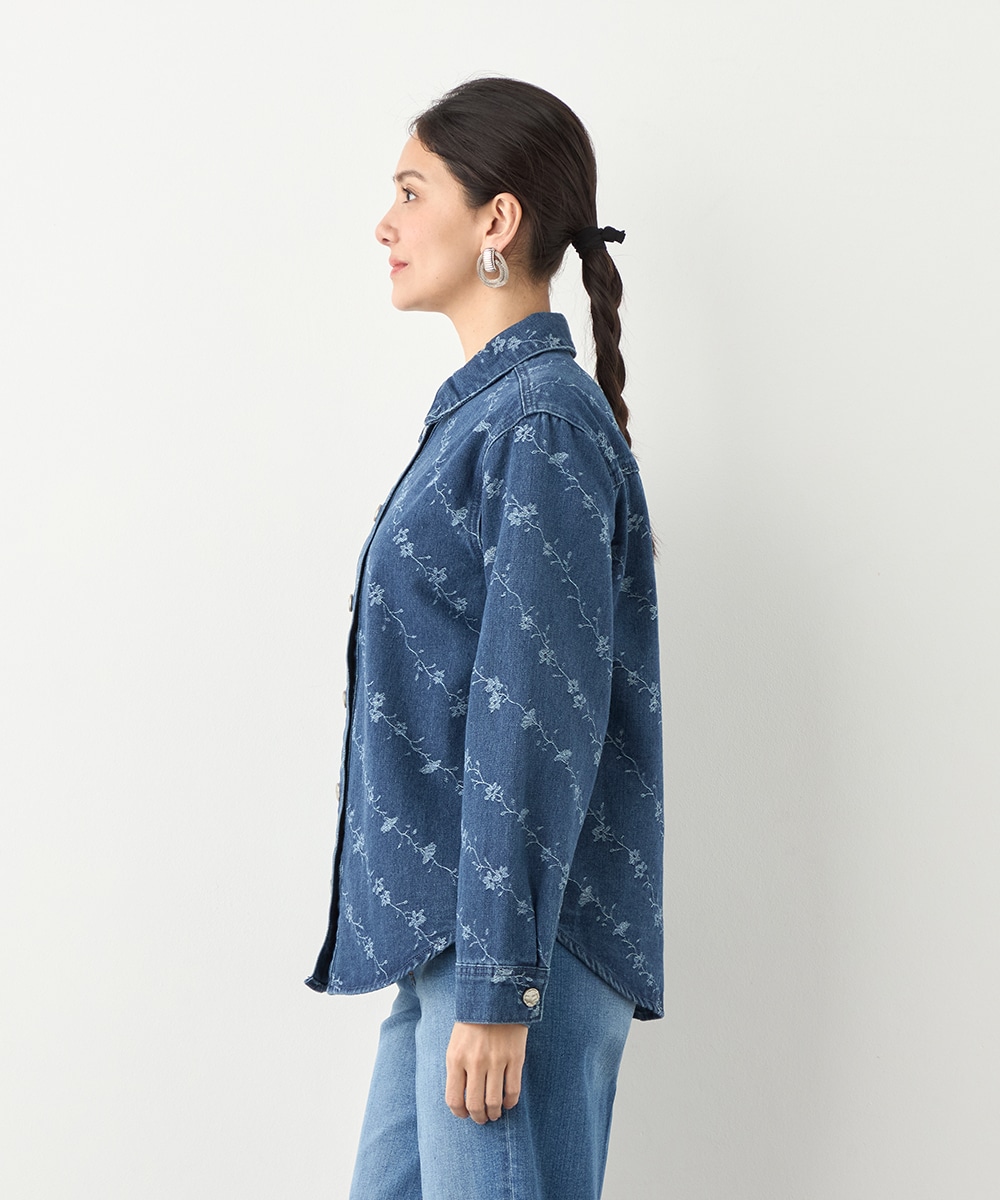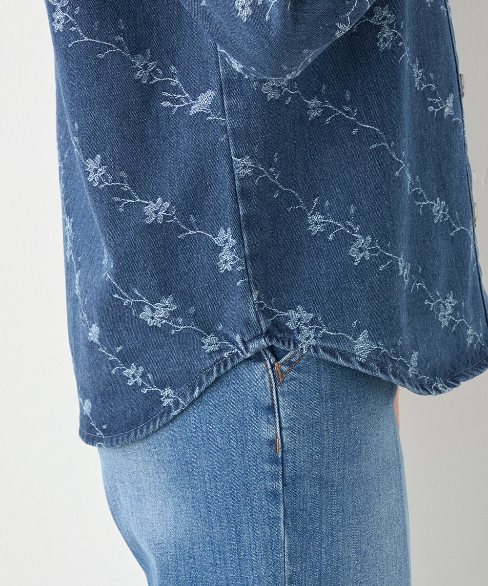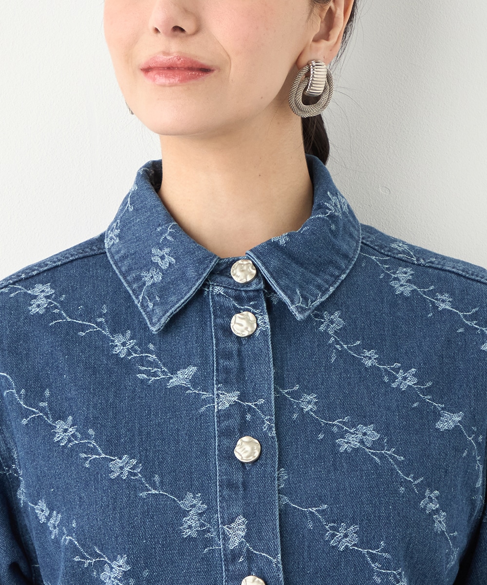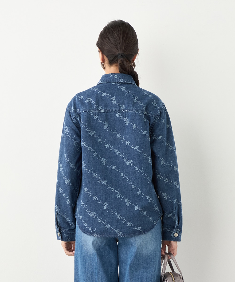 カジュアルに着こなせるデニムシャツを刺繍によりアップデート。色数を抑えたことで、存在感がありながらもすっきりとまとまっています。柄がバイアスストライプ状に配置されてモードな雰囲気も魅力です。メタリックな表情やランダムなフォルムが特徴のボタンも目を引きます。