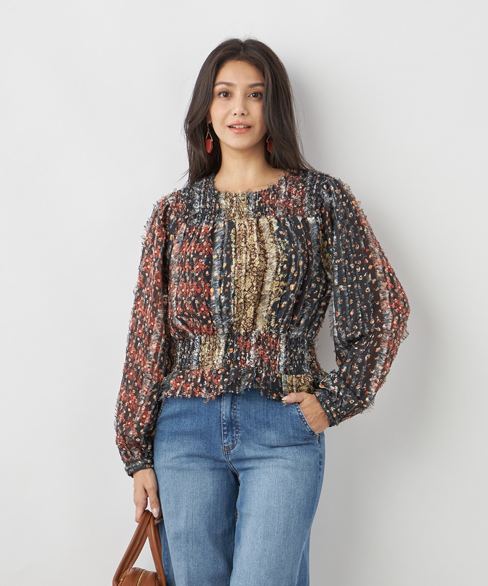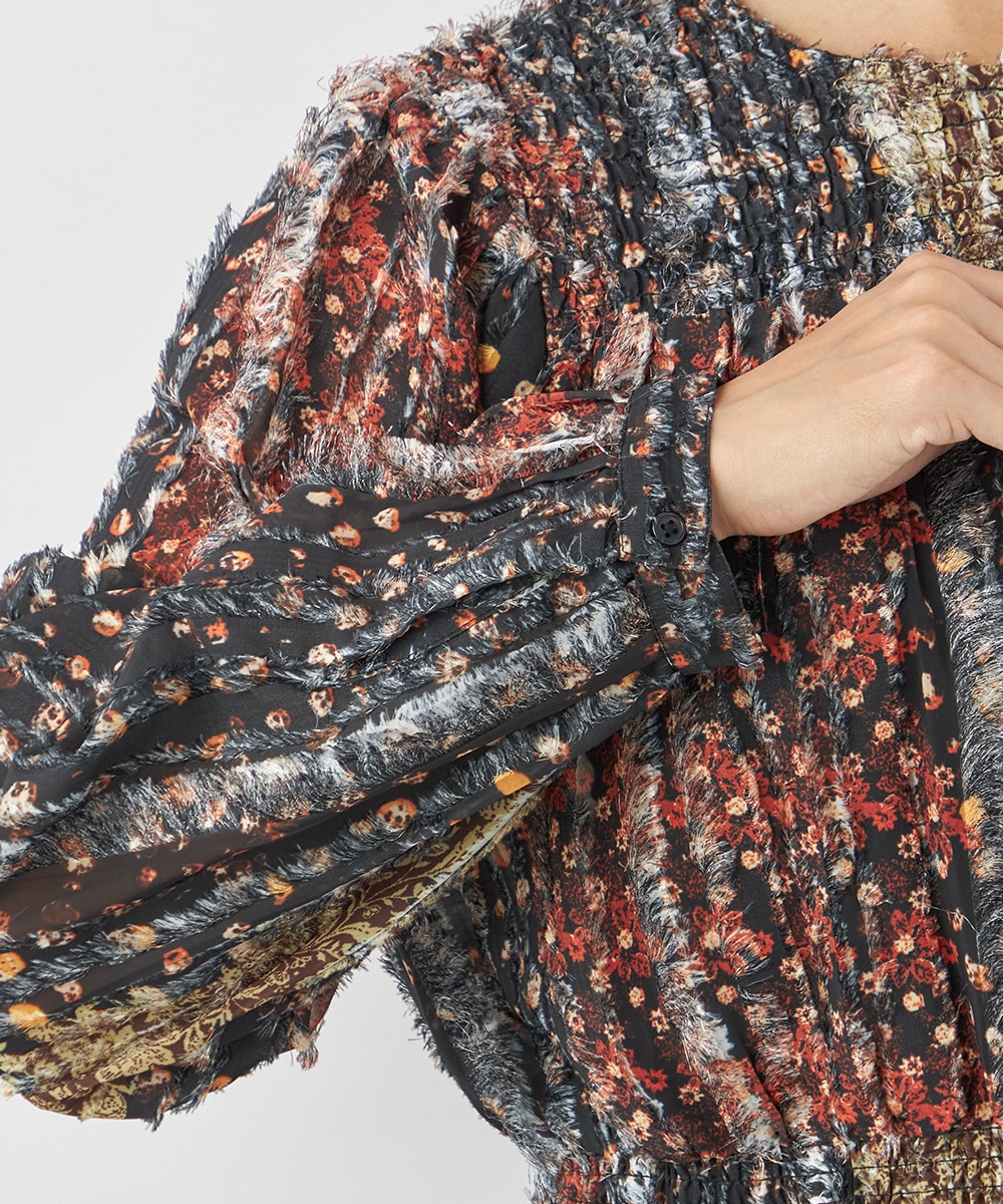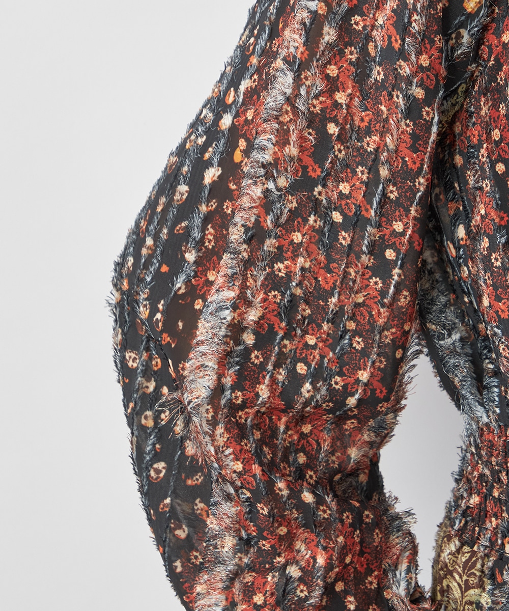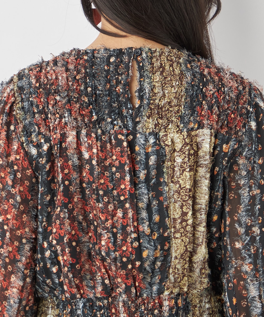 カラフルながらもシックにまとまった小花柄プリントを使用しており、大人可愛い印象の1枚です。コンパクトな丈感ですっきりと着こなせるのも特徴。裾のシャーリングによってスタイルのメリハリが強調されます。さまざまなボトムスと合わせやすく、幅広いアレンジが可能です。