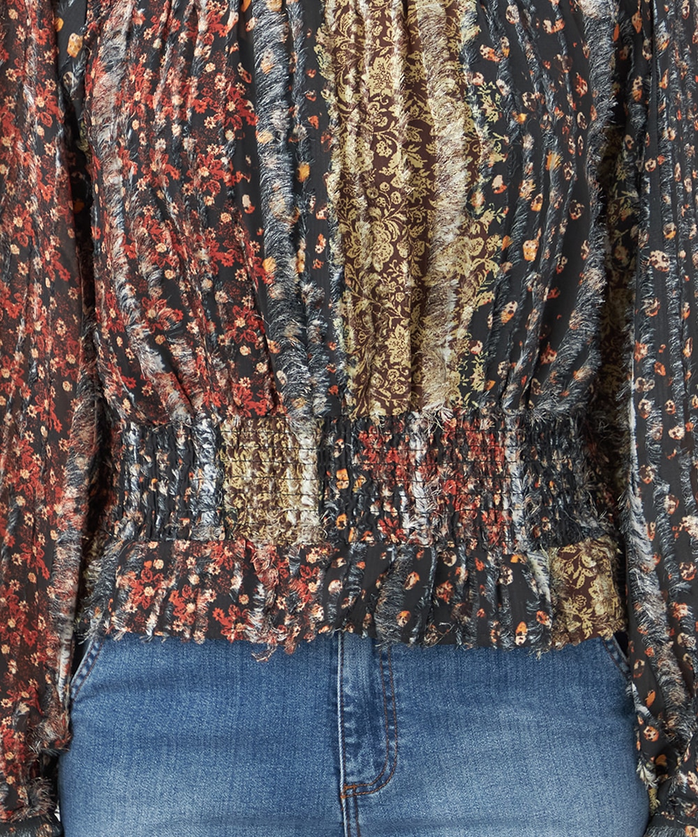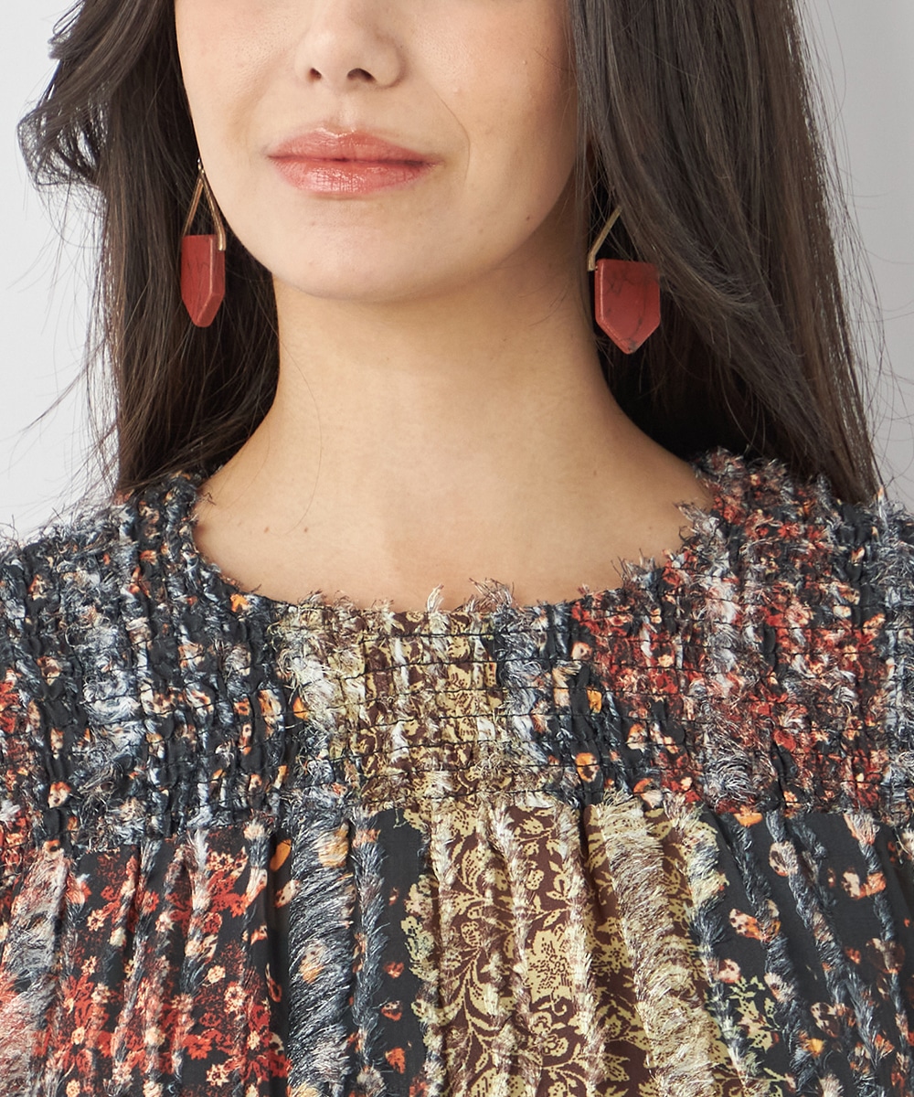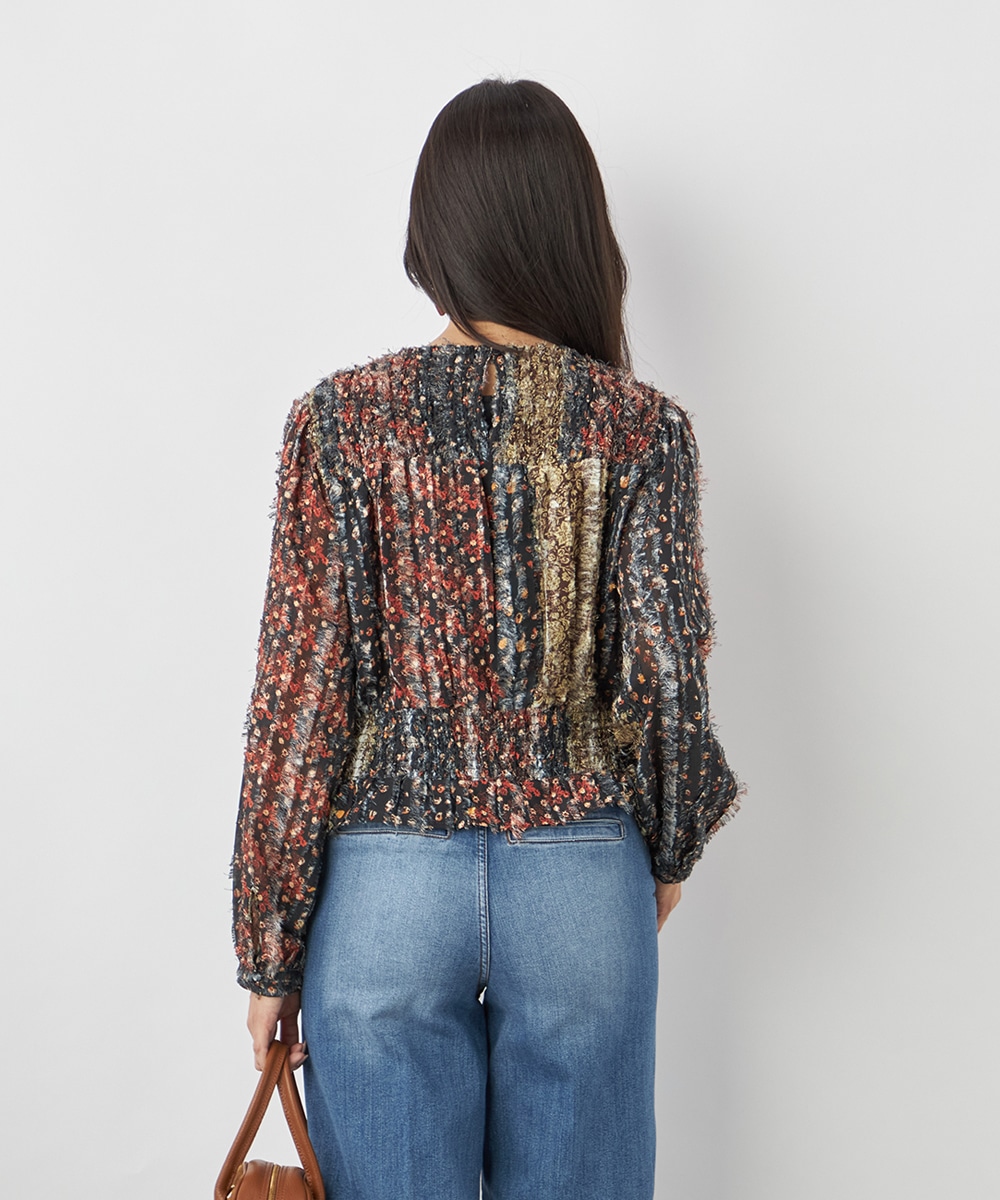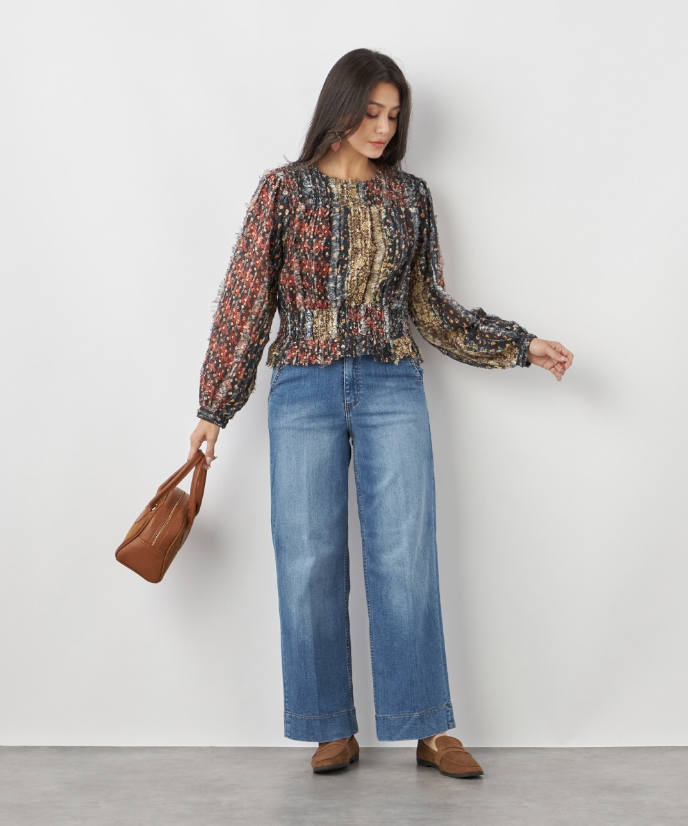 カラフルながらもシックにまとまった小花柄プリントを使用しており、大人可愛い印象の1枚です。コンパクトな丈感ですっきりと着こなせるのも特徴。裾のシャーリングによってスタイルのメリハリが強調されます。さまざまなボトムスと合わせやすく、幅広いアレンジが可能です。