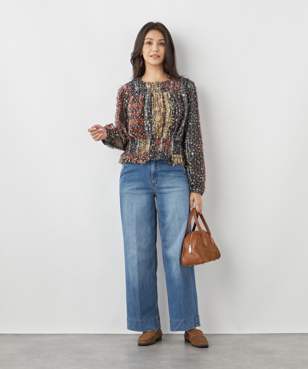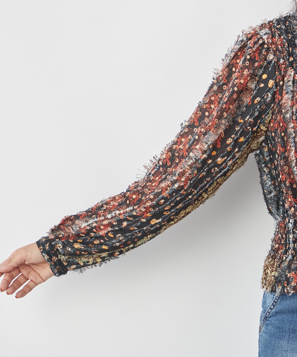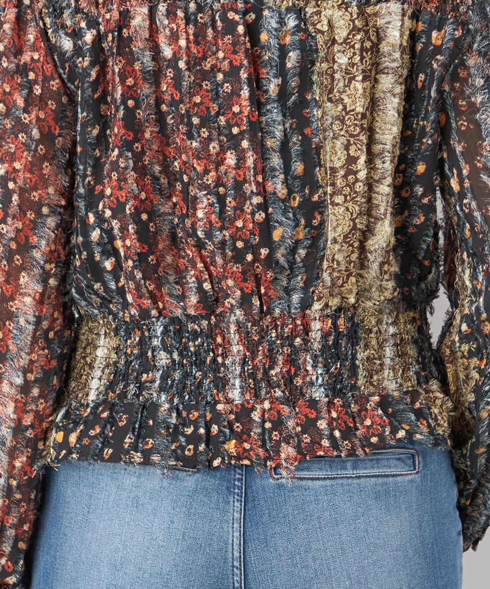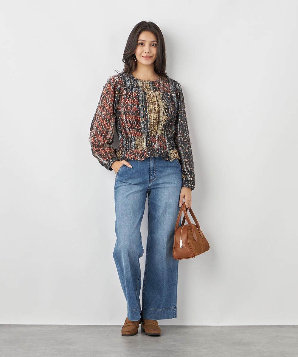 カラフルながらもシックにまとまった小花柄プリントを使用しており、大人可愛い印象の1枚です。コンパクトな丈感ですっきりと着こなせるのも特徴。裾のシャーリングによってスタイルのメリハリが強調されます。さまざまなボトムスと合わせやすく、幅広いアレンジが可能です。