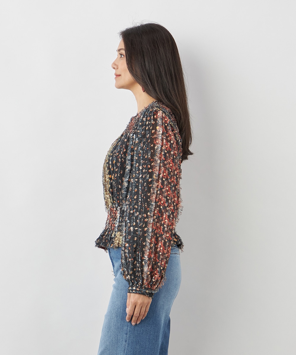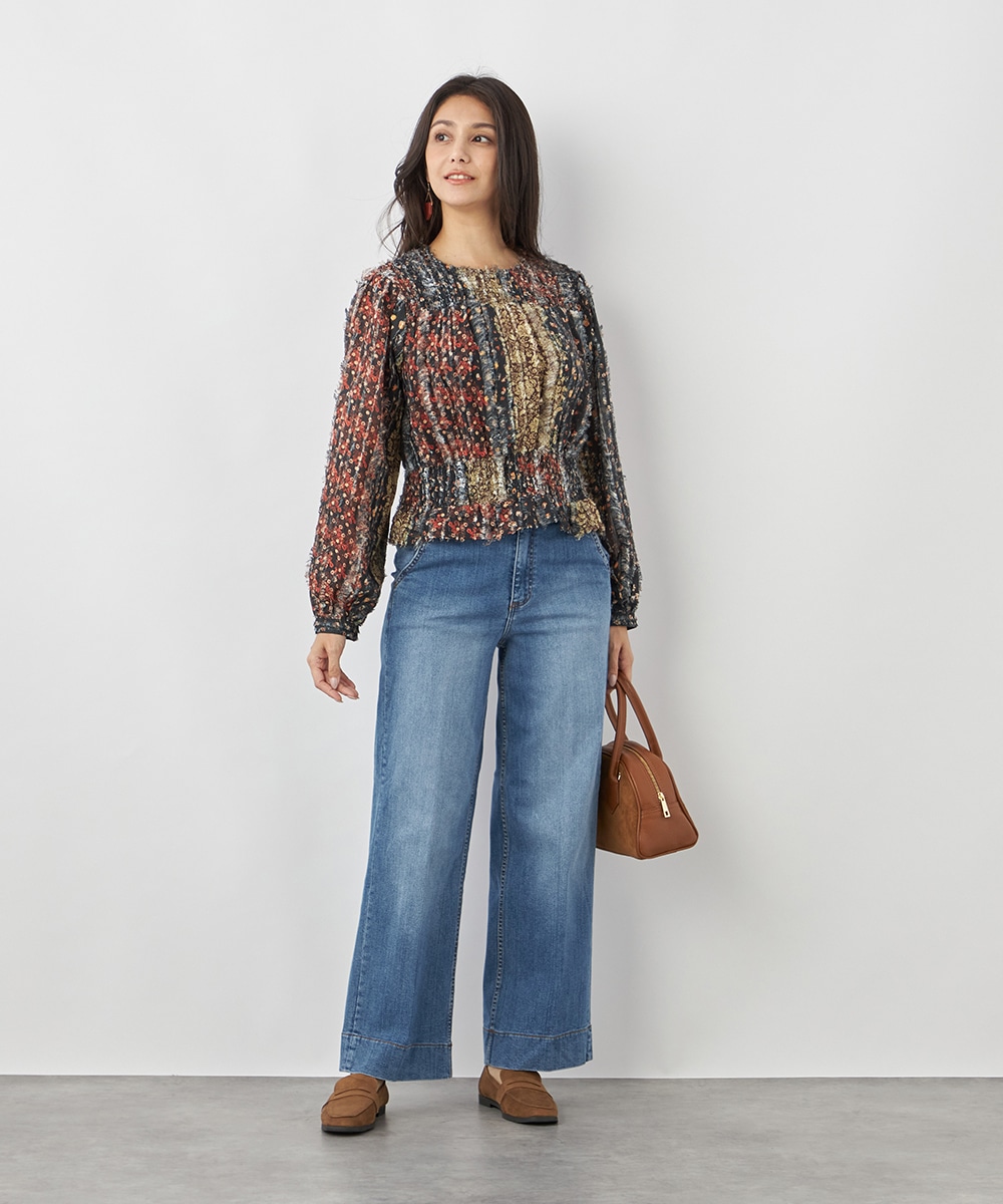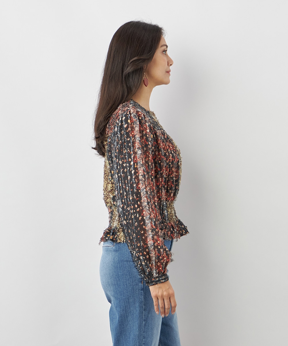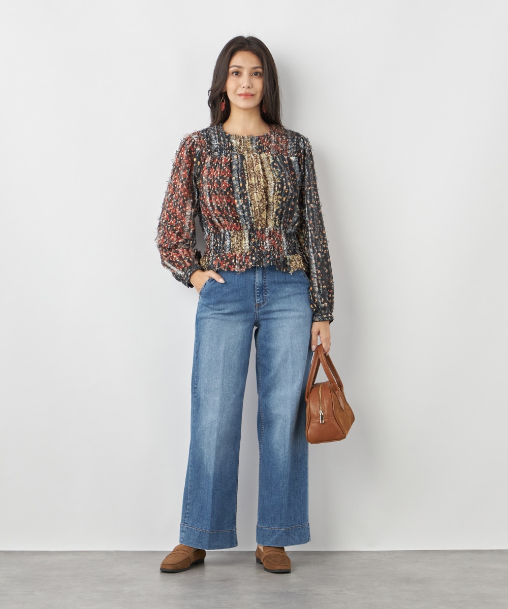 カラフルながらもシックにまとまった小花柄プリントを使用しており、大人可愛い印象の1枚です。コンパクトな丈感ですっきりと着こなせるのも特徴。裾のシャーリングによってスタイルのメリハリが強調されます。さまざまなボトムスと合わせやすく、幅広いアレンジが可能です。