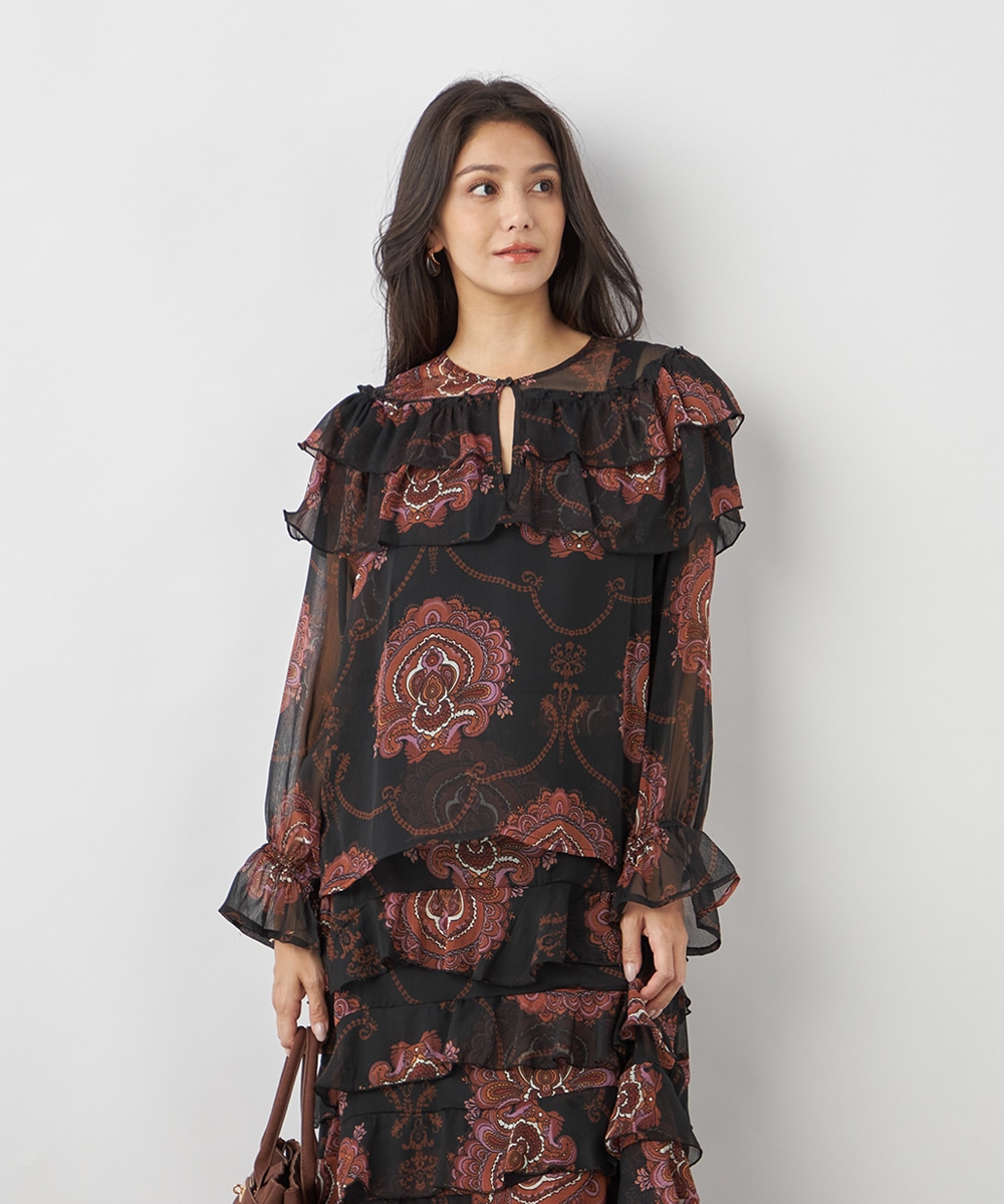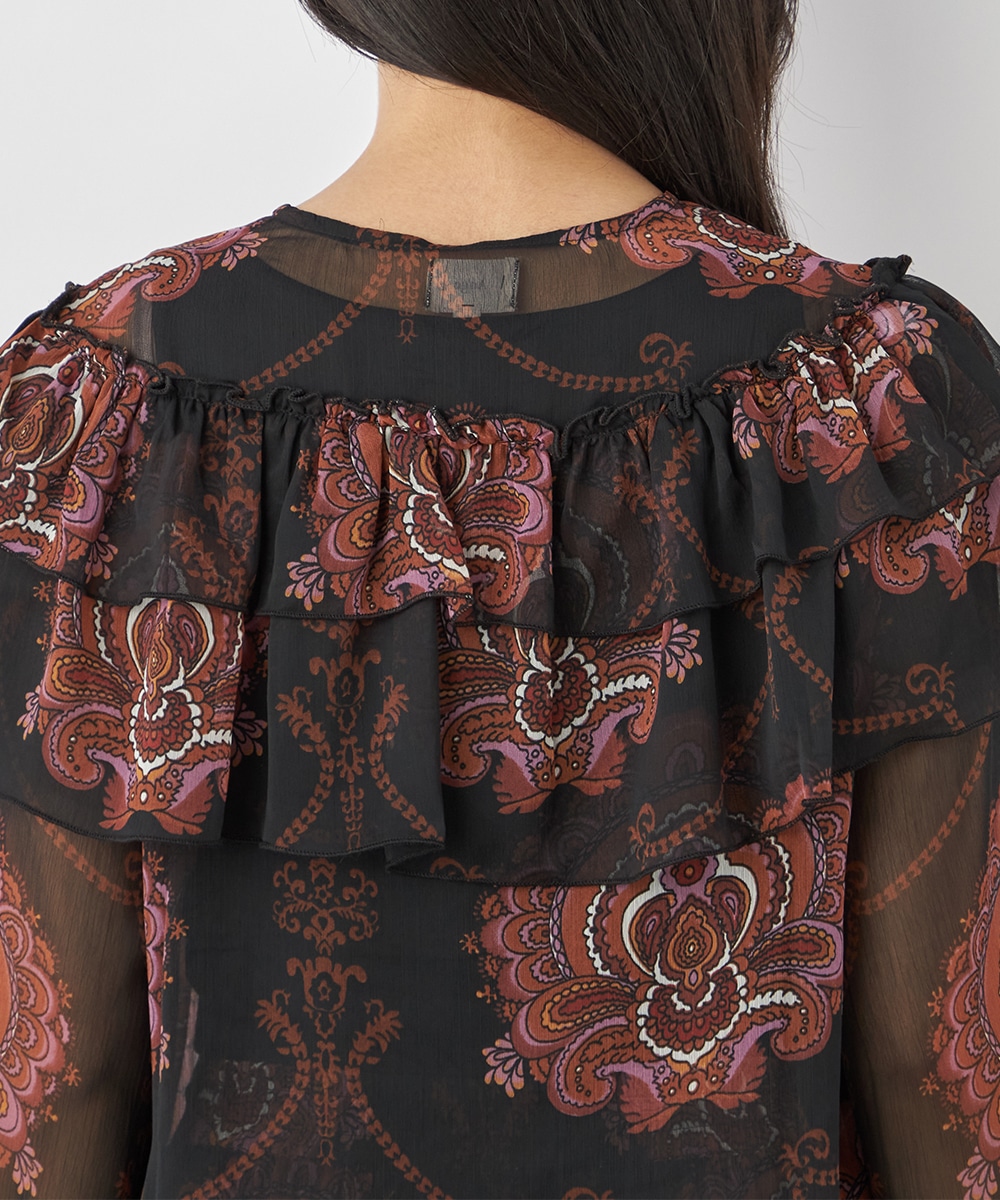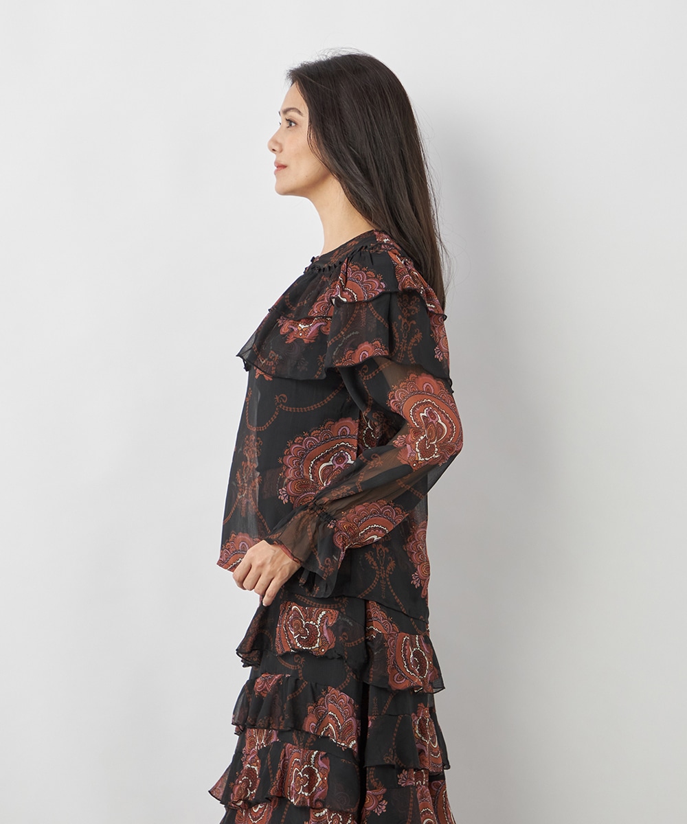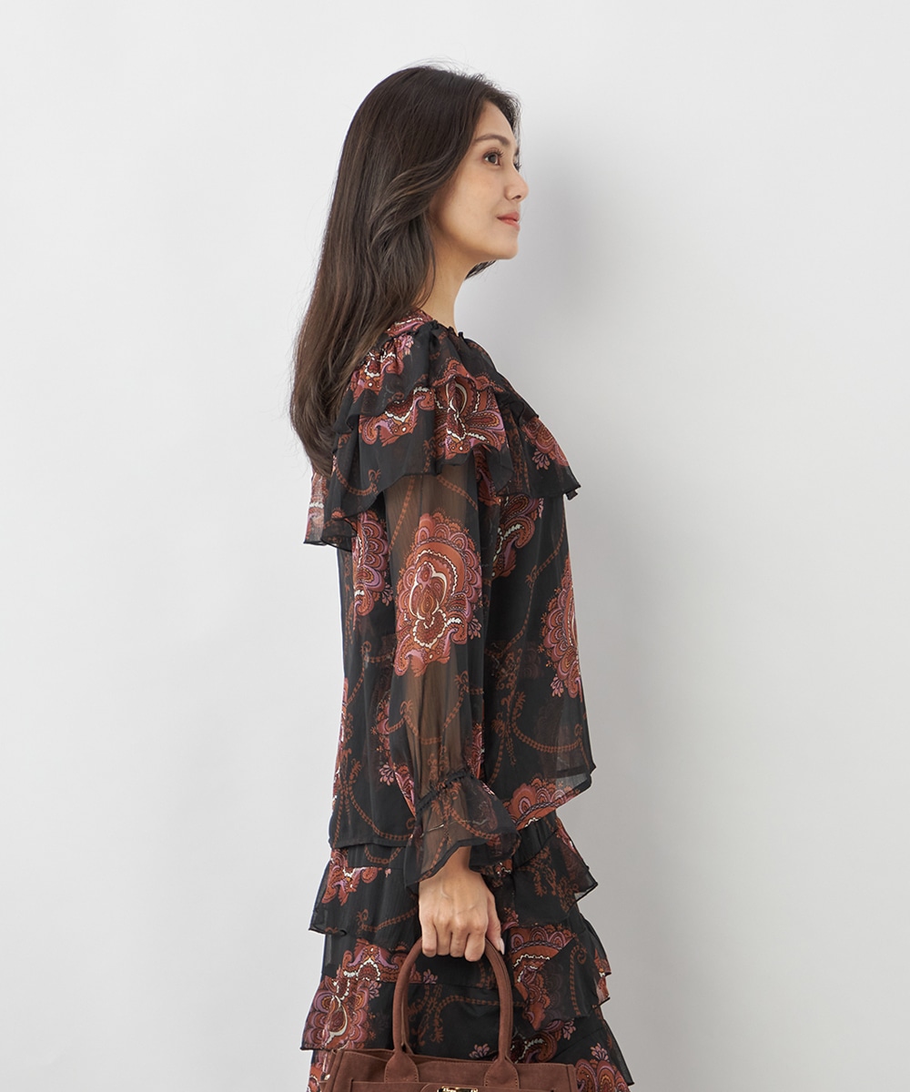 たっぷりのフリルをあしらい、華やかさのあるルックに仕上げました。生地には繊細な透け感が見られ、印象が重くならずに着こなせます。ブラックをベースにしたシックなカラーリングも魅力。ネックの深めのスリットがアクセントとして有効です。同素材のスカートもございます。