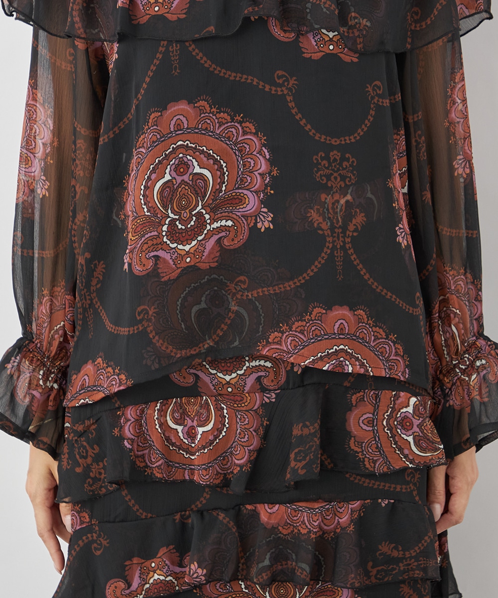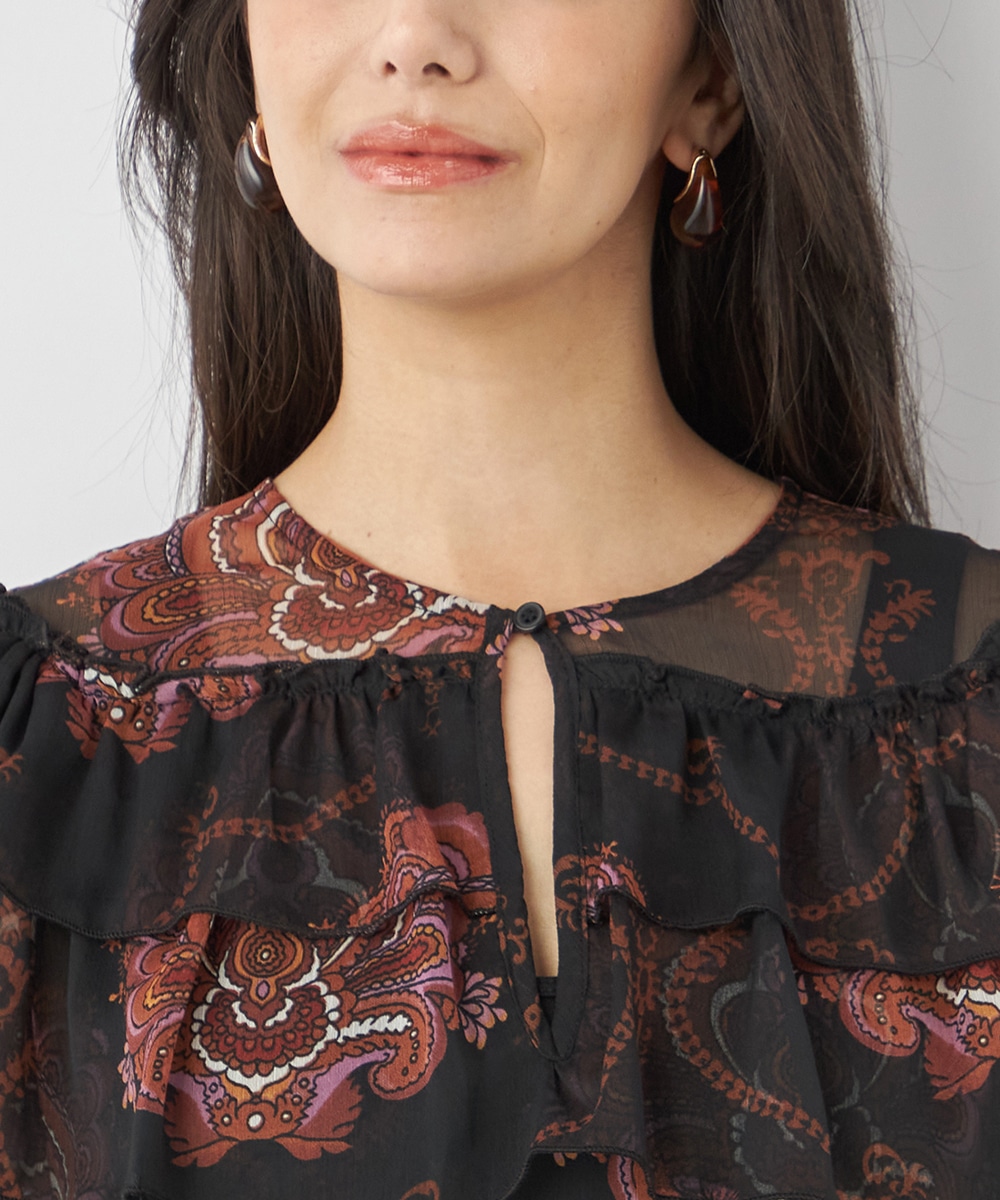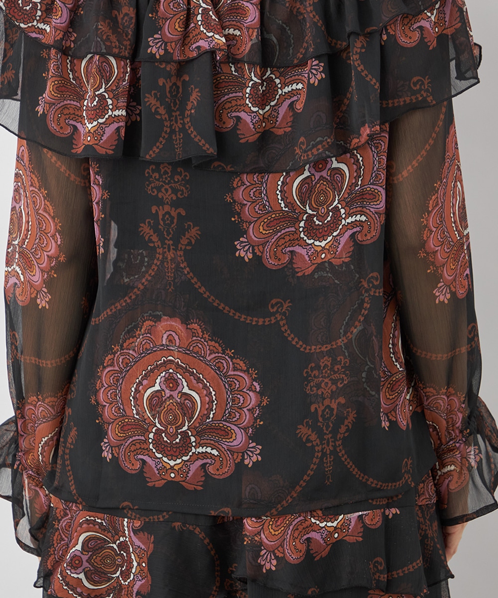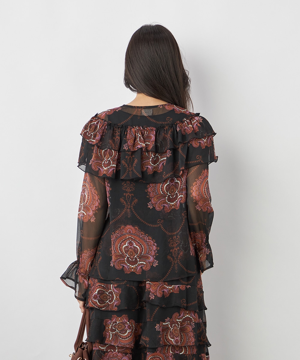 たっぷりのフリルをあしらい、華やかさのあるルックに仕上げました。生地には繊細な透け感が見られ、印象が重くならずに着こなせます。ブラックをベースにしたシックなカラーリングも魅力。ネックの深めのスリットがアクセントとして有効です。同素材のスカートもございます。