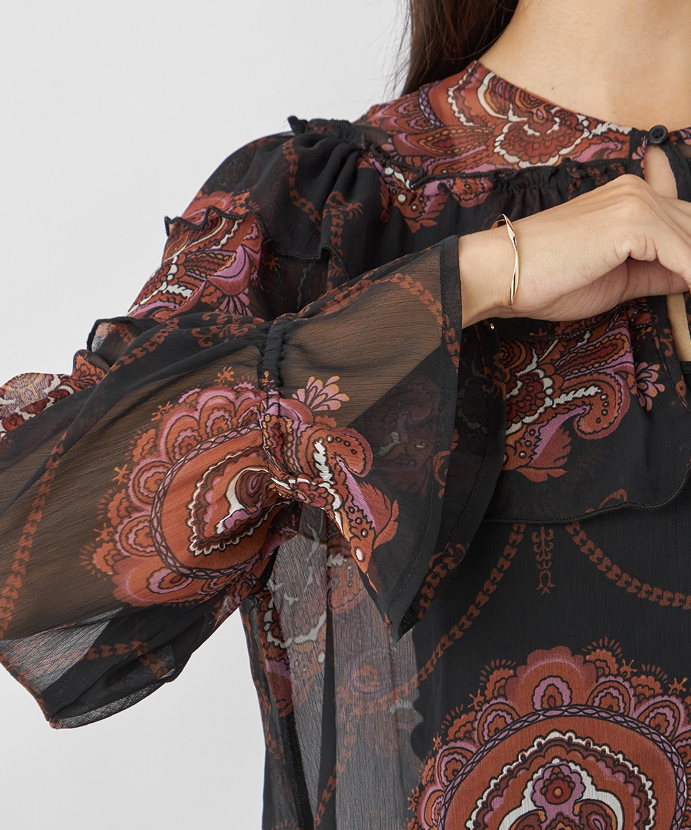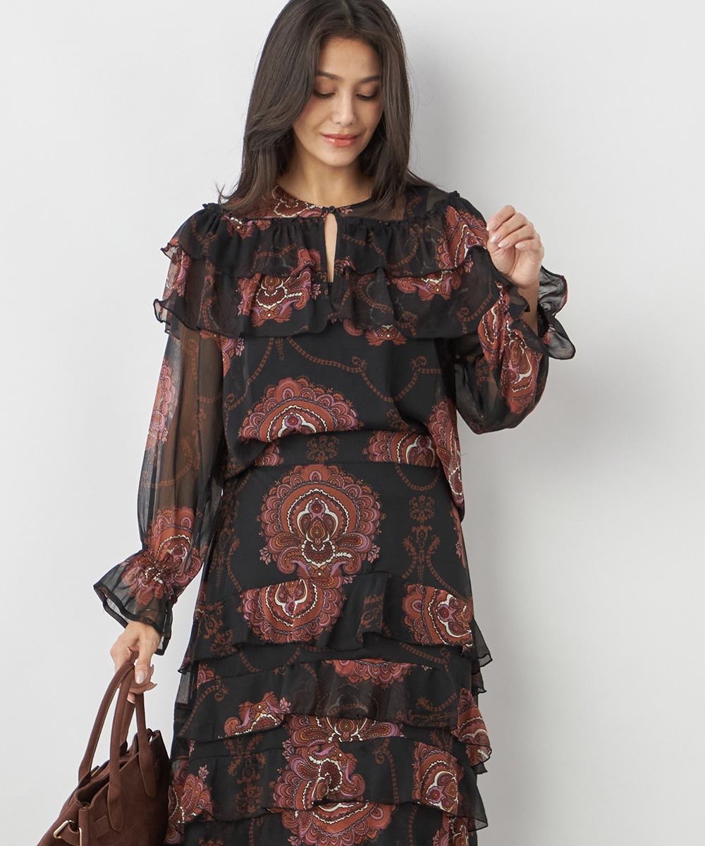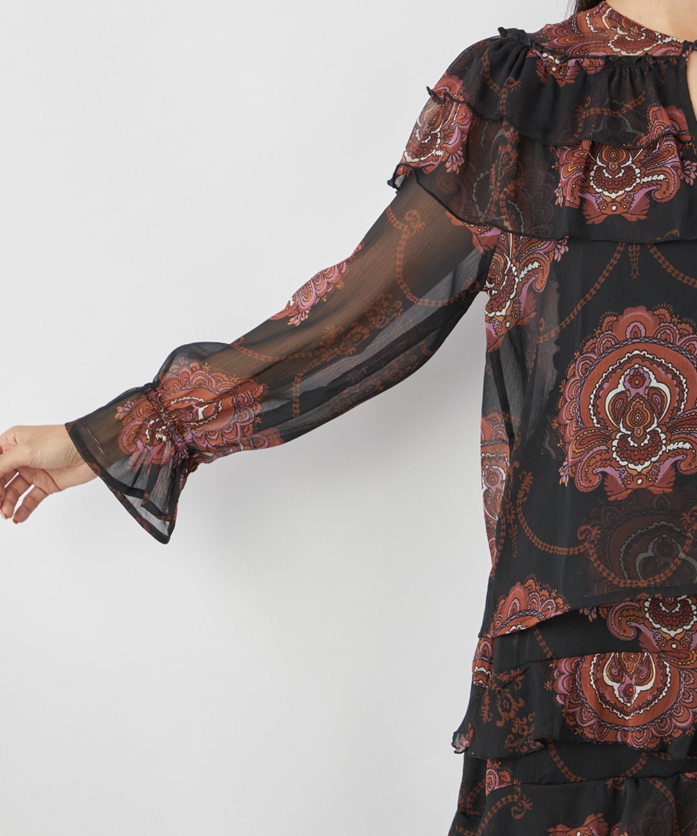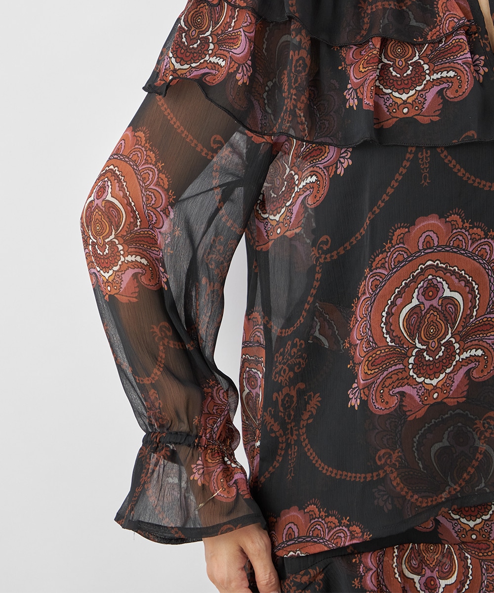 たっぷりのフリルをあしらい、華やかさのあるルックに仕上げました。生地には繊細な透け感が見られ、印象が重くならずに着こなせます。ブラックをベースにしたシックなカラーリングも魅力。ネックの深めのスリットがアクセントとして有効です。同素材のスカートもございます。