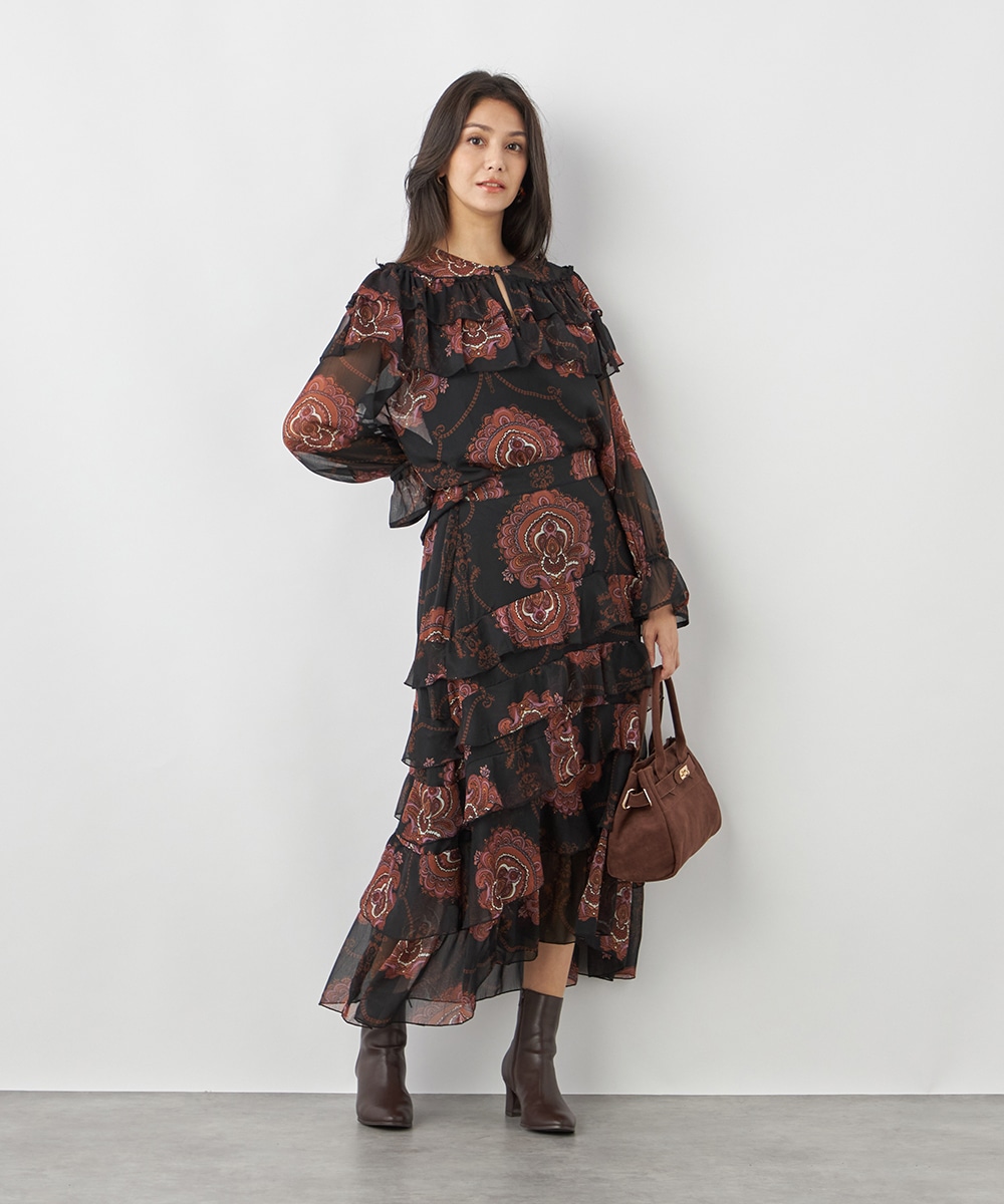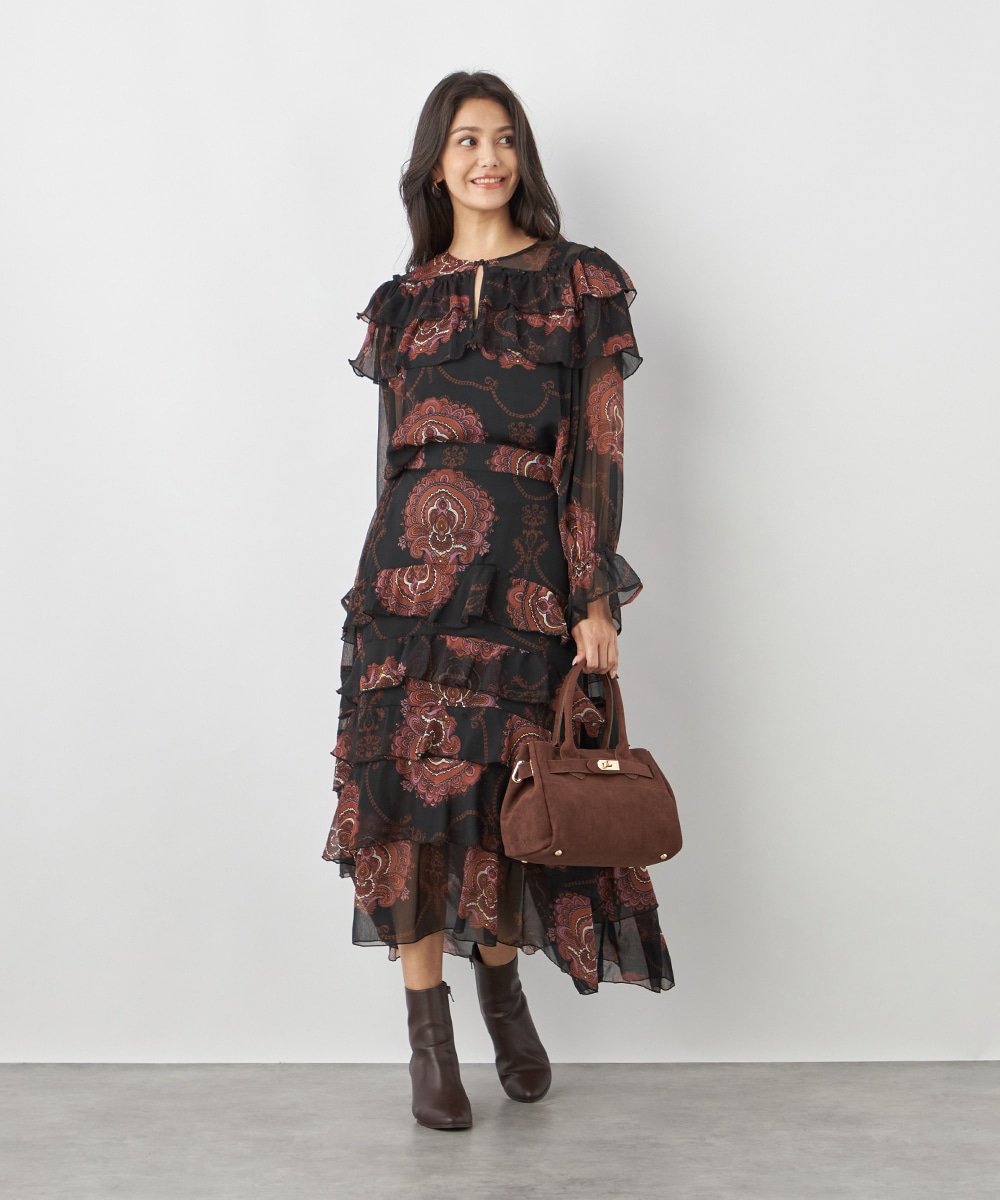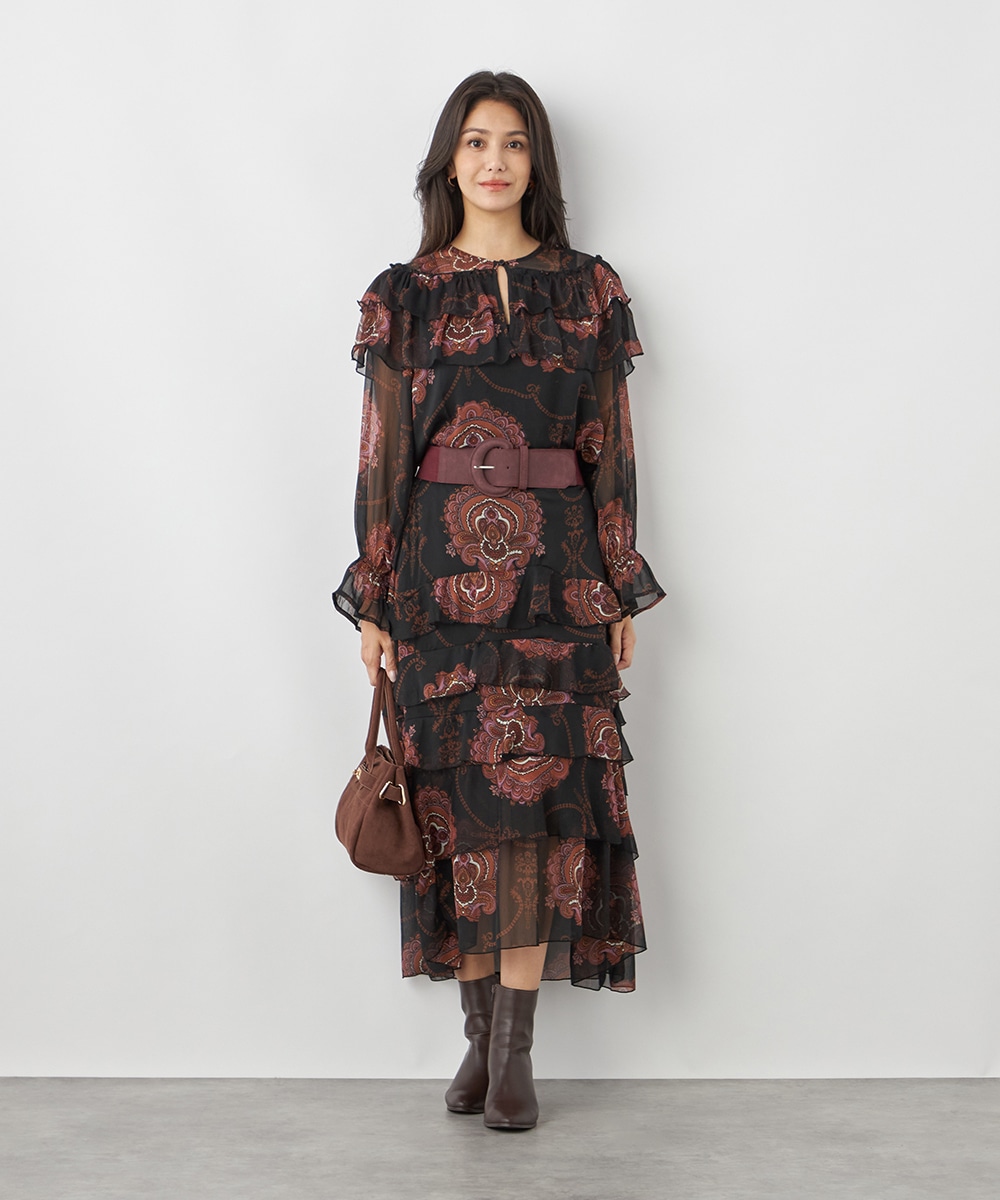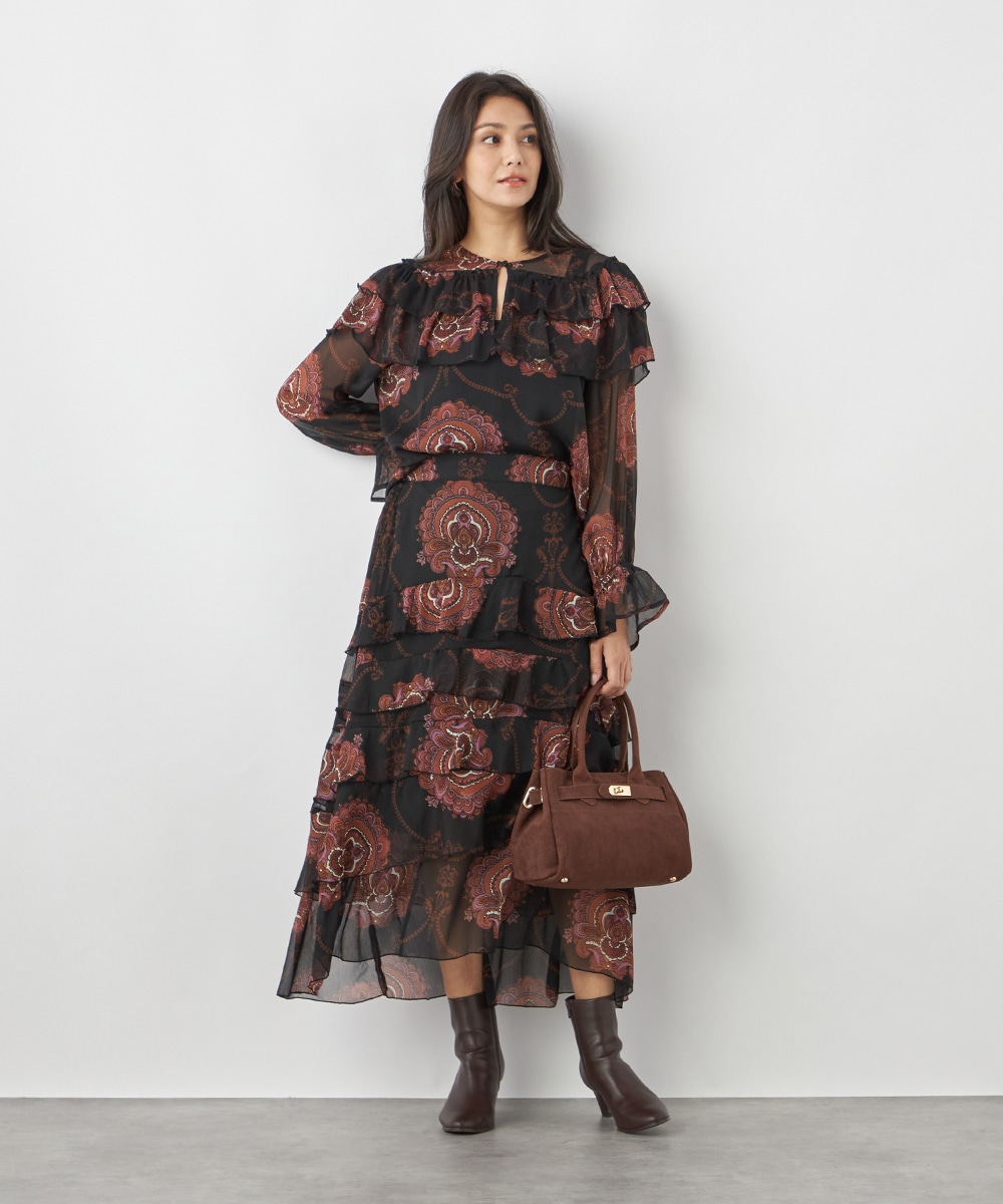 たっぷりのフリルをあしらい、華やかさのあるルックに仕上げました。生地には繊細な透け感が見られ、印象が重くならずに着こなせます。ブラックをベースにしたシックなカラーリングも魅力。ネックの深めのスリットがアクセントとして有効です。同素材のスカートもございます。
