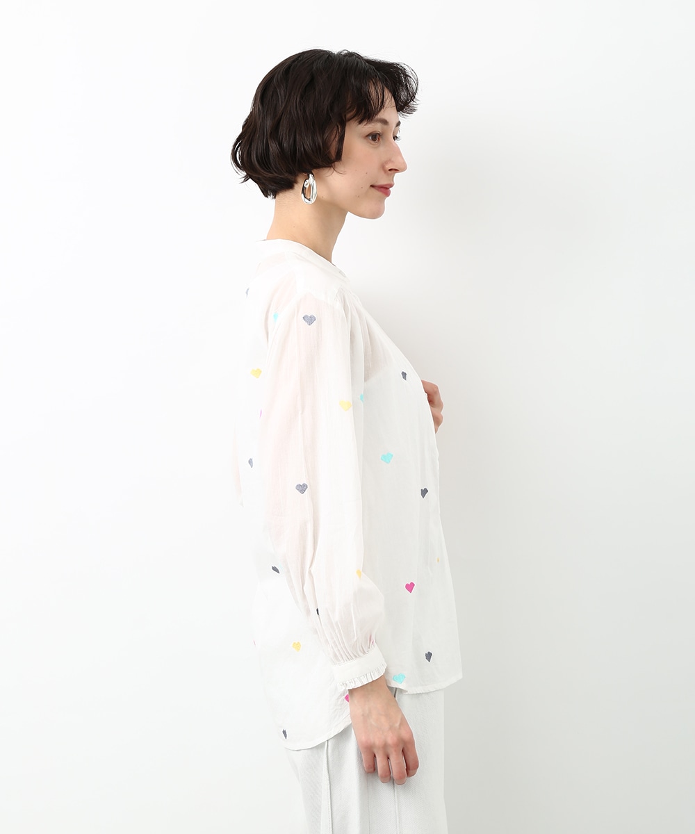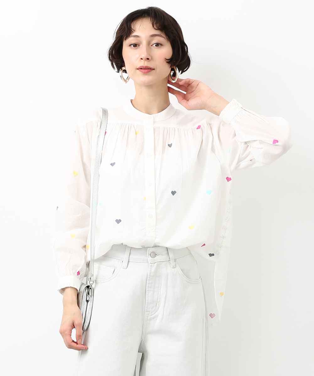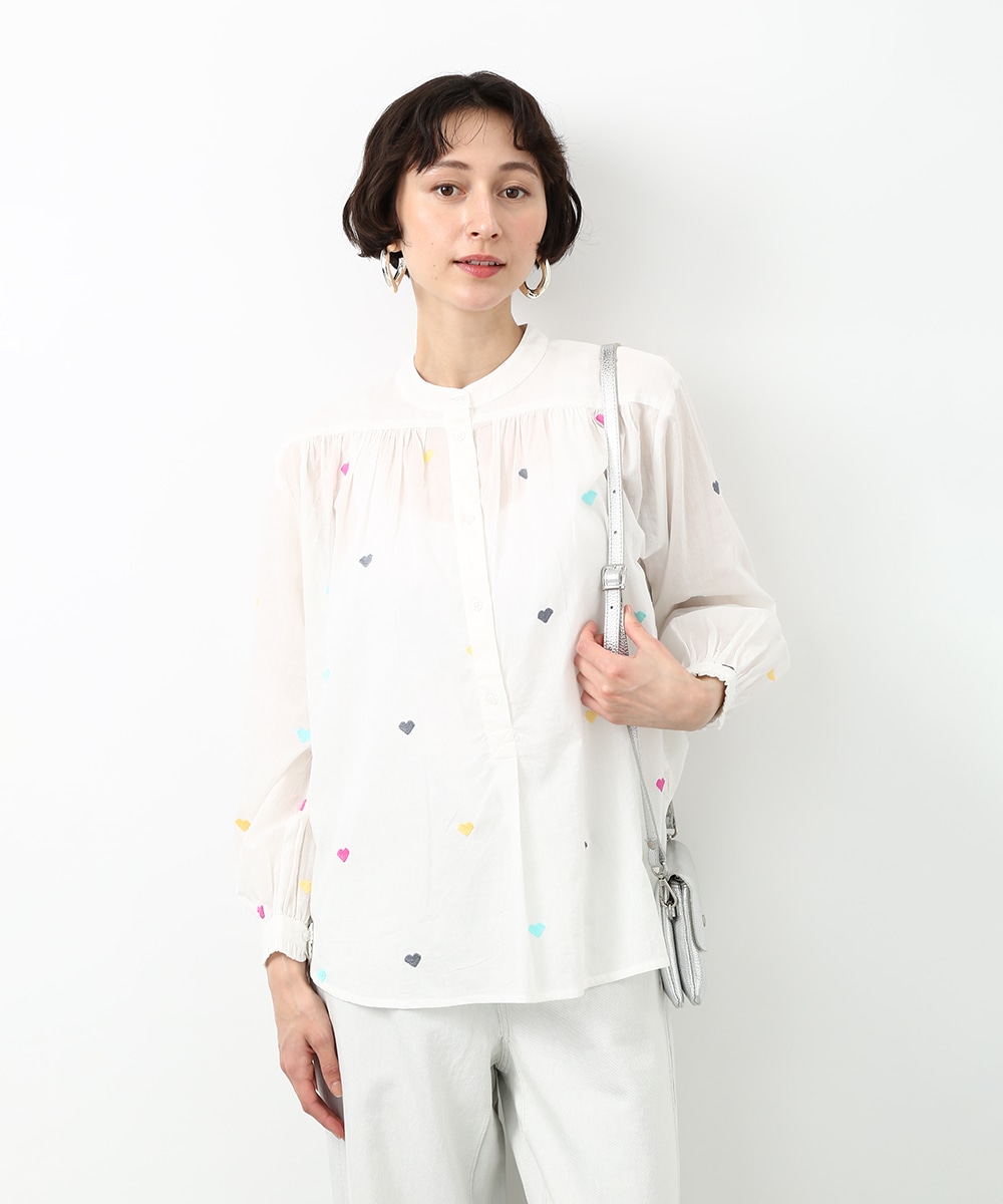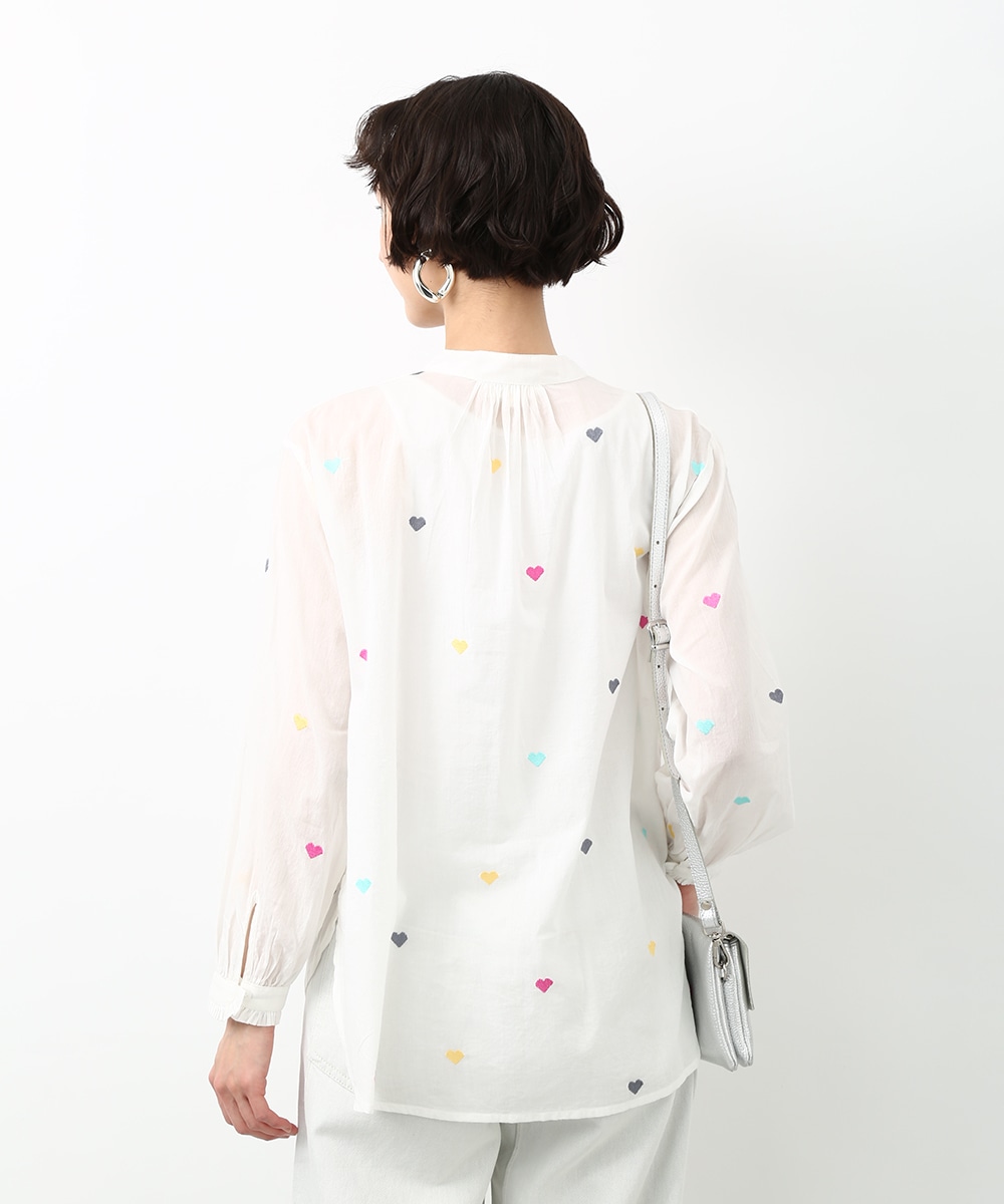 カラフルなハートモチーフの刺繍が目を引くコットンブラウス。ほんのり透け感のある素材で軽やかに着られ、子供っぽくなりすぎないのもポイント。やわらかなシルエットで自然に馴染みます。ワイドパンツを穿いてリラックス感のあるバランスに仕上げた着こなしもおすすめです。