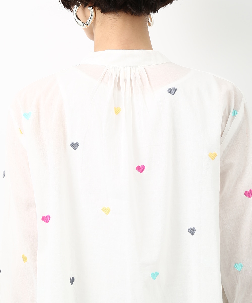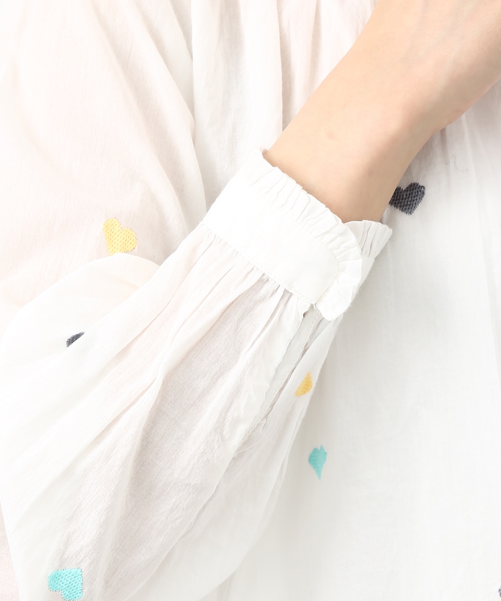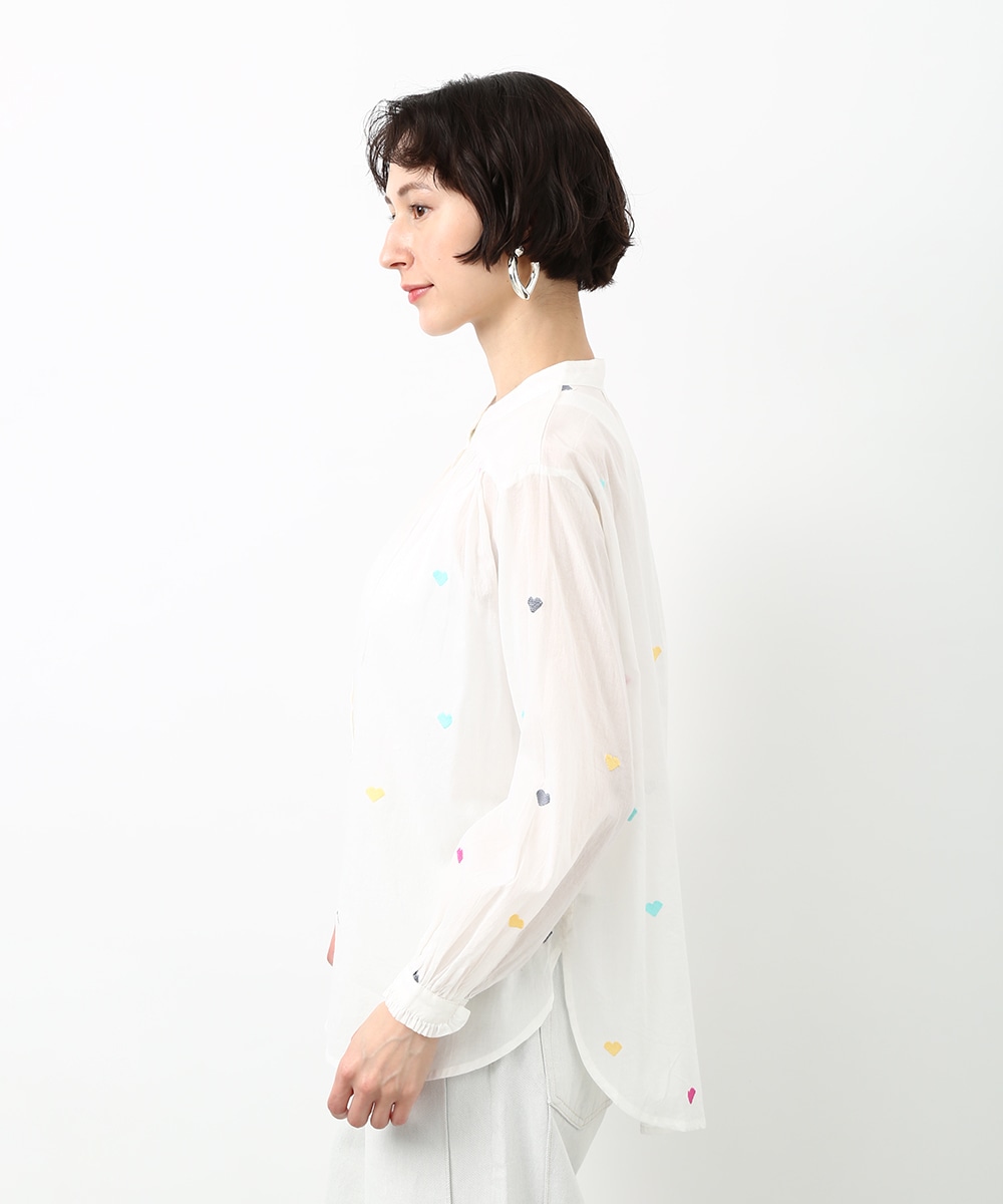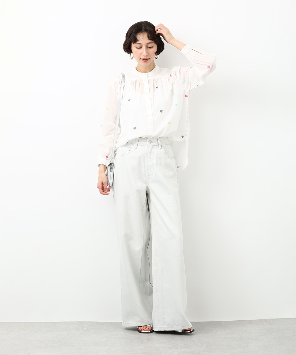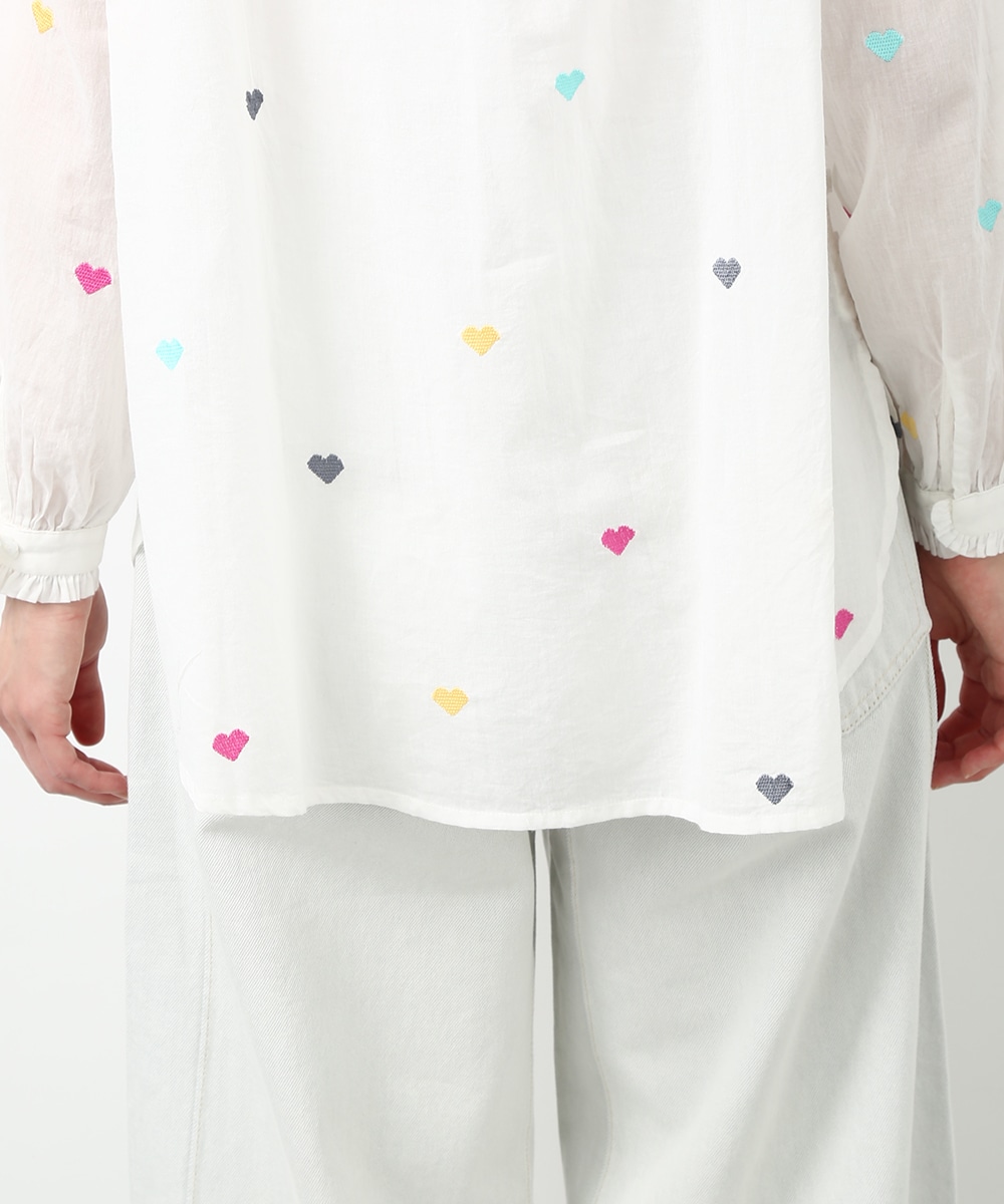 カラフルなハートモチーフの刺繍が目を引くコットンブラウス。ほんのり透け感のある素材で軽やかに着られ、子供っぽくなりすぎないのもポイント。やわらかなシルエットで自然に馴染みます。ワイドパンツを穿いてリラックス感のあるバランスに仕上げた着こなしもおすすめです。
