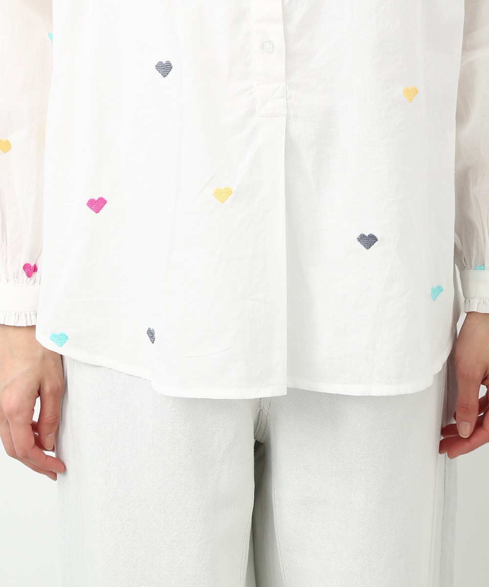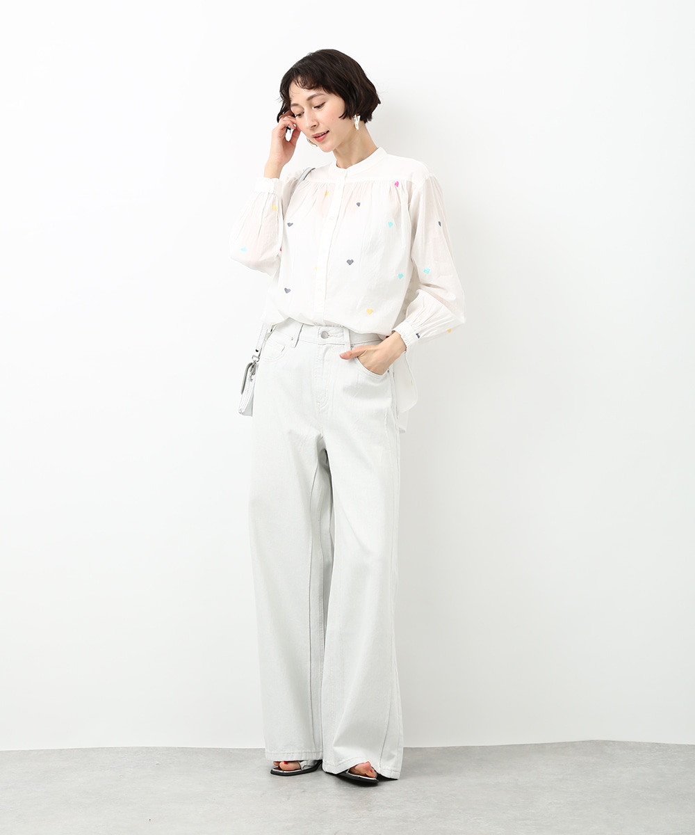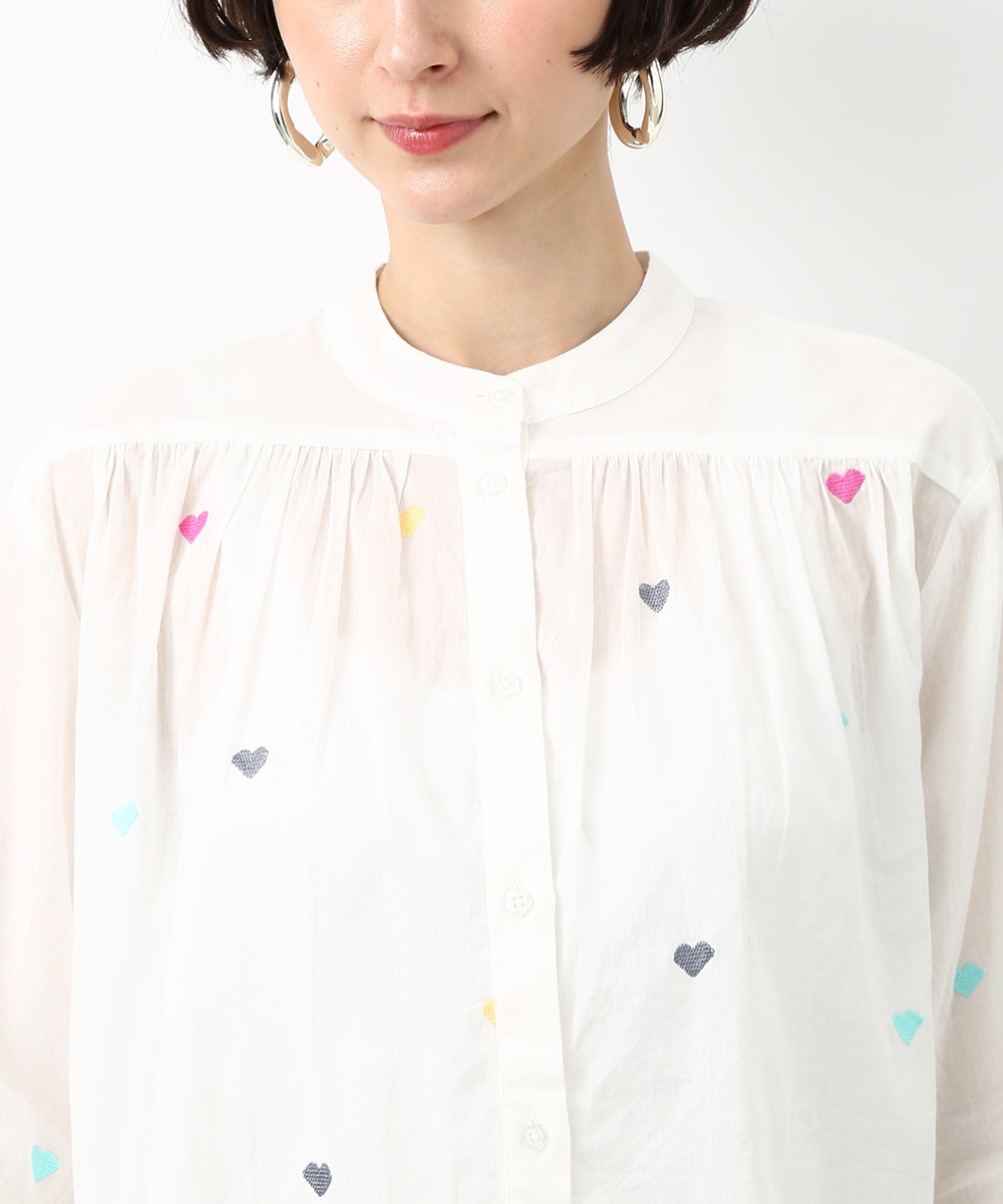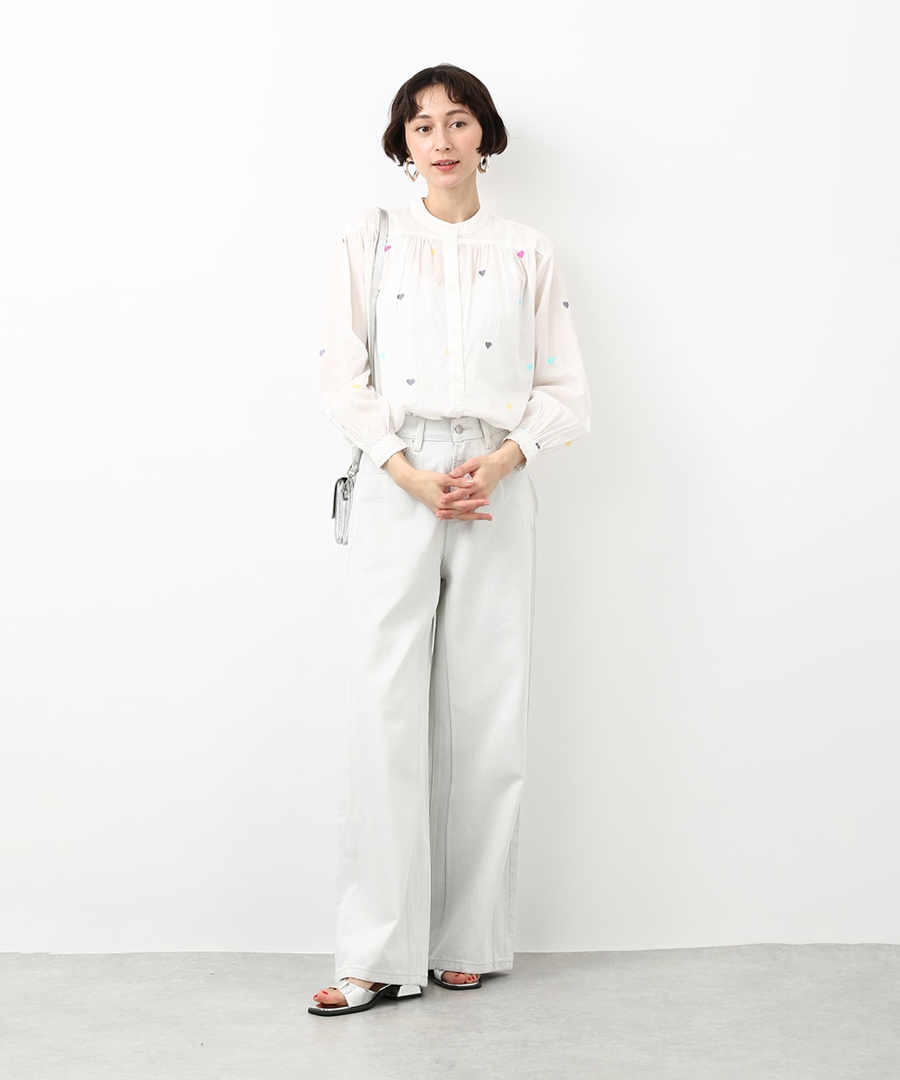 カラフルなハートモチーフの刺繍が目を引くコットンブラウス。ほんのり透け感のある素材で軽やかに着られ、子供っぽくなりすぎないのもポイント。やわらかなシルエットで自然に馴染みます。ワイドパンツを穿いてリラックス感のあるバランスに仕上げた着こなしもおすすめです。