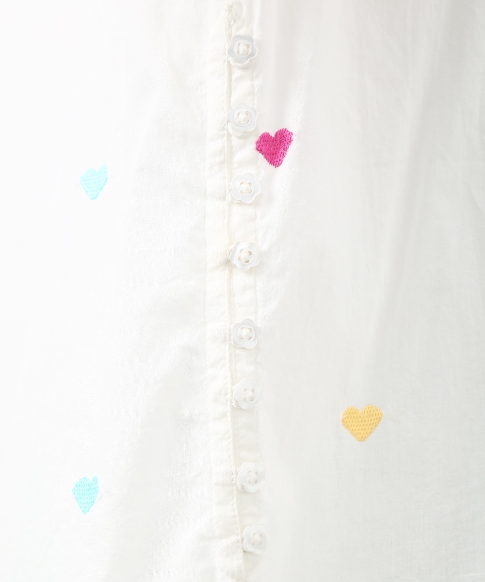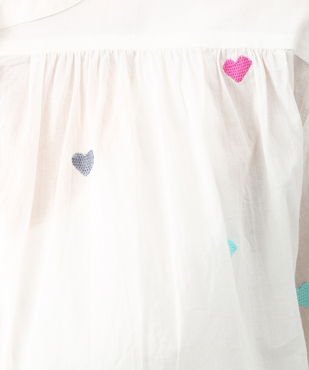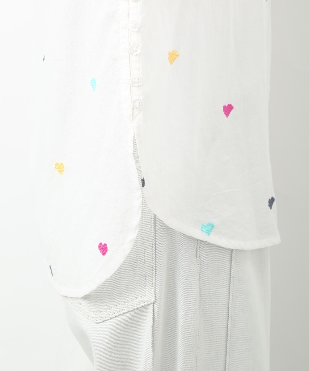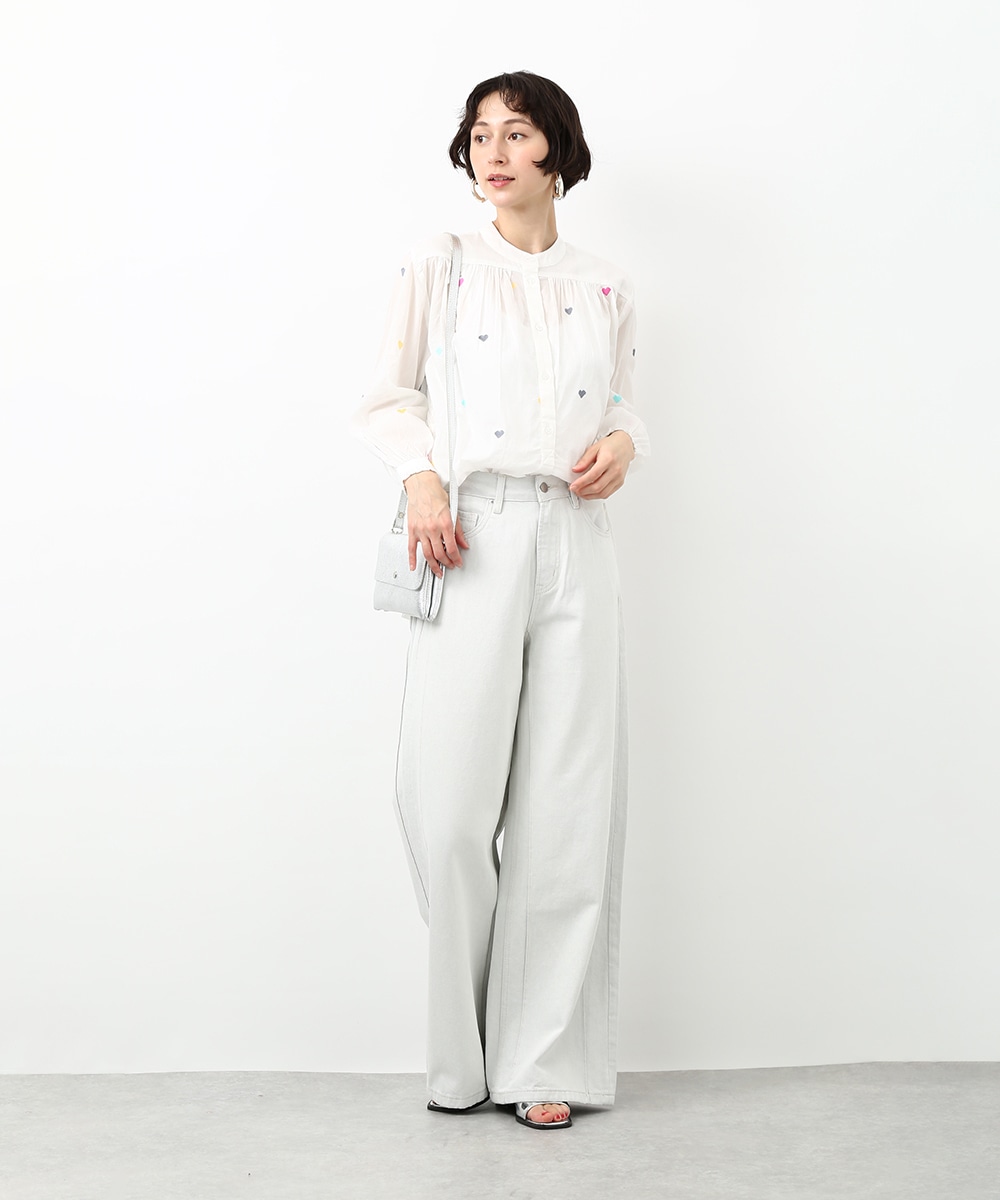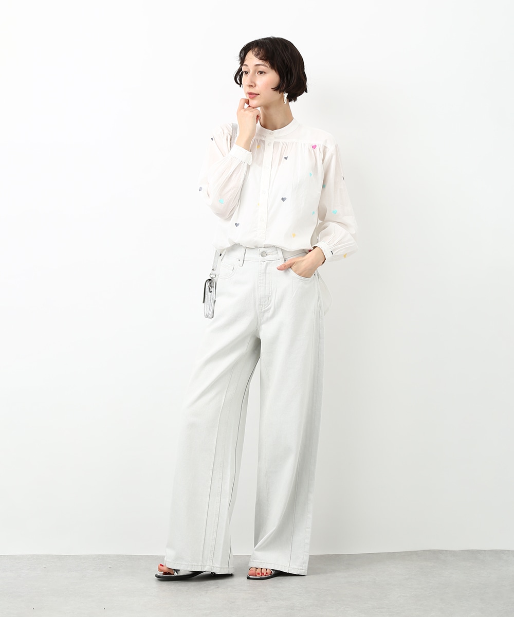 カラフルなハートモチーフの刺繍が目を引くコットンブラウス。ほんのり透け感のある素材で軽やかに着られ、子供っぽくなりすぎないのもポイント。やわらかなシルエットで自然に馴染みます。ワイドパンツを穿いてリラックス感のあるバランスに仕上げた着こなしもおすすめです。