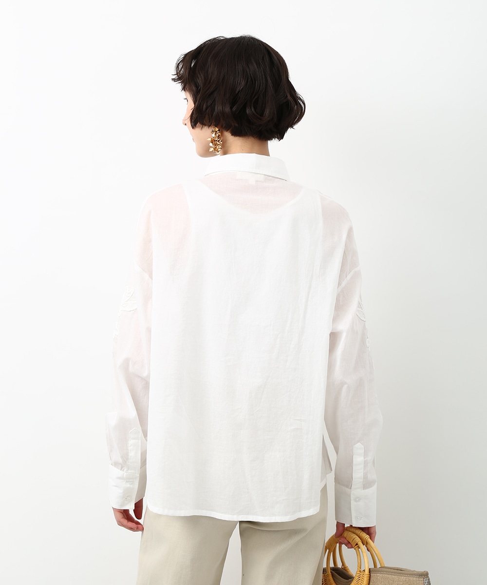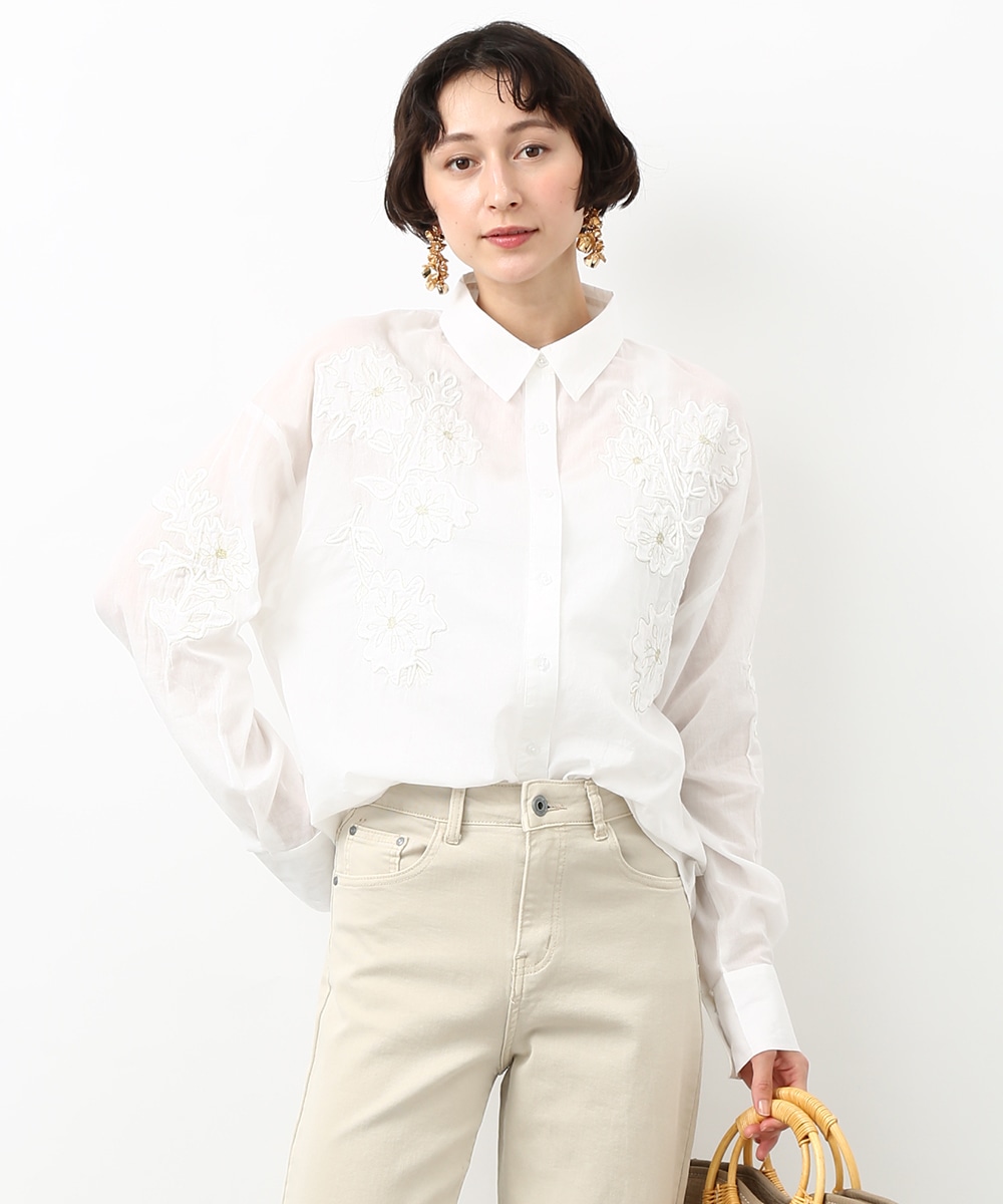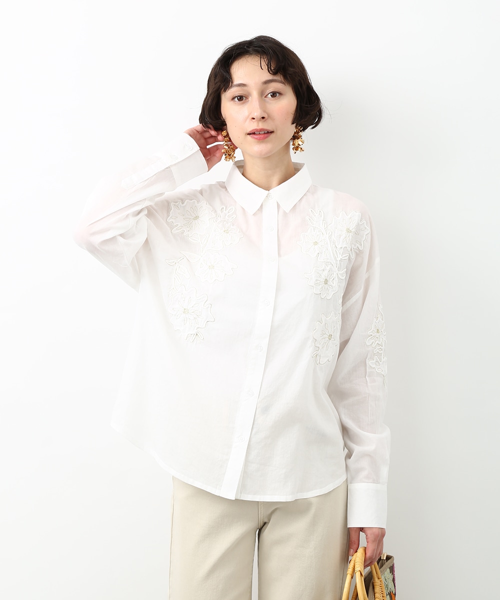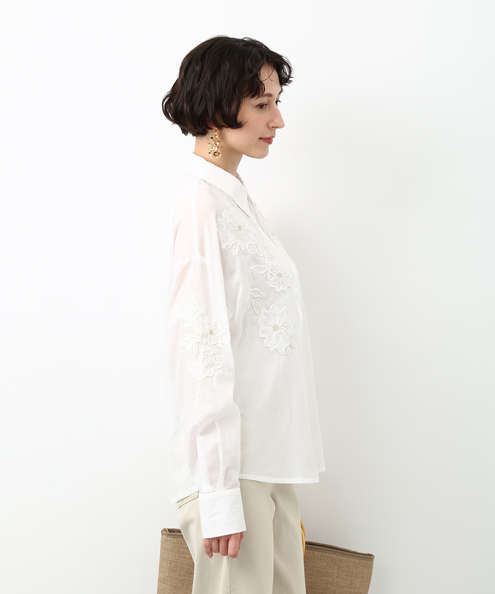 フラワーモチーフのパッチワークが印象的な白シャツ。すっきりとしたシルエットで取り入れやすく、クリーンな印象で着られるのもポイント。デニムやワイドパンツを穿いてラフにまとめた、モチーフを引き立てる着こなしもおすすめです。羽織りとしても取り入れやすく、スタイリングの幅が広がる1着です。
