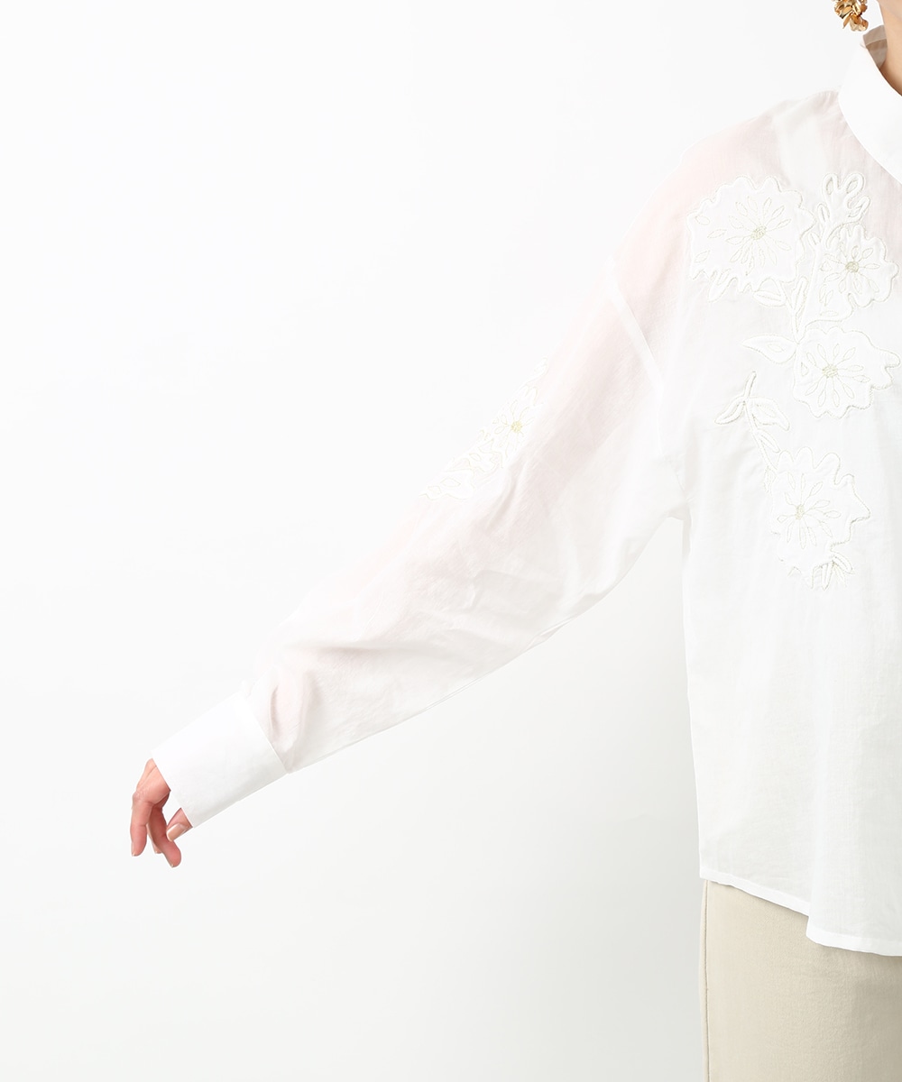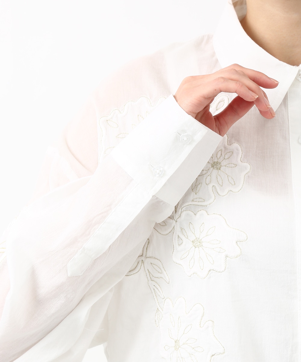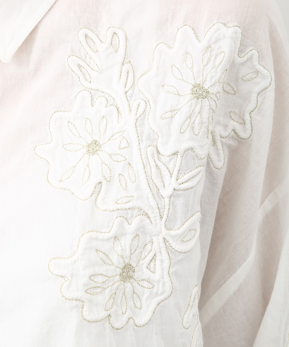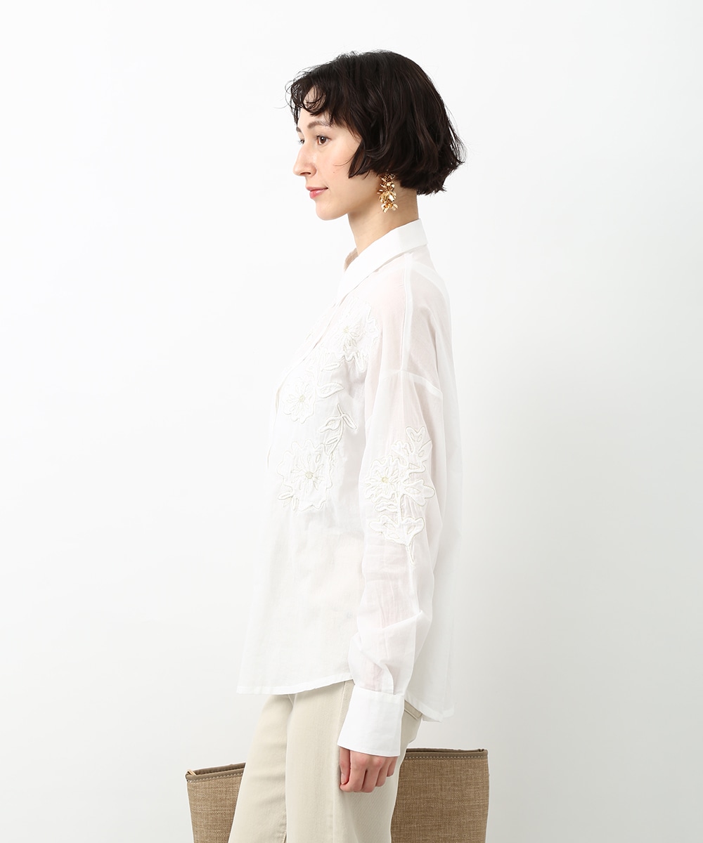 フラワーモチーフのパッチワークが印象的な白シャツ。すっきりとしたシルエットで取り入れやすく、クリーンな印象で着られるのもポイント。デニムやワイドパンツを穿いてラフにまとめた、モチーフを引き立てる着こなしもおすすめです。羽織りとしても取り入れやすく、スタイリングの幅が広がる1着です。