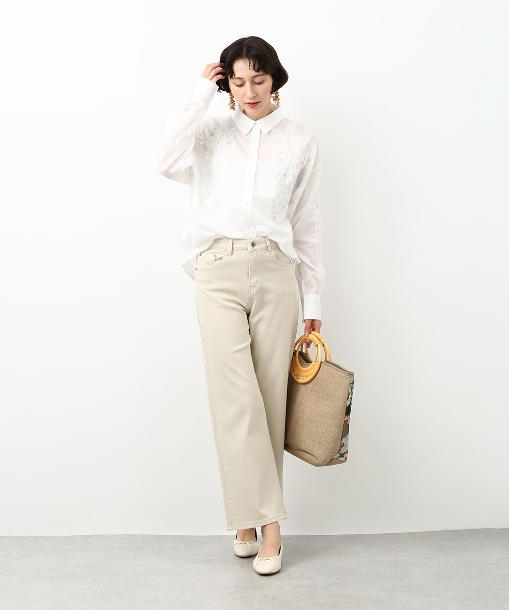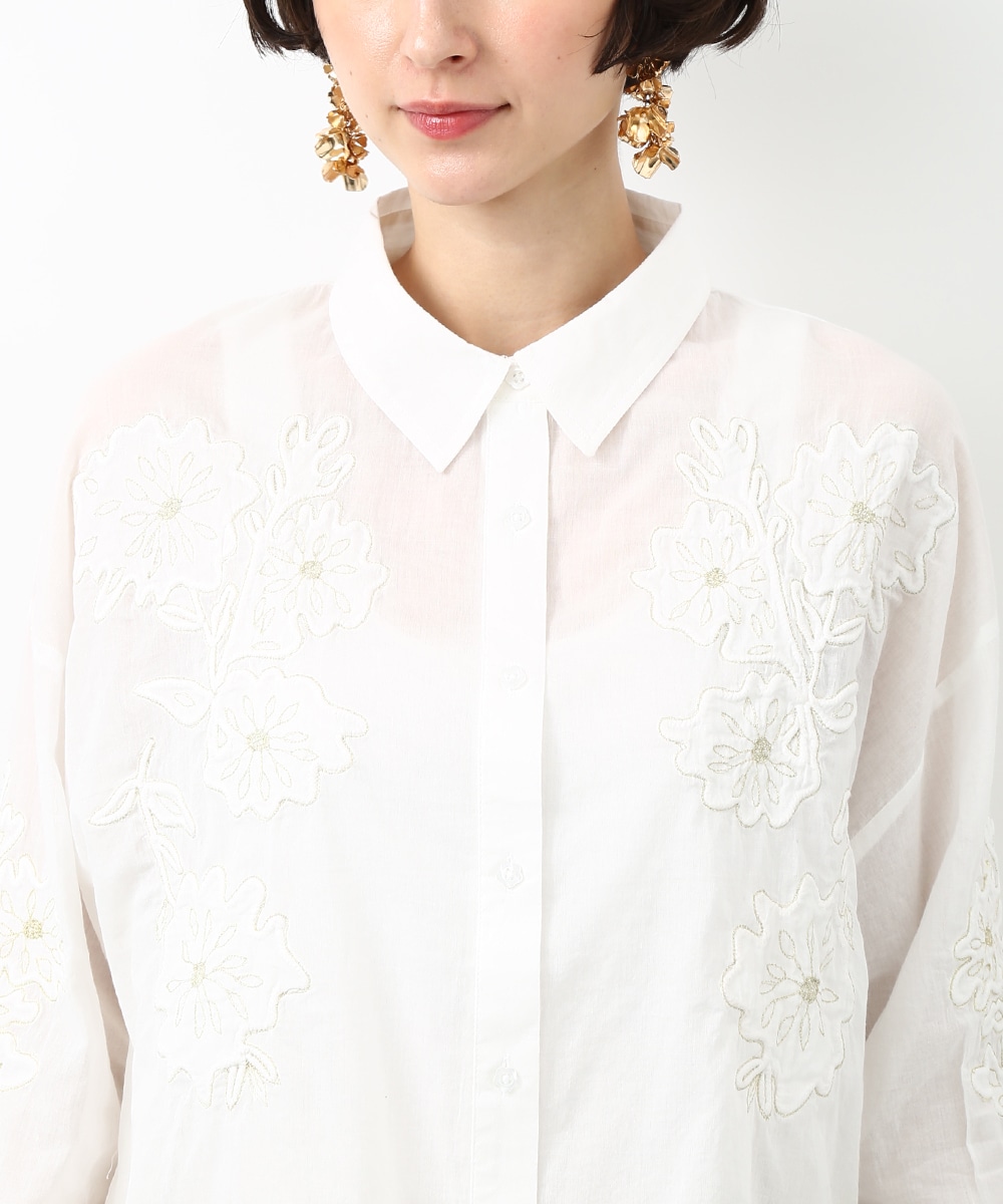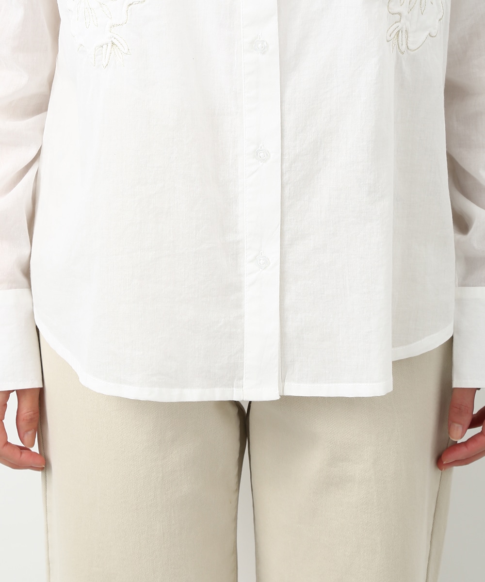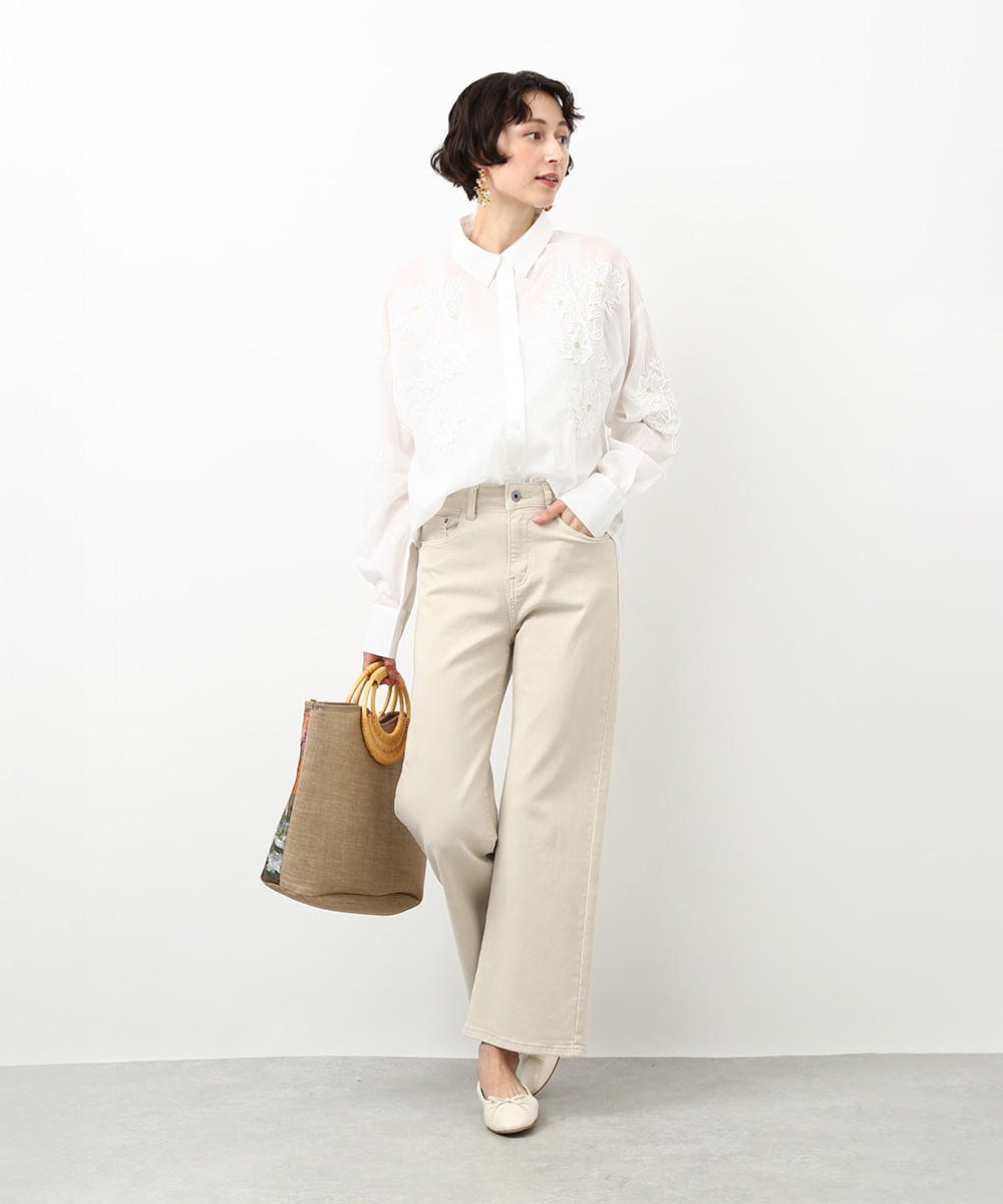 フラワーモチーフのパッチワークが印象的な白シャツ。すっきりとしたシルエットで取り入れやすく、クリーンな印象で着られるのもポイント。デニムやワイドパンツを穿いてラフにまとめた、モチーフを引き立てる着こなしもおすすめです。羽織りとしても取り入れやすく、スタイリングの幅が広がる1着です。