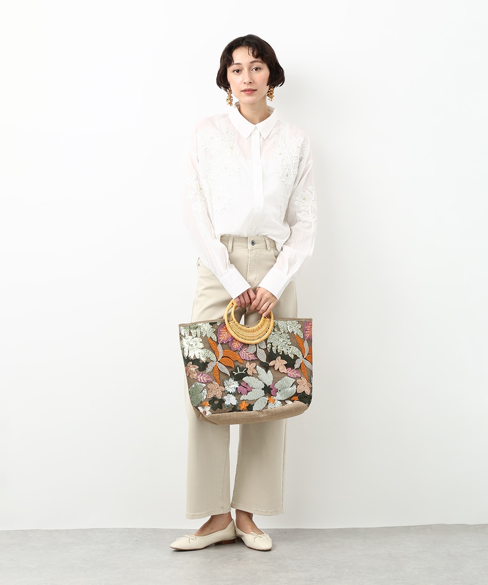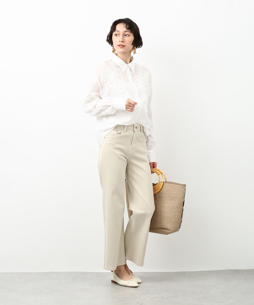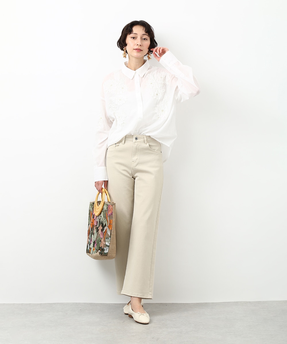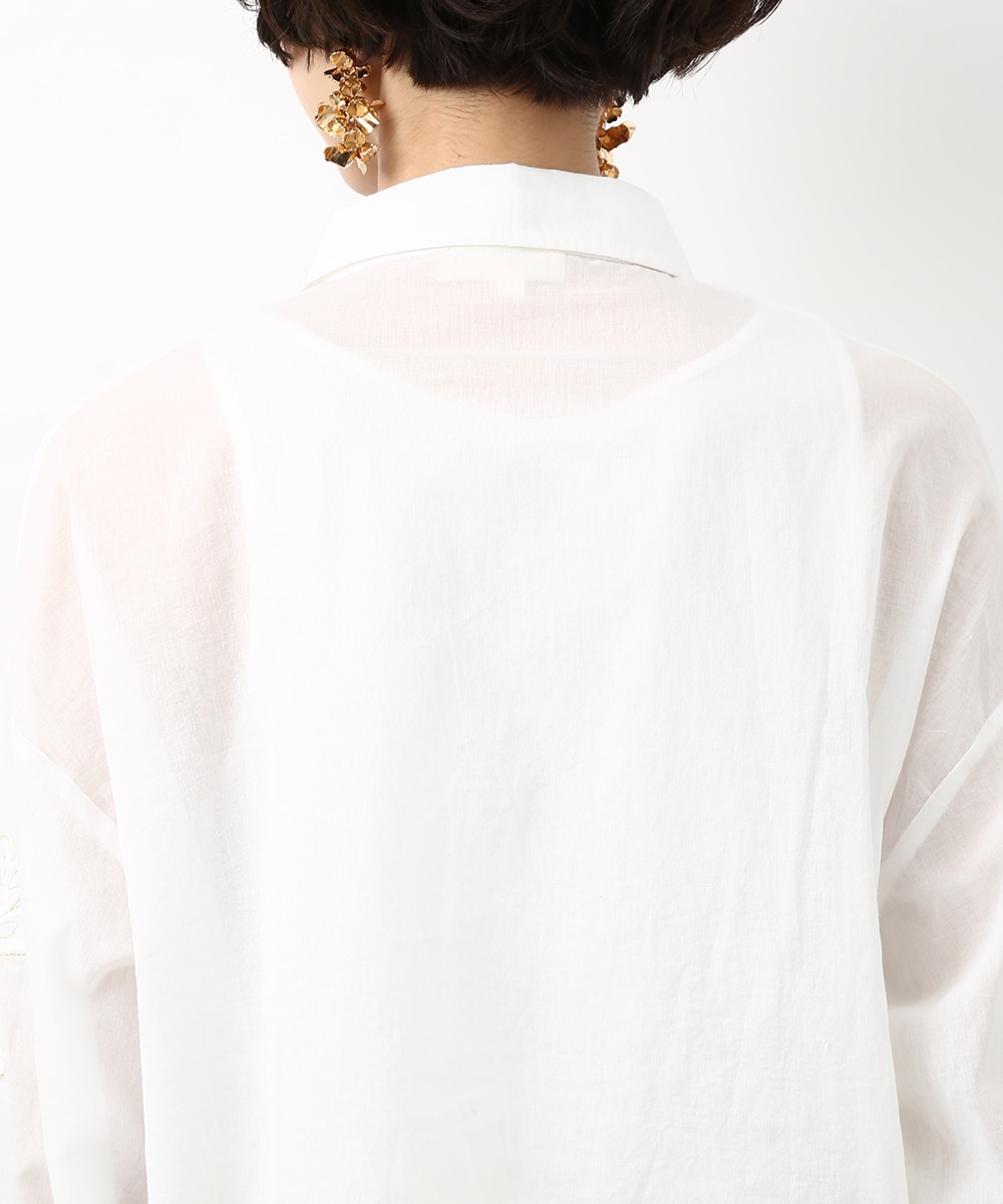 フラワーモチーフのパッチワークが印象的な白シャツ。すっきりとしたシルエットで取り入れやすく、クリーンな印象で着られるのもポイント。デニムやワイドパンツを穿いてラフにまとめた、モチーフを引き立てる着こなしもおすすめです。羽織りとしても取り入れやすく、スタイリングの幅が広がる1着です。
