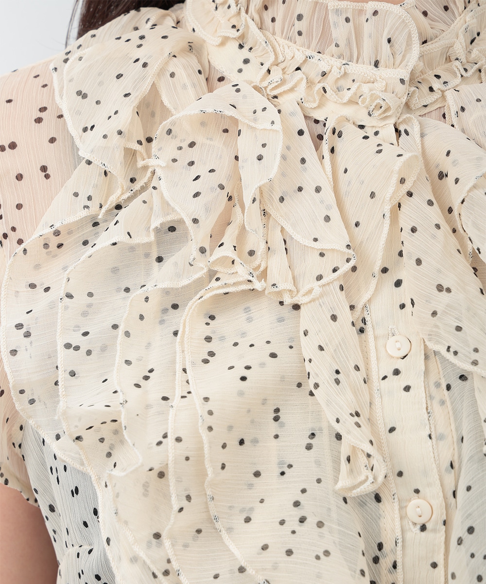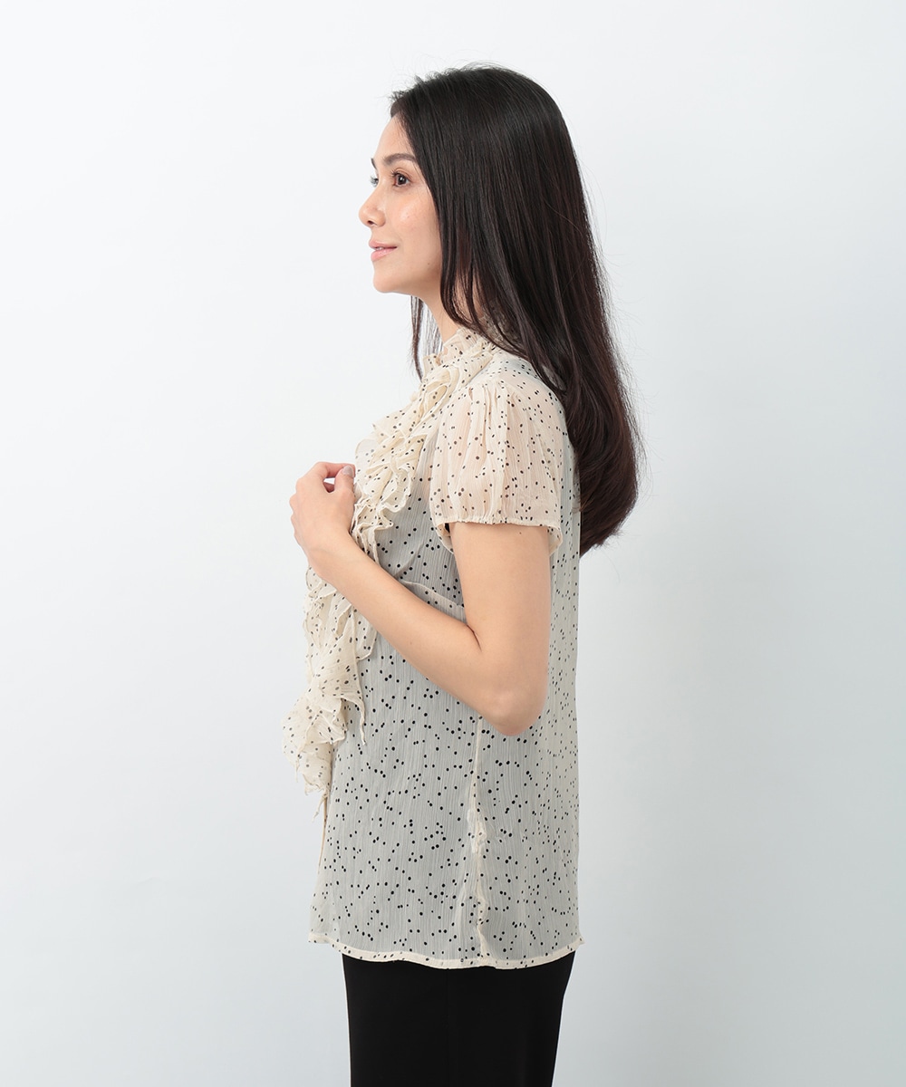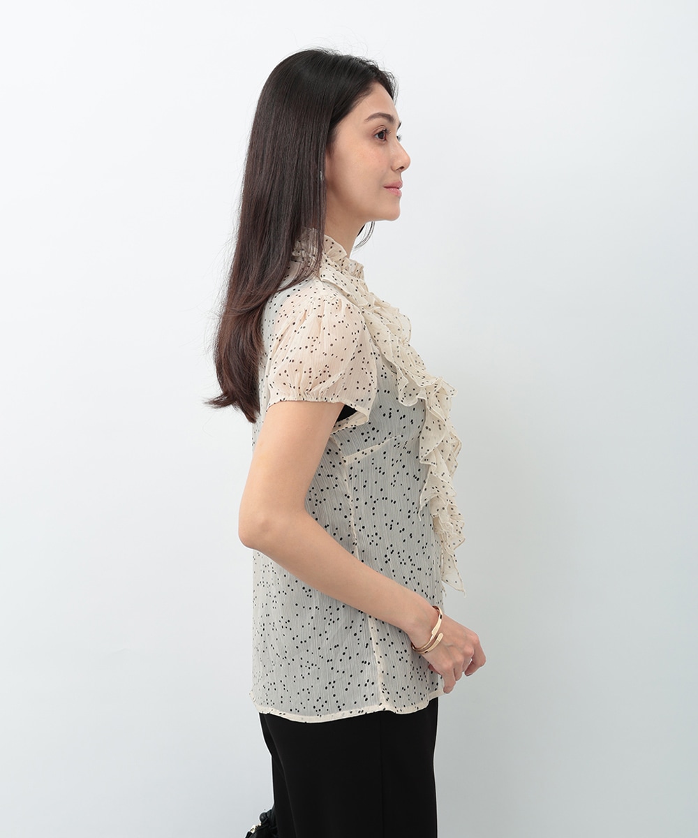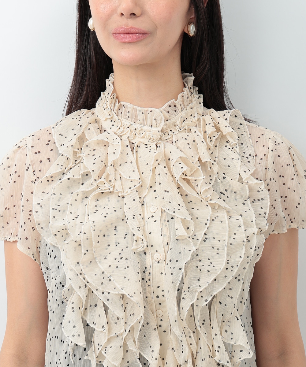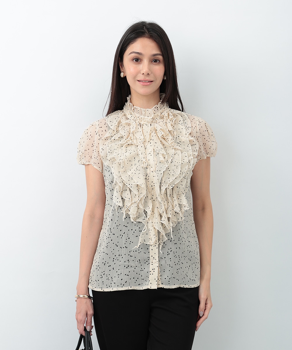 繊細なドット柄とラッフルフリルが印象的なブラウス。立体的に重なったフリルデザインが顔まわりを華やかに見せ、女性らしい雰囲気を引き立てます。軽やかな素材感で着心地もよく、上品な透け感がやわらかい印象をプラス。パンツでクリーンに、スカートで華やかにも合わせやすく、幅広いシーンで活躍する一着です。