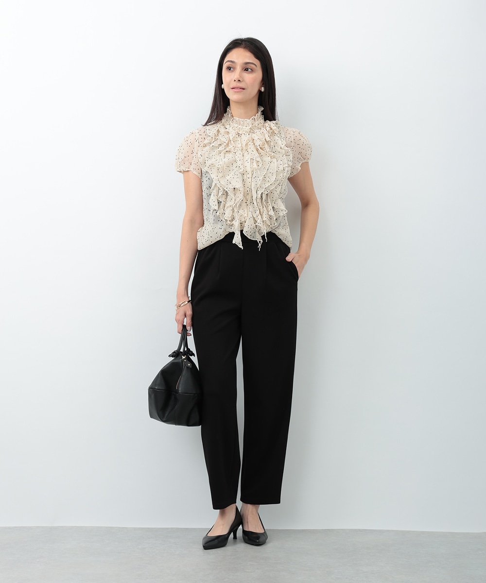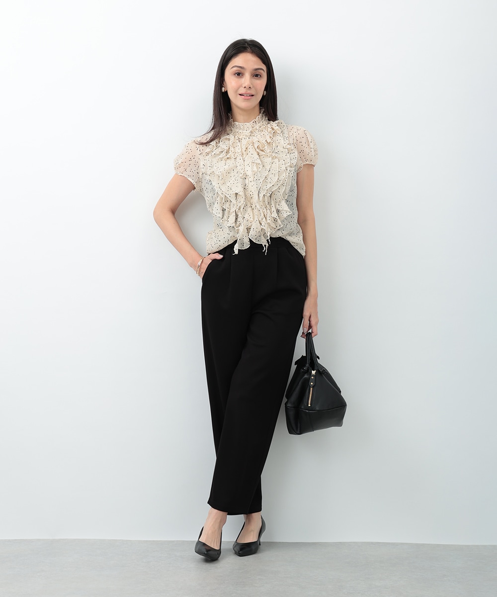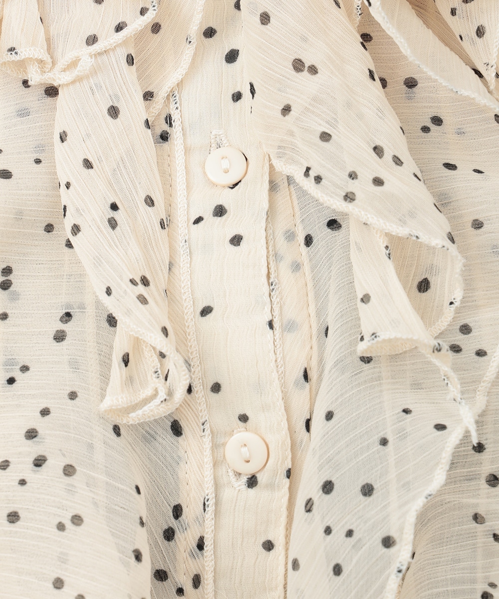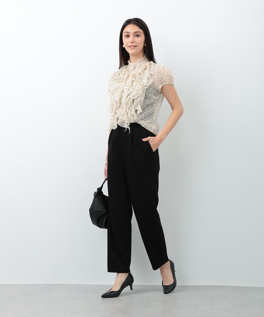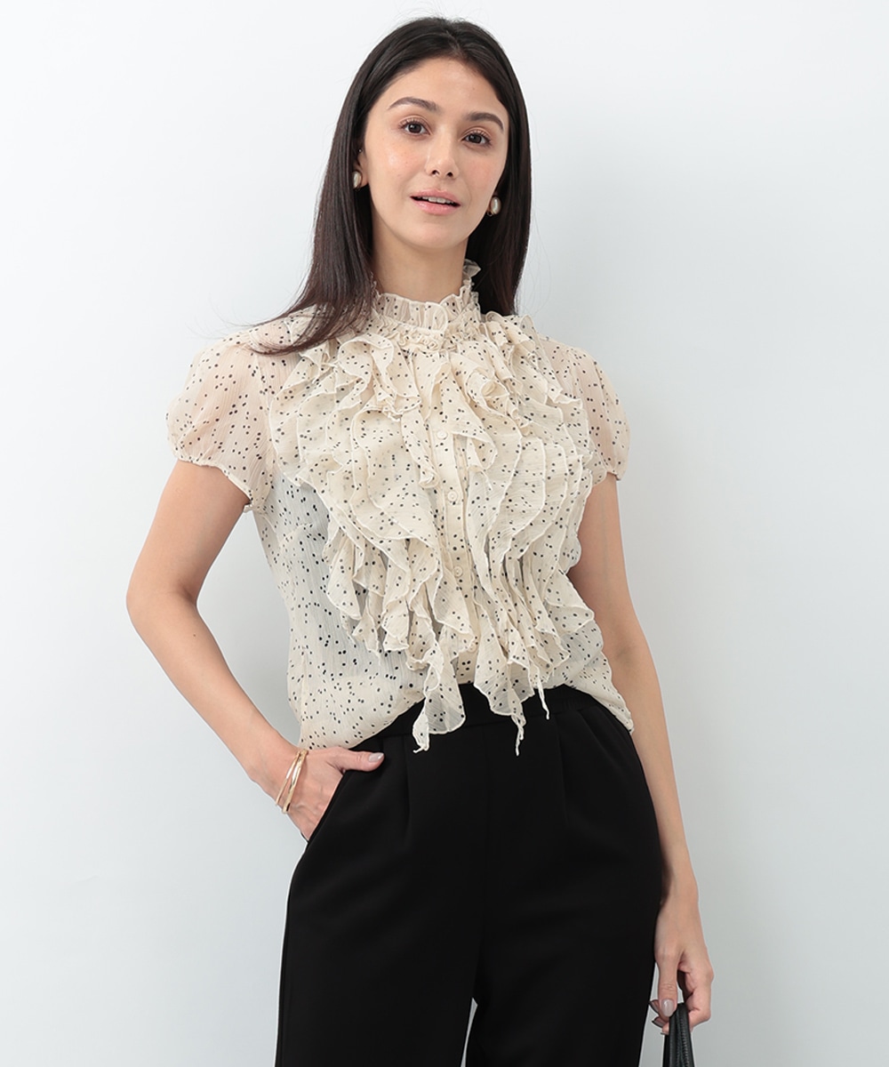 繊細なドット柄とラッフルフリルが印象的なブラウス。立体的に重なったフリルデザインが顔まわりを華やかに見せ、女性らしい雰囲気を引き立てます。軽やかな素材感で着心地もよく、上品な透け感がやわらかい印象をプラス。パンツでクリーンに、スカートで華やかにも合わせやすく、幅広いシーンで活躍する一着です。