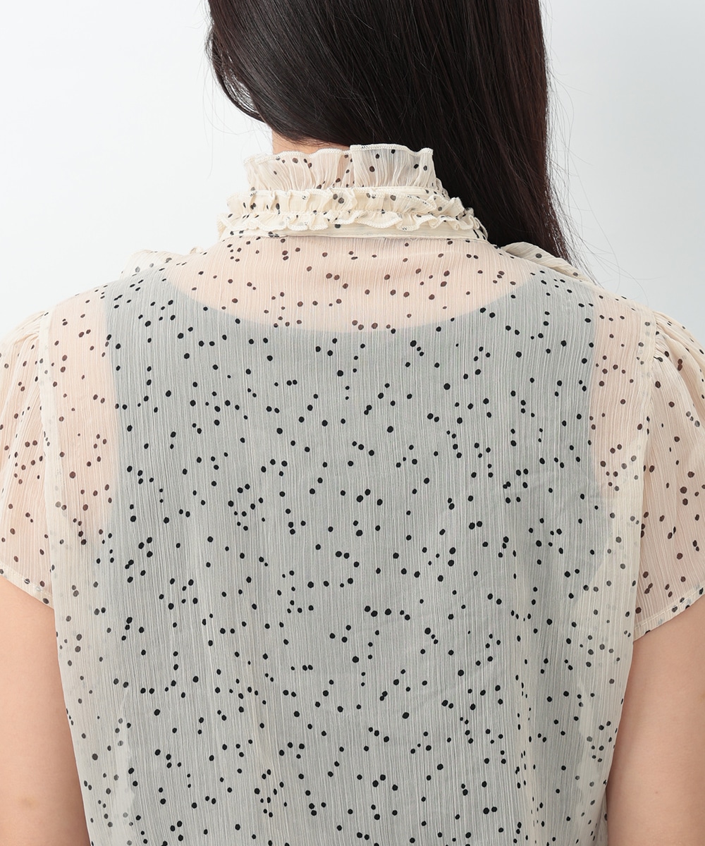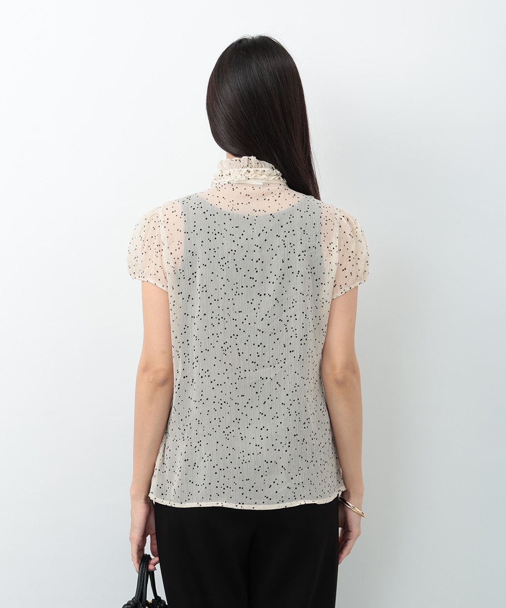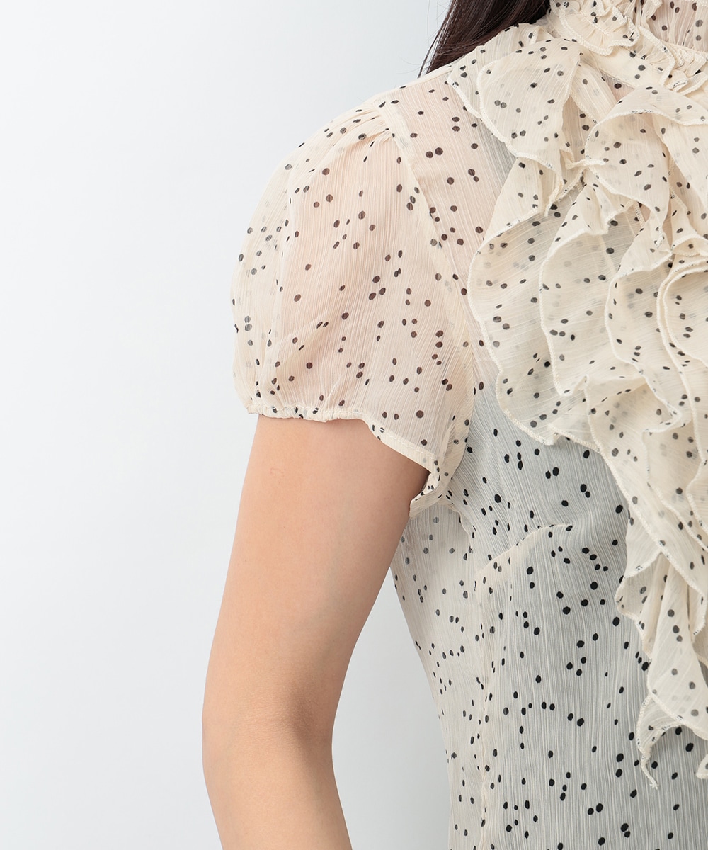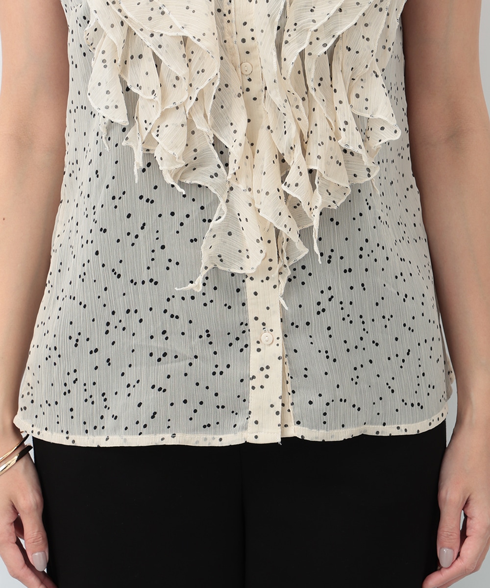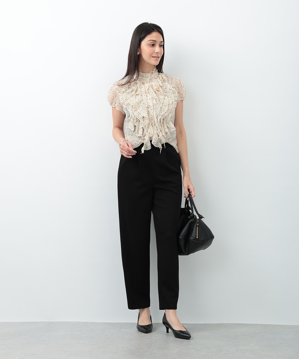 繊細なドット柄とラッフルフリルが印象的なブラウス。立体的に重なったフリルデザインが顔まわりを華やかに見せ、女性らしい雰囲気を引き立てます。軽やかな素材感で着心地もよく、上品な透け感がやわらかい印象をプラス。パンツでクリーンに、スカートで華やかにも合わせやすく、幅広いシーンで活躍する一着です。