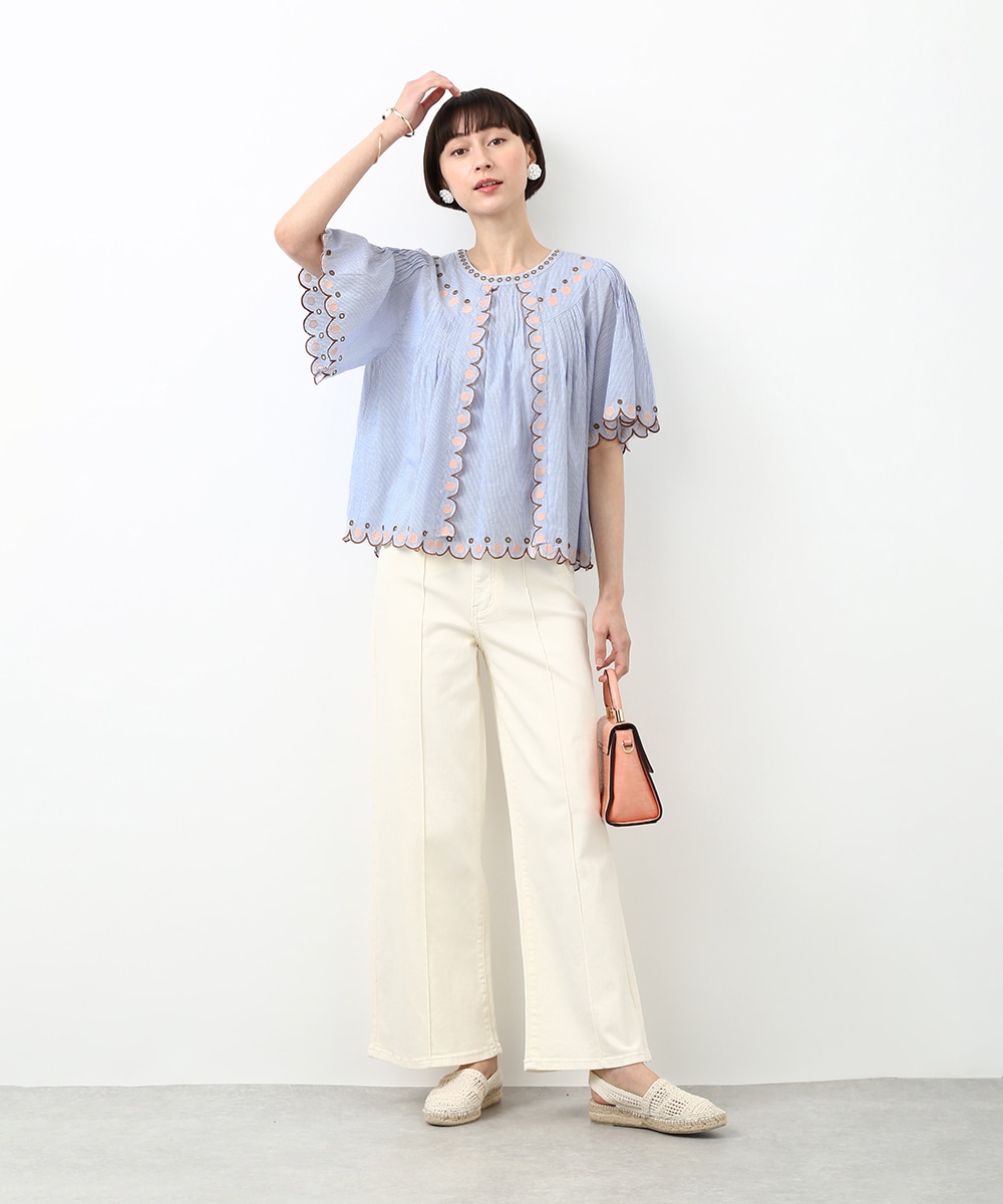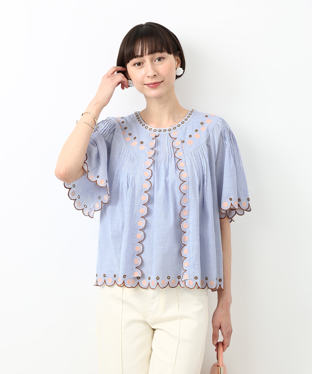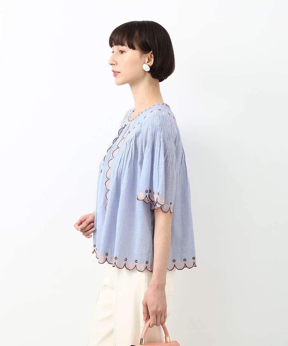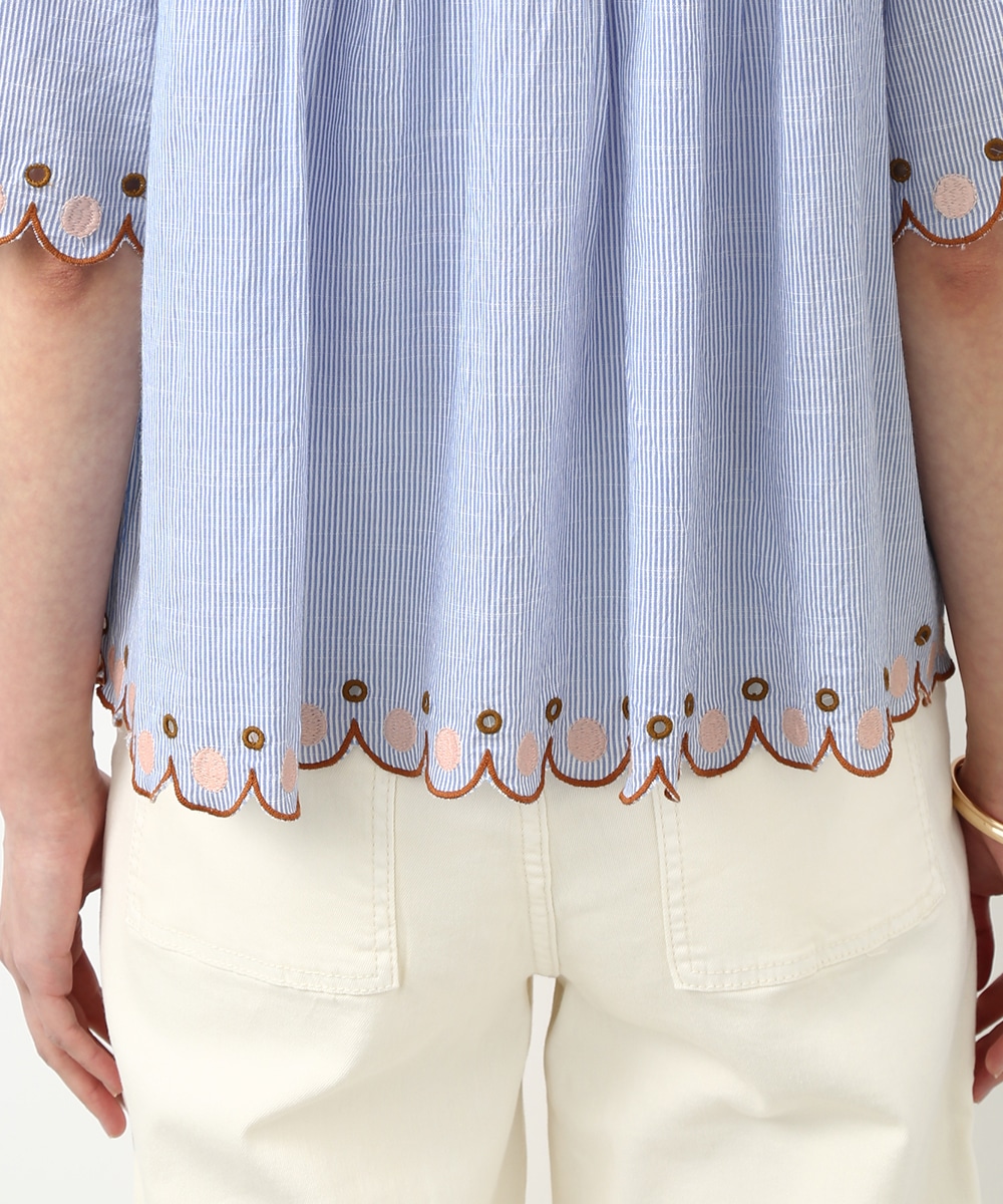 ブルーのストライプにピンクとブラウンの刺繍をあしらった、表情豊かなブラウス。スカラップデザインがアクセントになり、軽やかでやわらかな印象に仕上げています。ワイドパンツを穿いてナチュラルにまとめた着こなしもおすすめです。夏のおでかけに取り入れたくなる1着です。