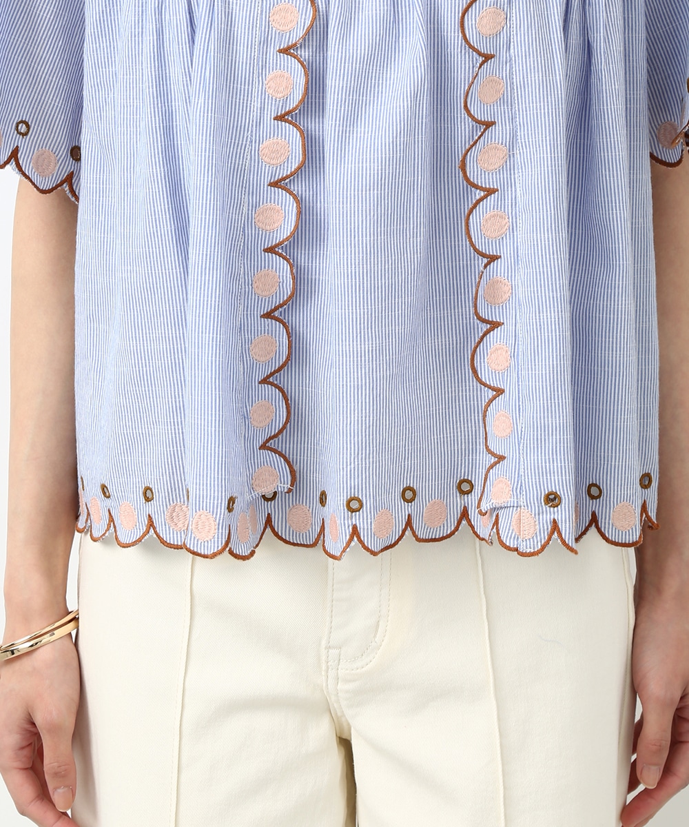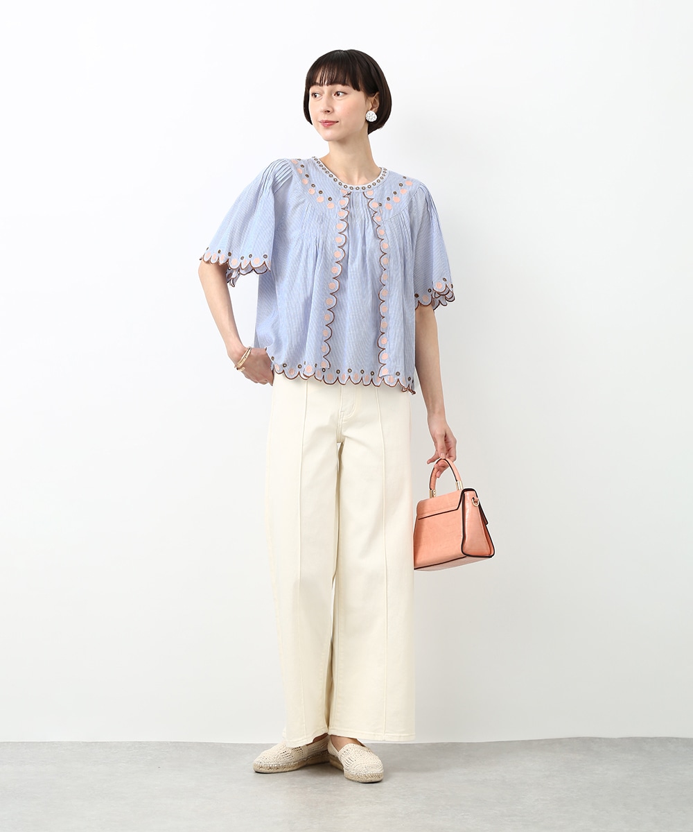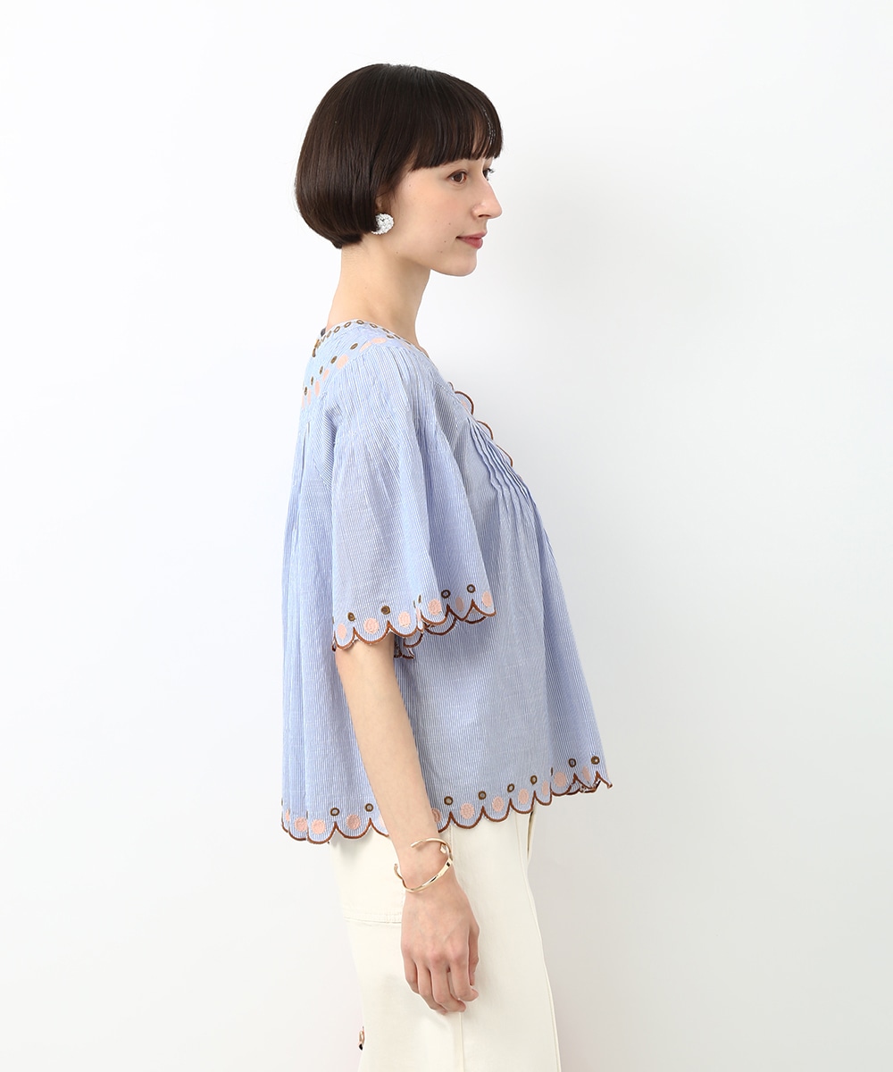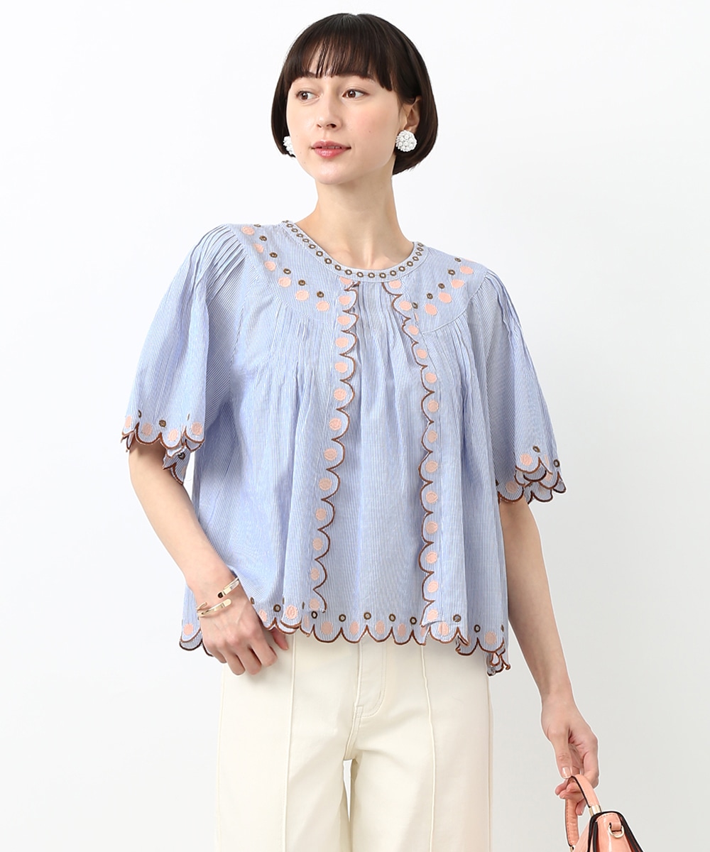 ブルーのストライプにピンクとブラウンの刺繍をあしらった、表情豊かなブラウス。スカラップデザインがアクセントになり、軽やかでやわらかな印象に仕上げています。ワイドパンツを穿いてナチュラルにまとめた着こなしもおすすめです。夏のおでかけに取り入れたくなる1着です。