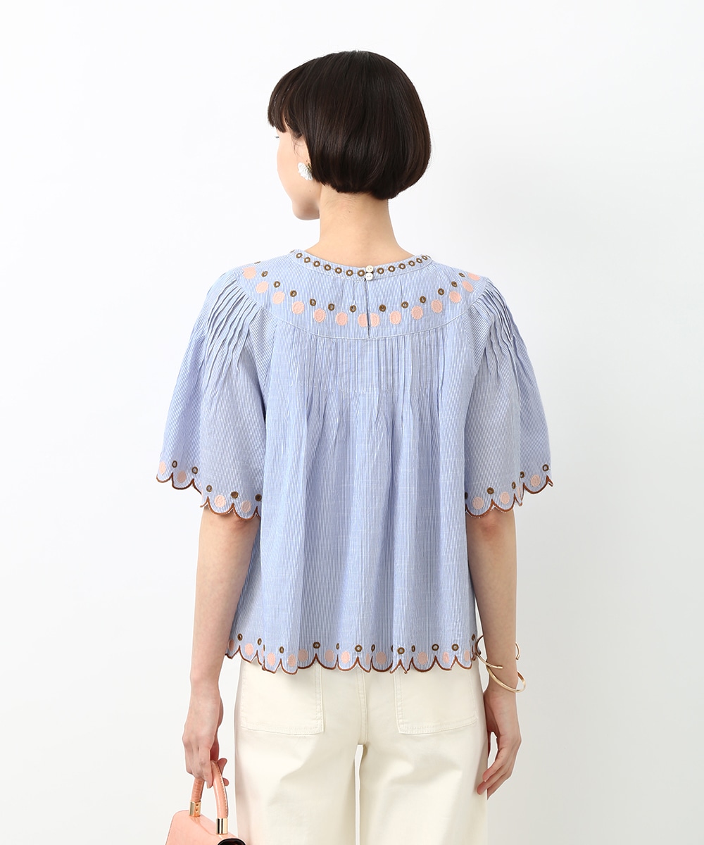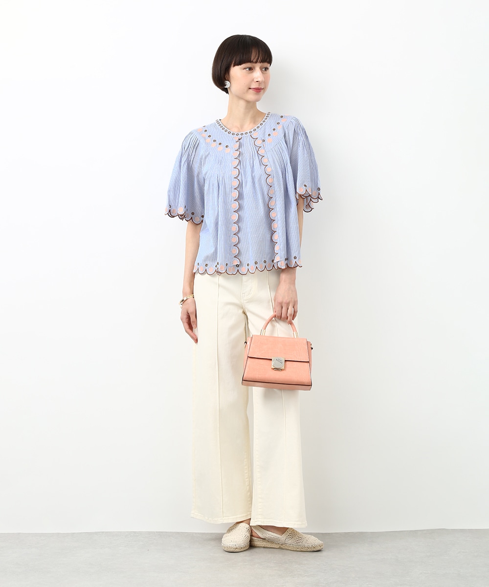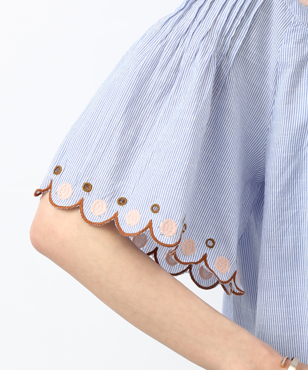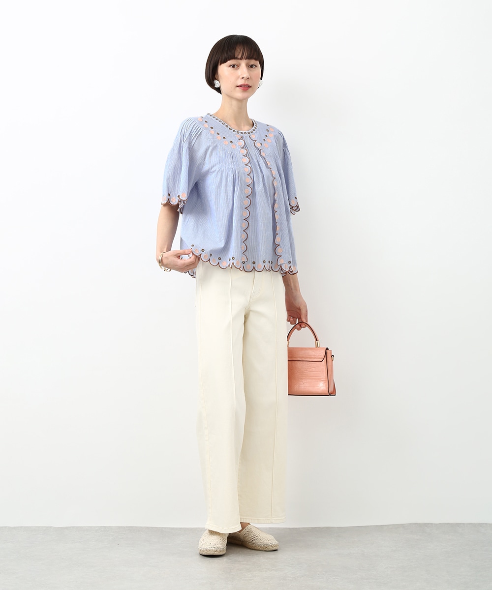 ブルーのストライプにピンクとブラウンの刺繍をあしらった、表情豊かなブラウス。スカラップデザインがアクセントになり、軽やかでやわらかな印象に仕上げています。ワイドパンツを穿いてナチュラルにまとめた着こなしもおすすめです。夏のおでかけに取り入れたくなる1着です。