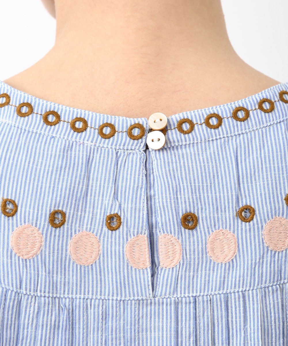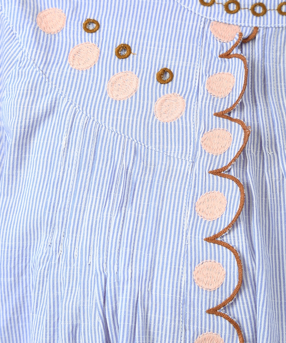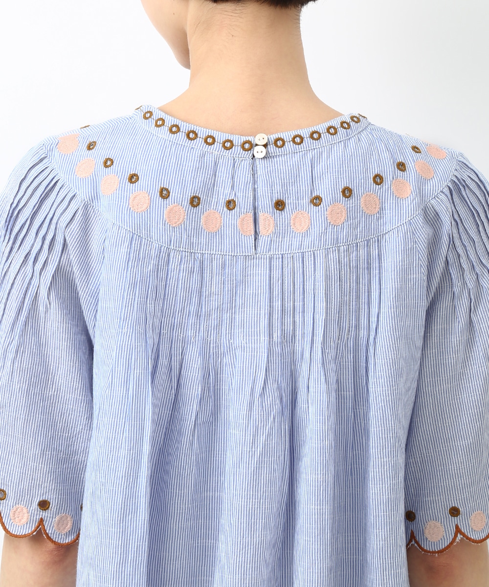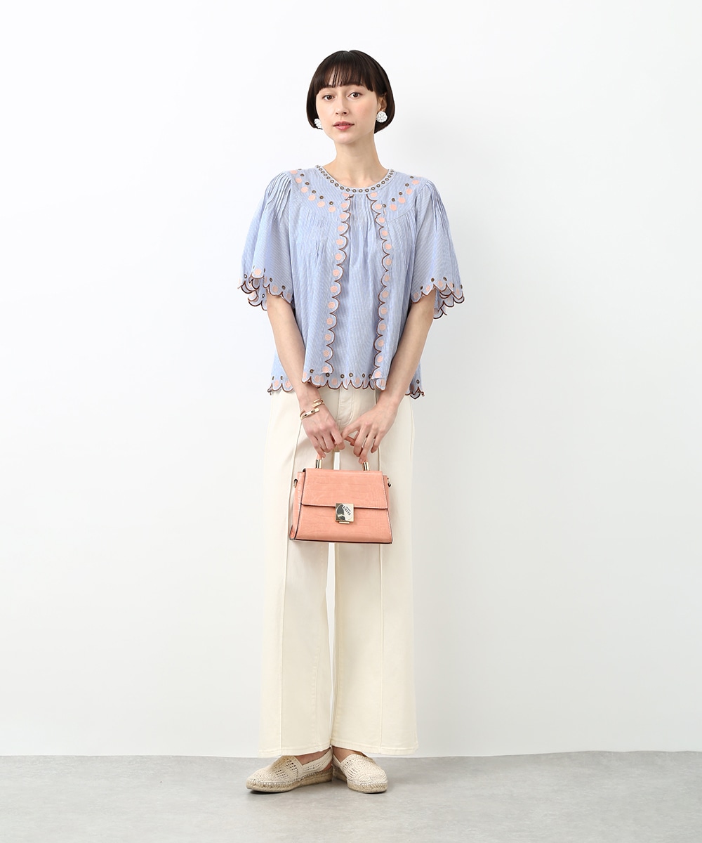ブルーのストライプにピンクとブラウンの刺繍をあしらった、表情豊かなブラウス。スカラップデザインがアクセントになり、軽やかでやわらかな印象に仕上げています。ワイドパンツを穿いてナチュラルにまとめた着こなしもおすすめです。夏のおでかけに取り入れたくなる1着です。