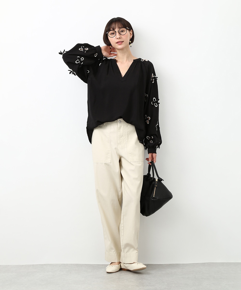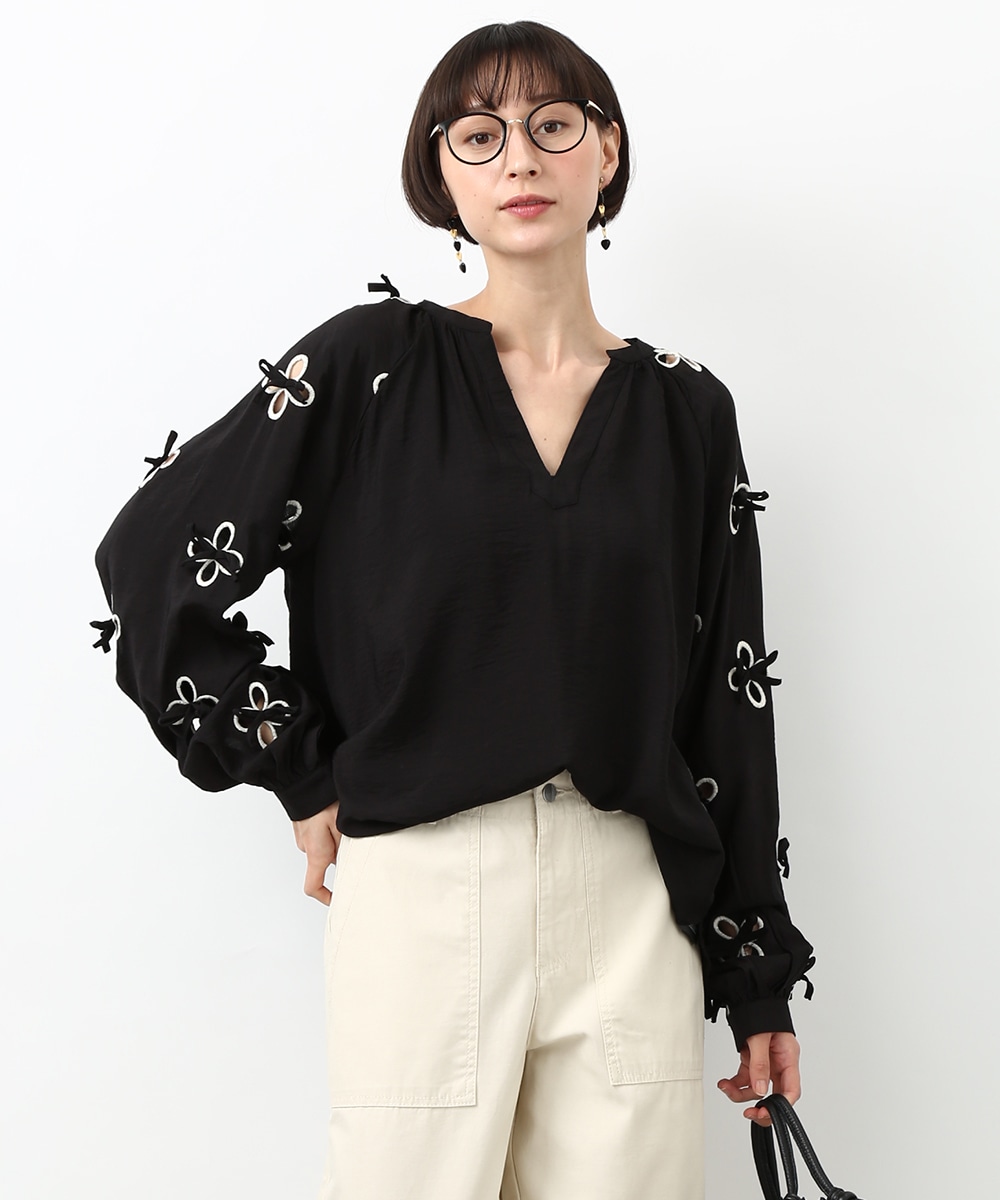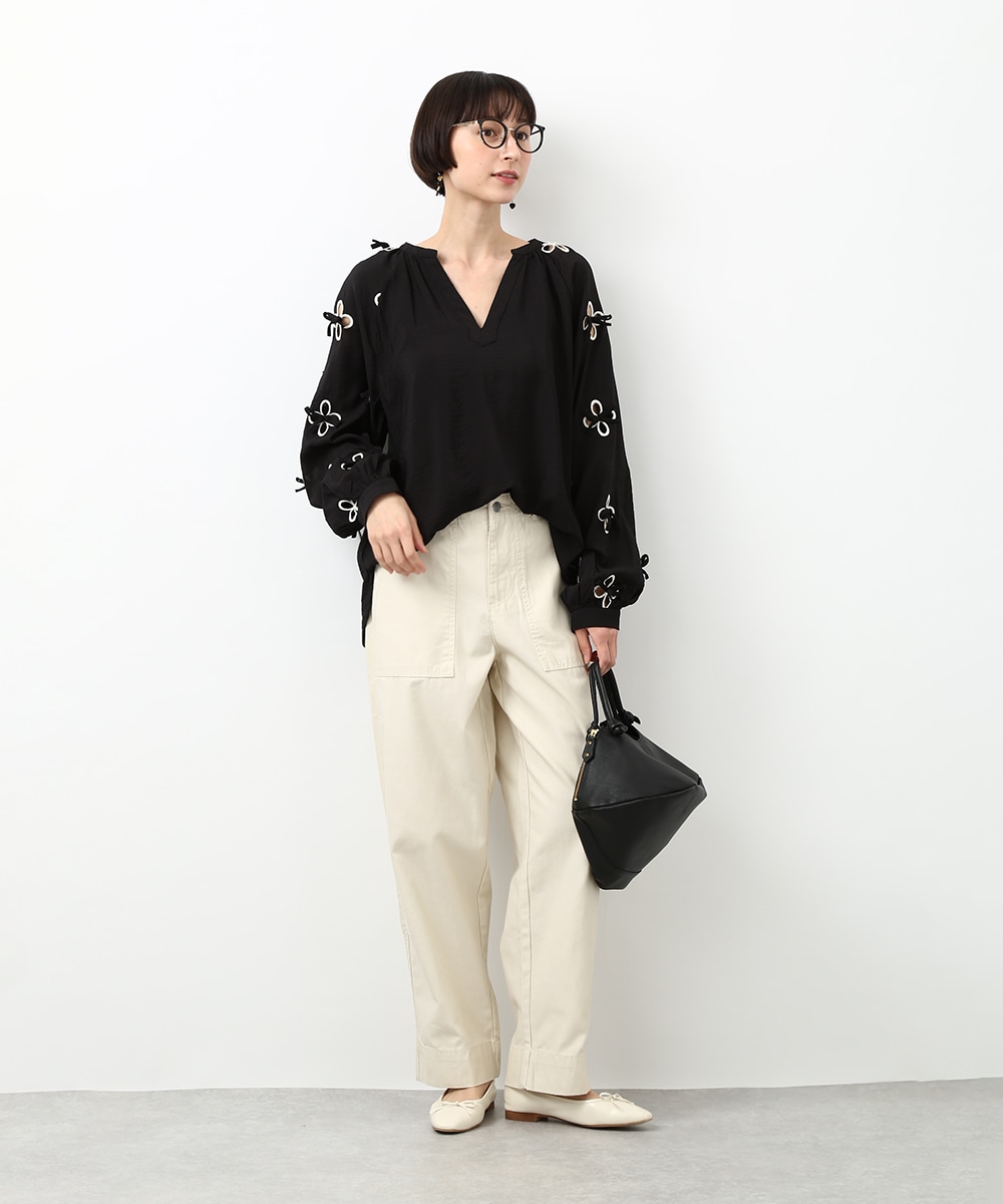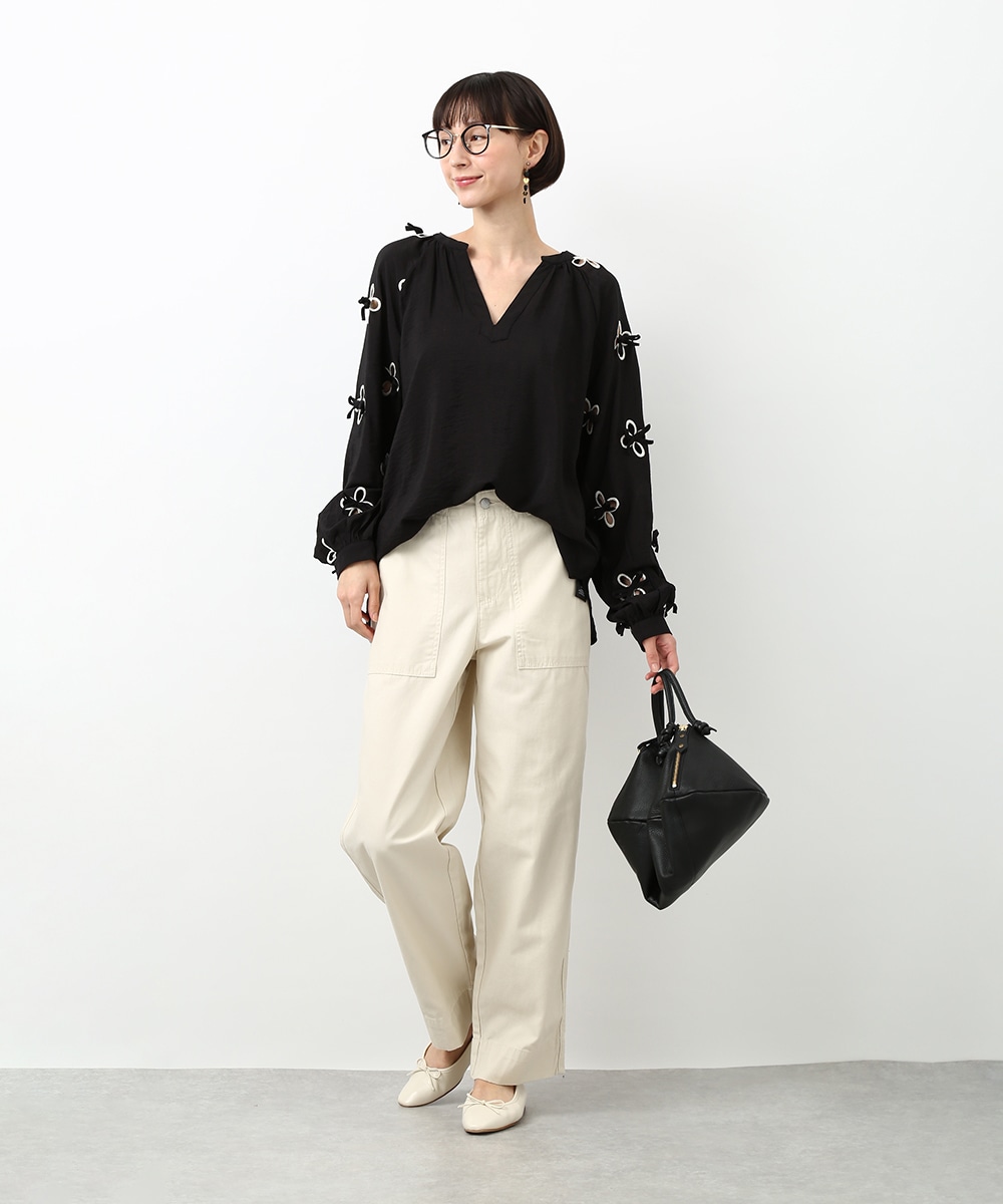 袖にあしらったフラワーモチーフのカットワークとリボンデザインが目を引くブラウス。立体感のあるディテールが、シンプルな中に華やかさをプラスします。首元はすっきりとした開きで、軽やかな印象に仕上げています。ワイドパンツを穿いて落ち着いたトーンでまとめた着こなしもおすすめです。