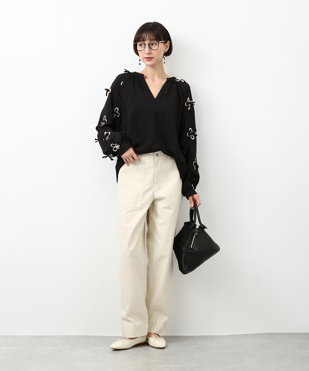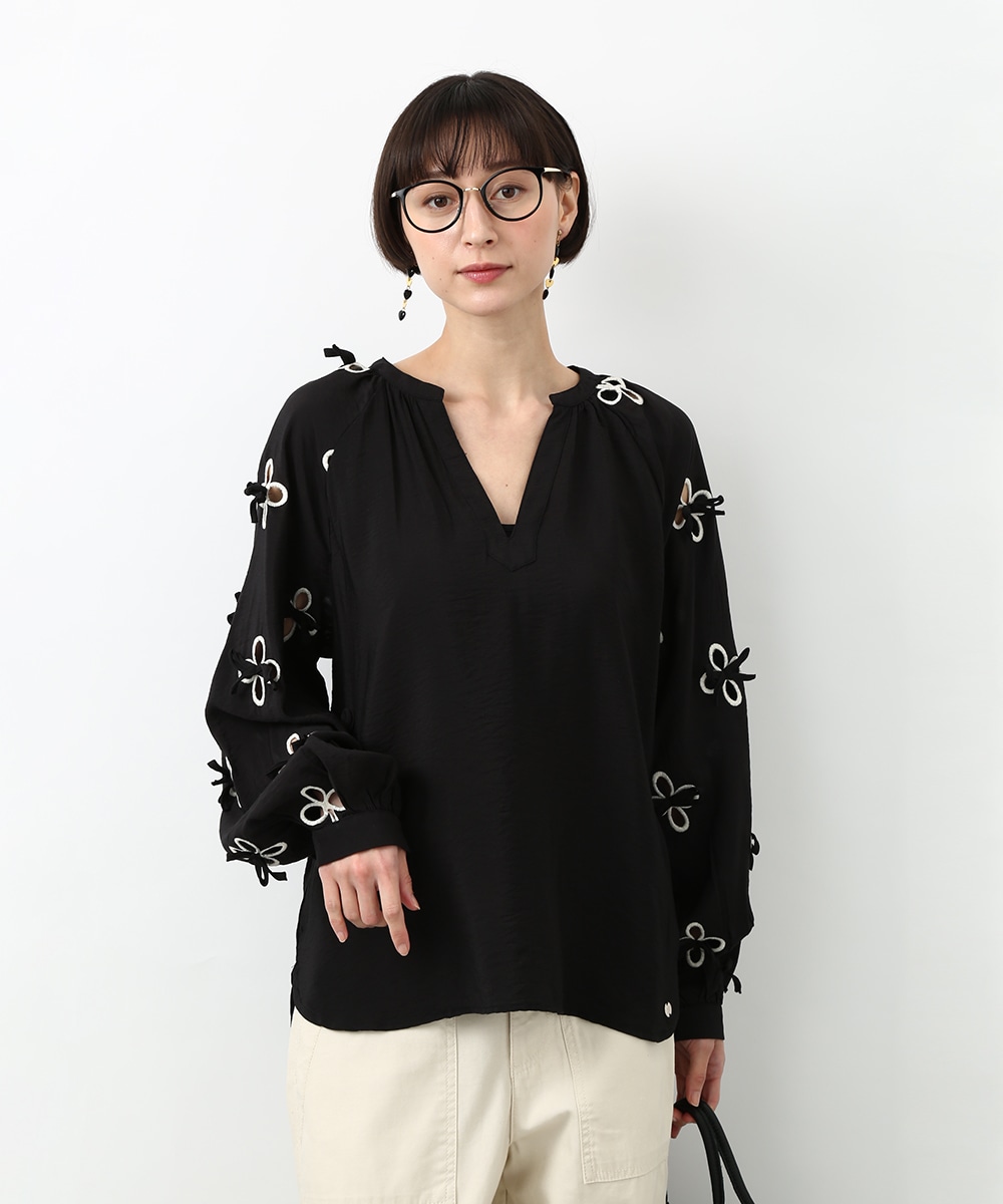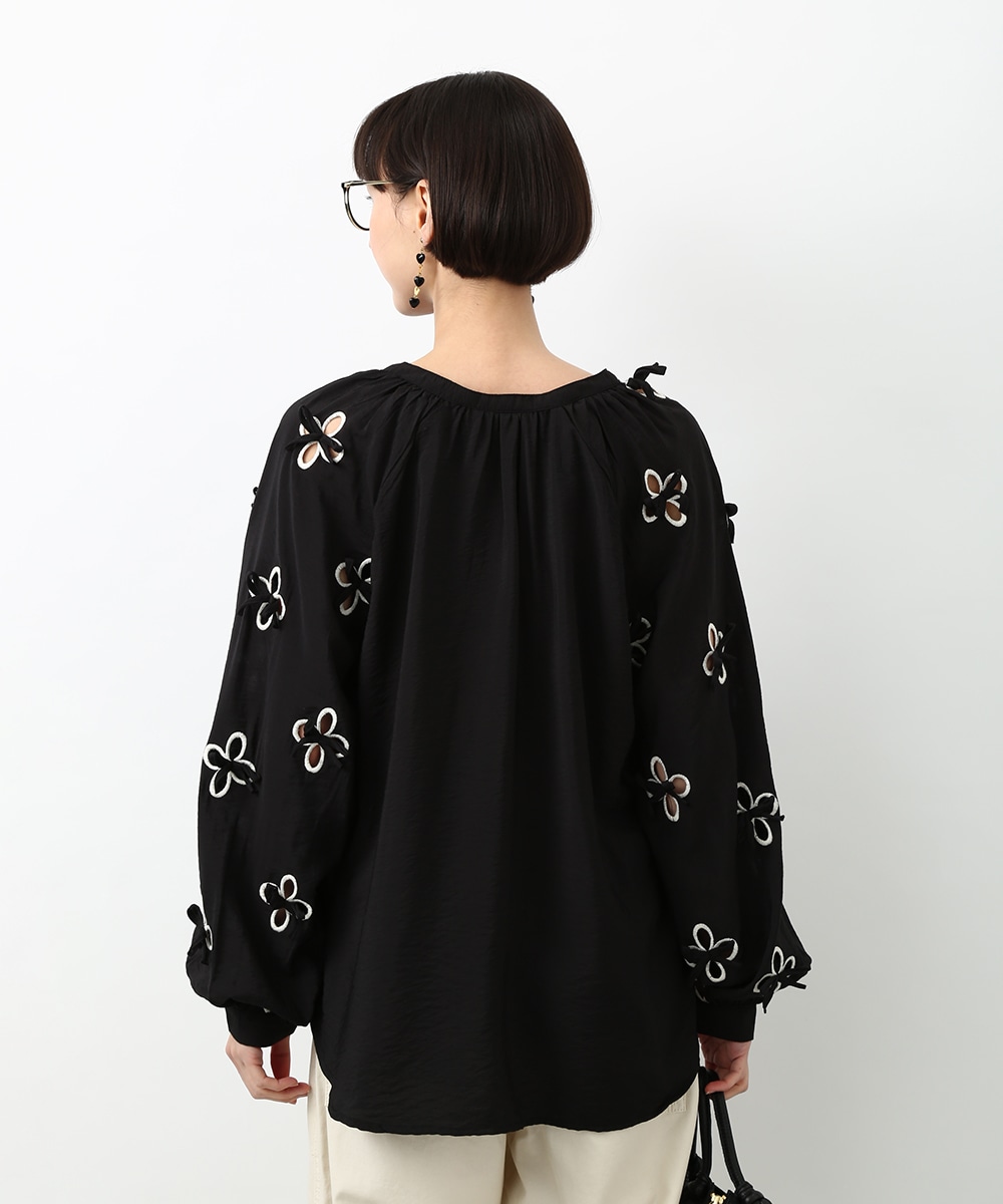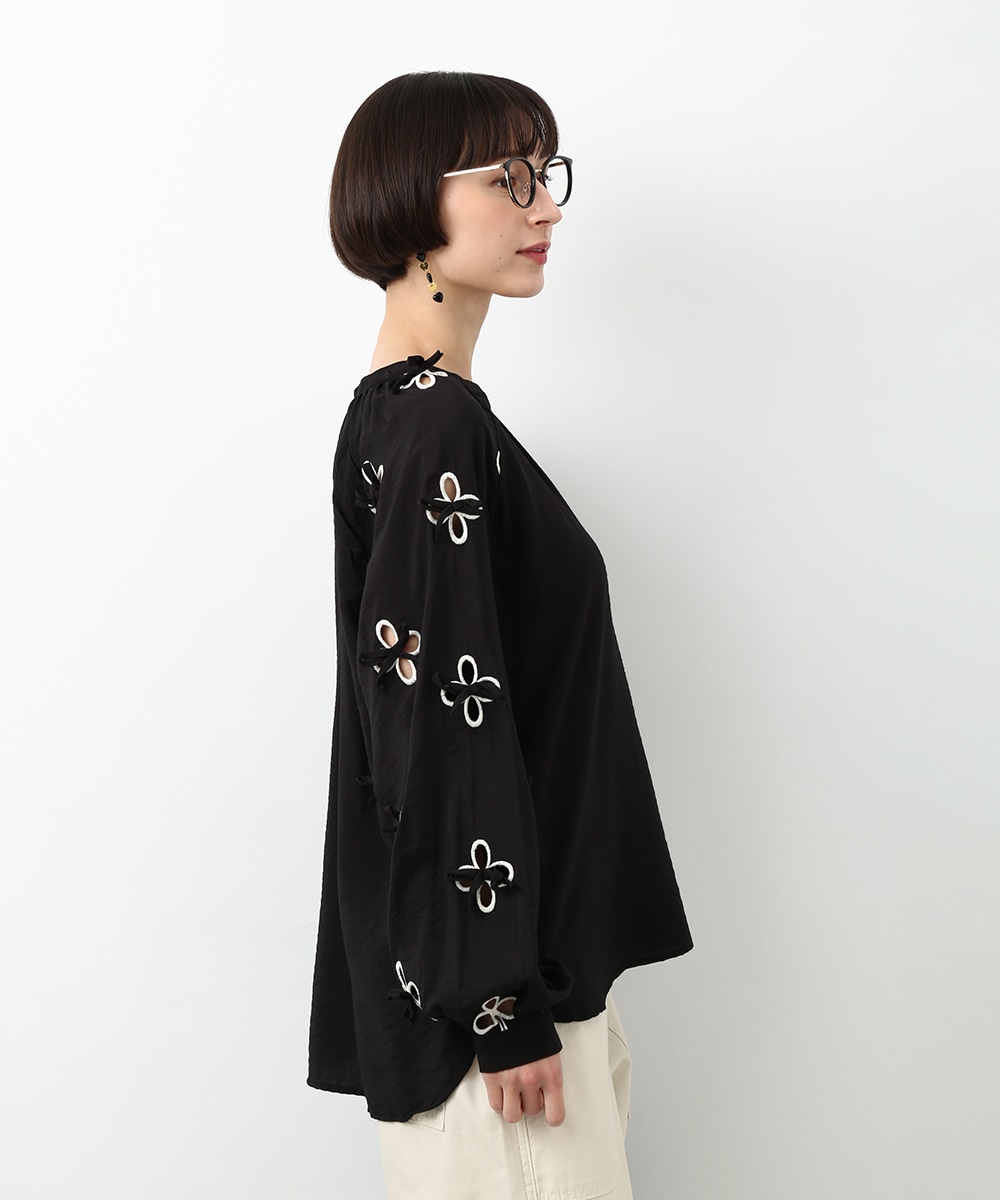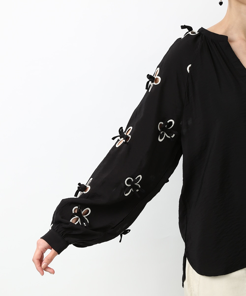袖にあしらったフラワーモチーフのカットワークとリボンデザインが目を引くブラウス。立体感のあるディテールが、シンプルな中に華やかさをプラスします。首元はすっきりとした開きで、軽やかな印象に仕上げています。ワイドパンツを穿いて落ち着いたトーンでまとめた着こなしもおすすめです。