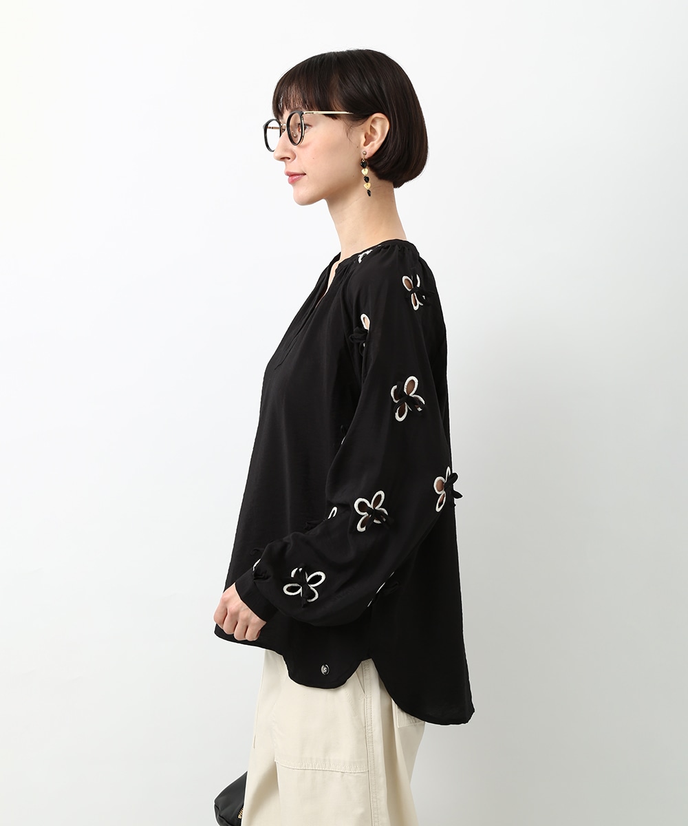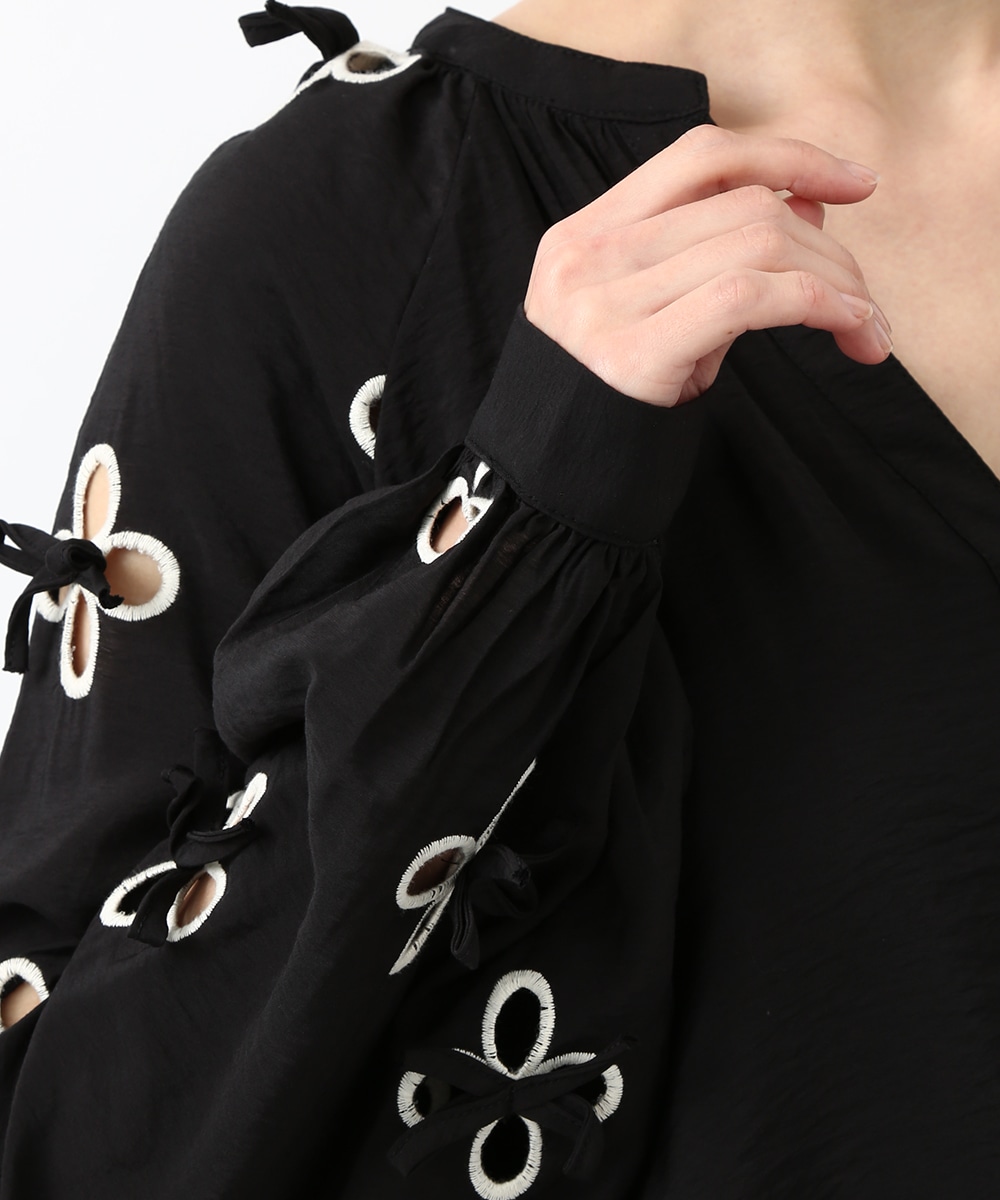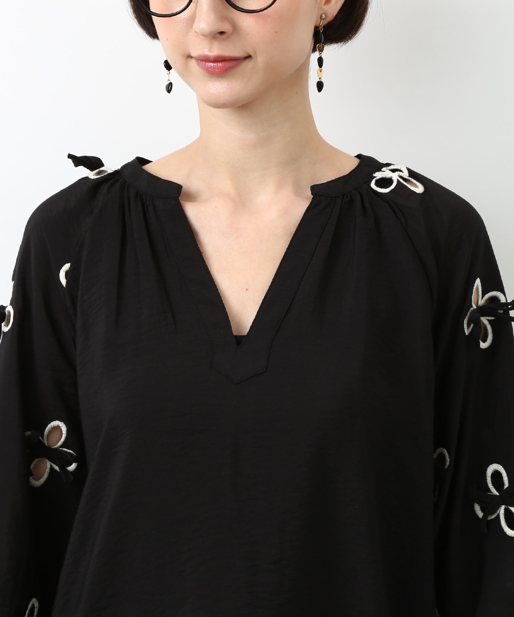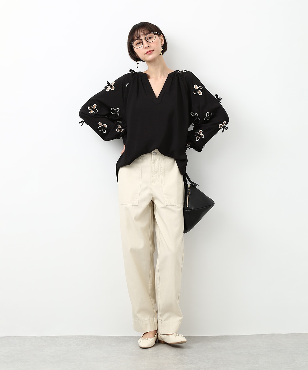 袖にあしらったフラワーモチーフのカットワークとリボンデザインが目を引くブラウス。立体感のあるディテールが、シンプルな中に華やかさをプラスします。首元はすっきりとした開きで、軽やかな印象に仕上げています。ワイドパンツを穿いて落ち着いたトーンでまとめた着こなしもおすすめです。