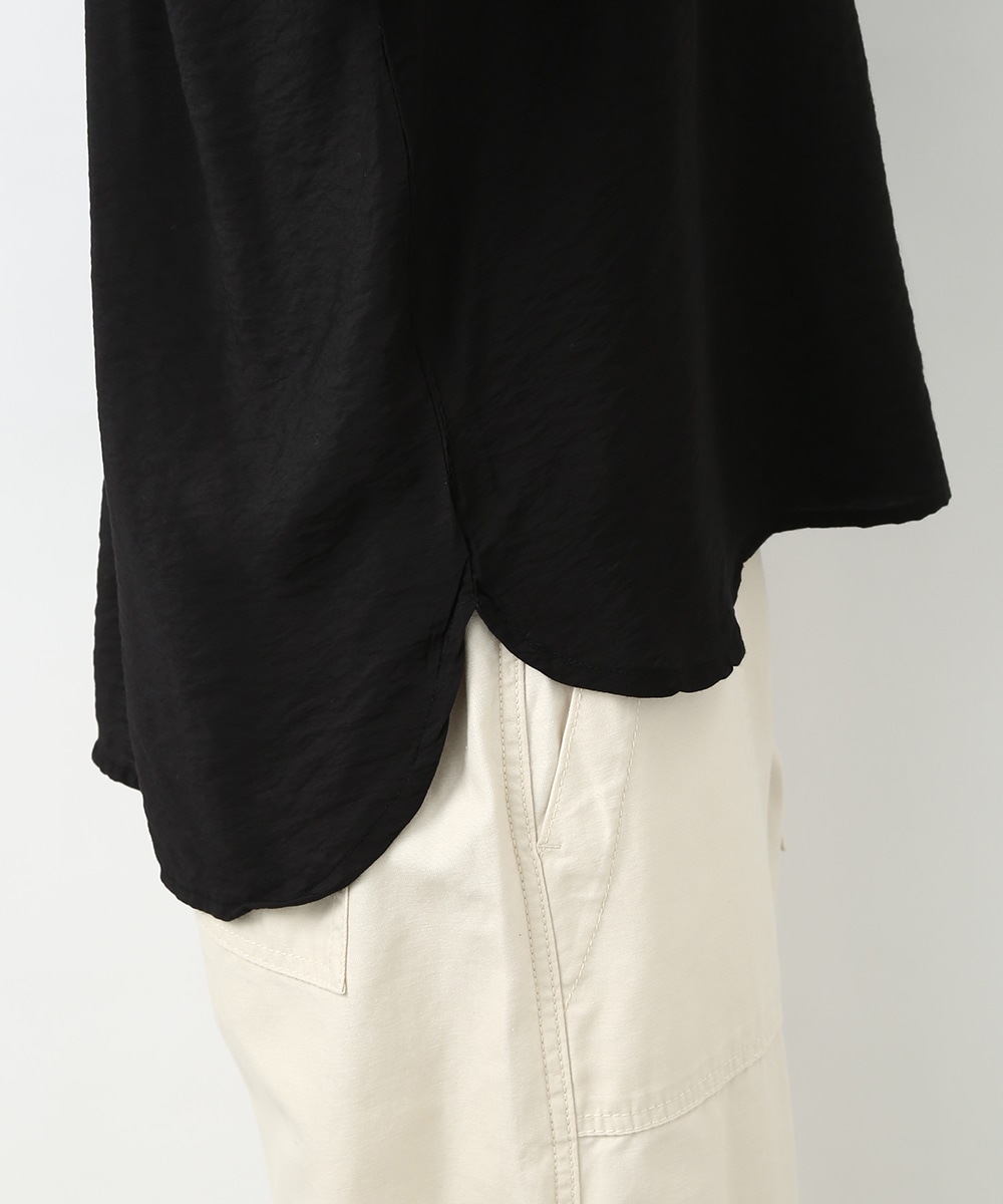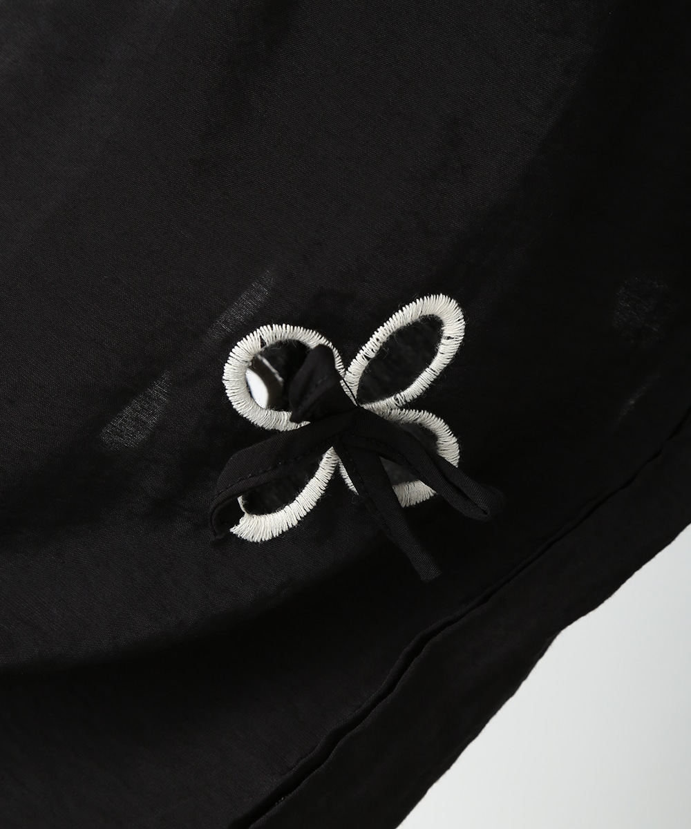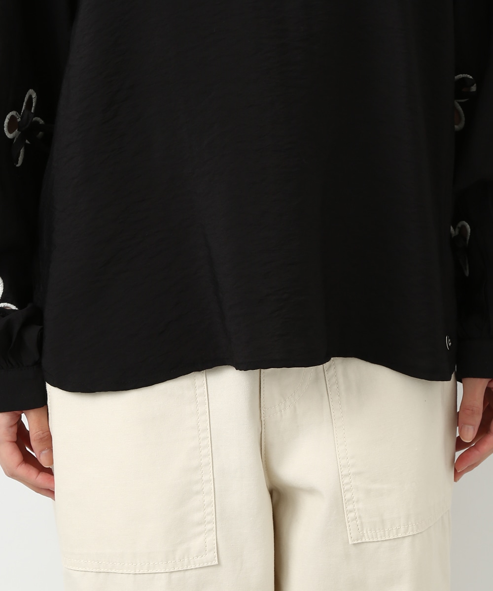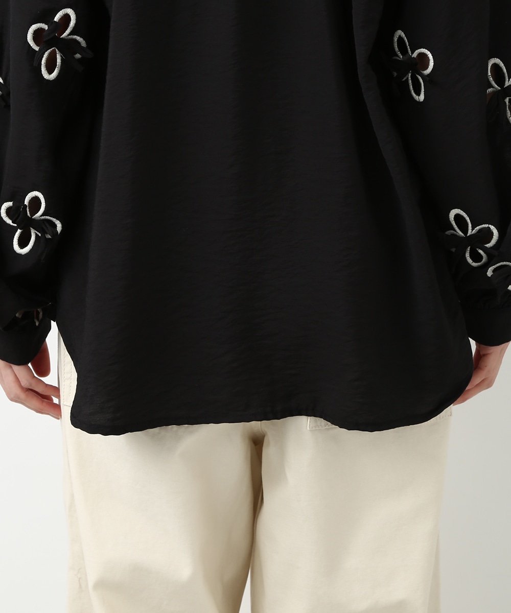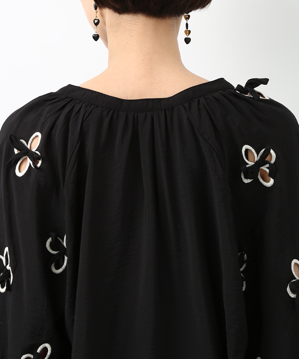 袖にあしらったフラワーモチーフのカットワークとリボンデザインが目を引くブラウス。立体感のあるディテールが、シンプルな中に華やかさをプラスします。首元はすっきりとした開きで、軽やかな印象に仕上げています。ワイドパンツを穿いて落ち着いたトーンでまとめた着こなしもおすすめです。