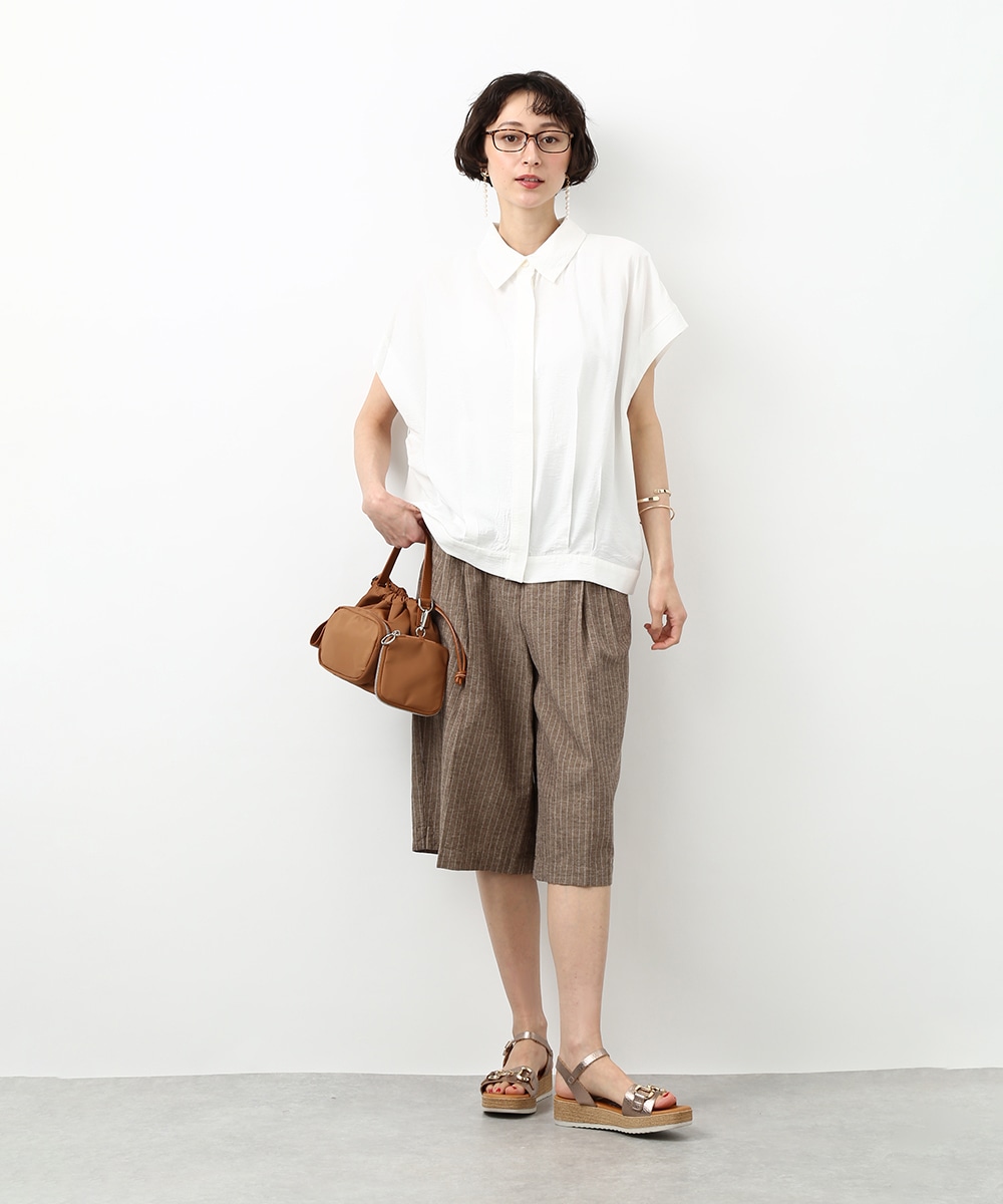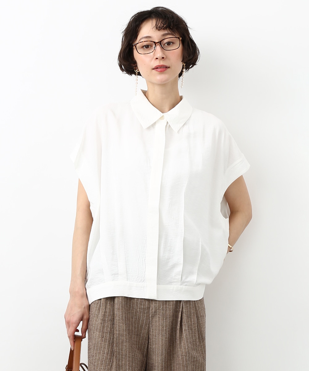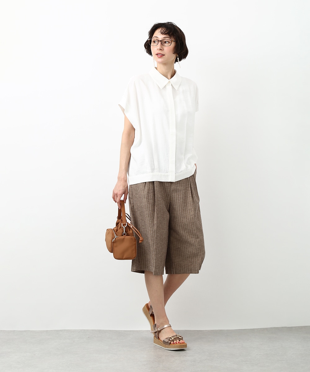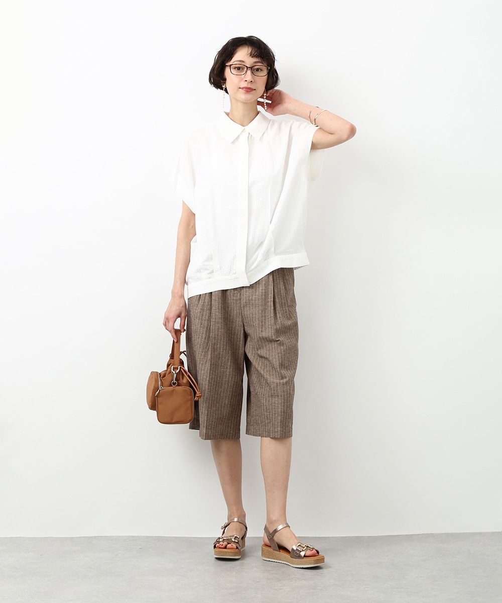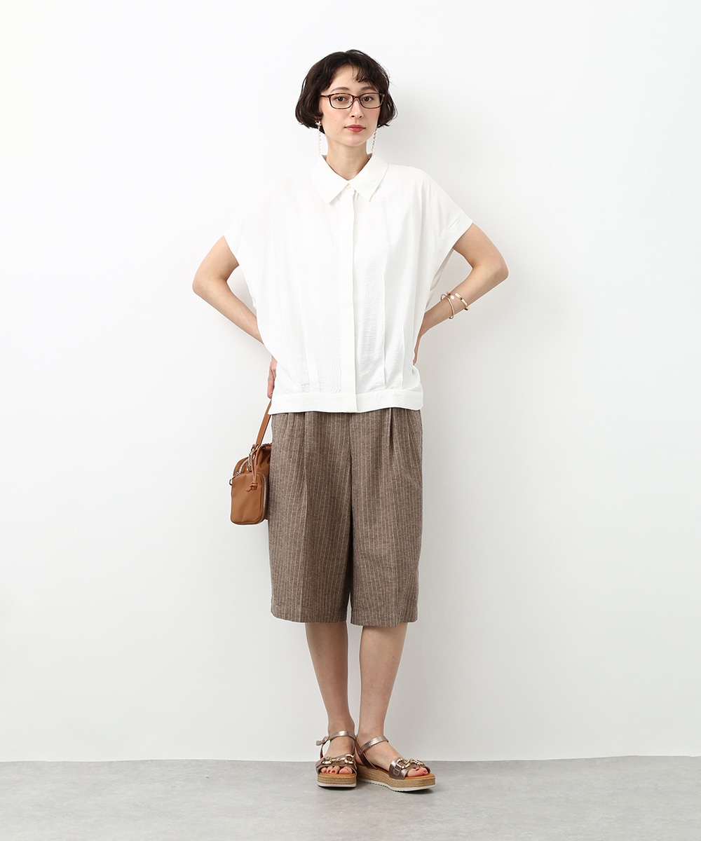 ウエストにタックを入れた丸みのあるコクーンシルエットのシャツ。ゆとりのあるサイズ感で軽やかに着られ、すっきりとした印象に仕上がるのもポイント。ハーフパンツを穿いて軽やかにまとめた、季節感のある着こなしもおすすめです。夏の羽織りとしても取り入れやすい1枚です。