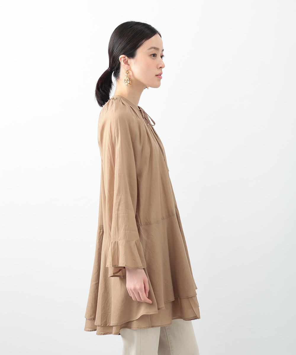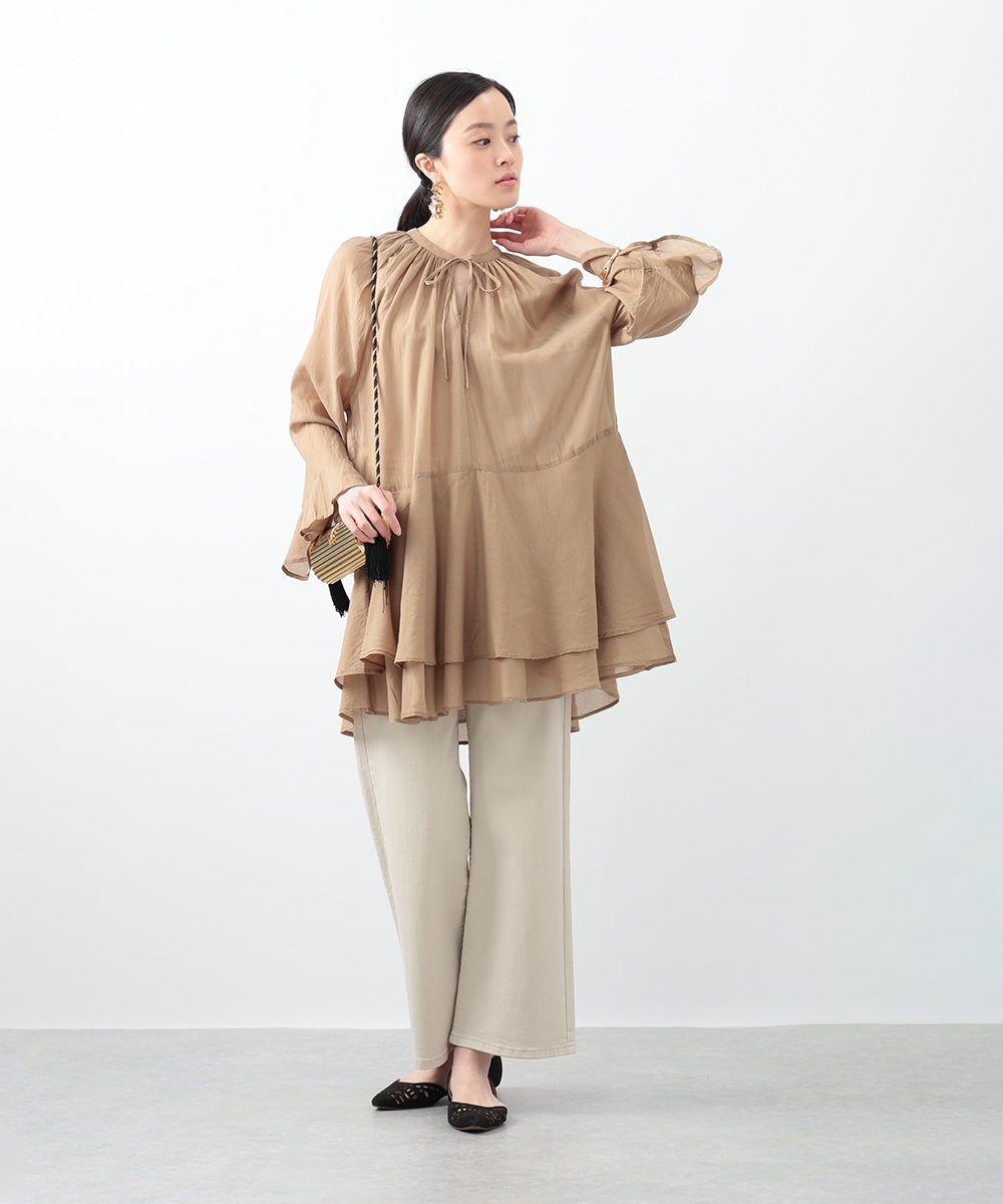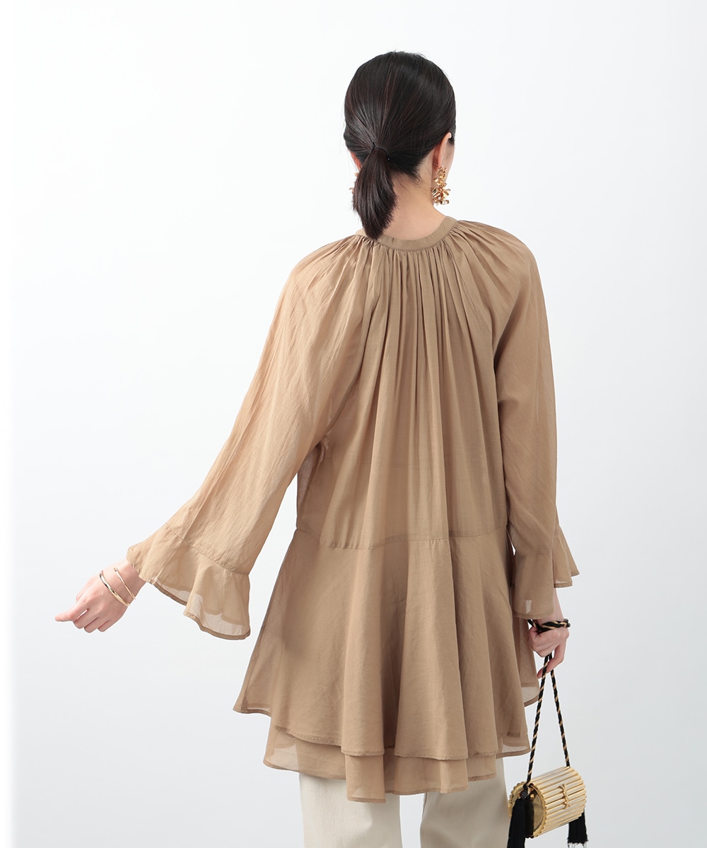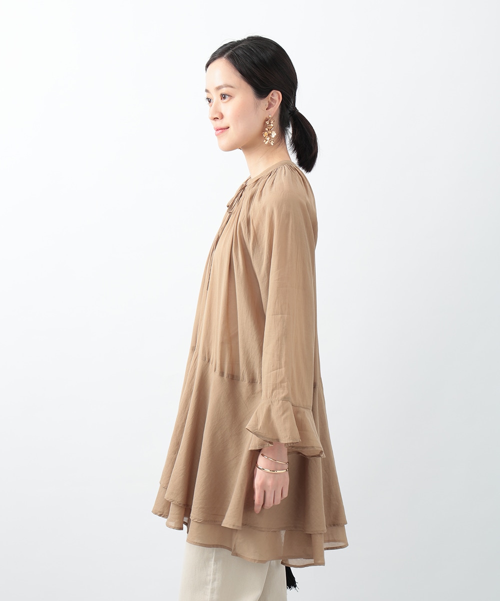 分量たっぷりのティアード切り替えで仕立てられたチュニックブラウス。スタイルアップ効果のあるハイウエストのデザインがすっきりとした着こなしを演出します。肌触りがやさしく軽やかなコットン素材を使用。シンプルなボトムスはもちろん、柄のパンツと合わせたスタイリングもおすすめです。