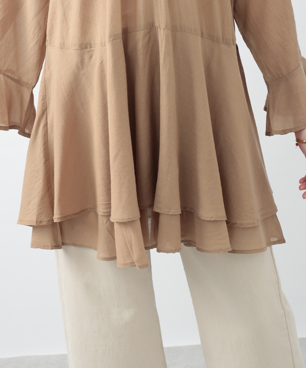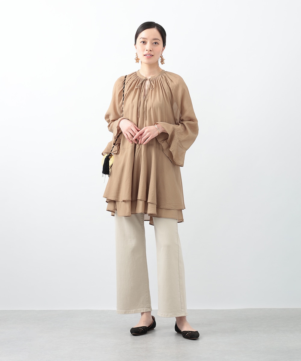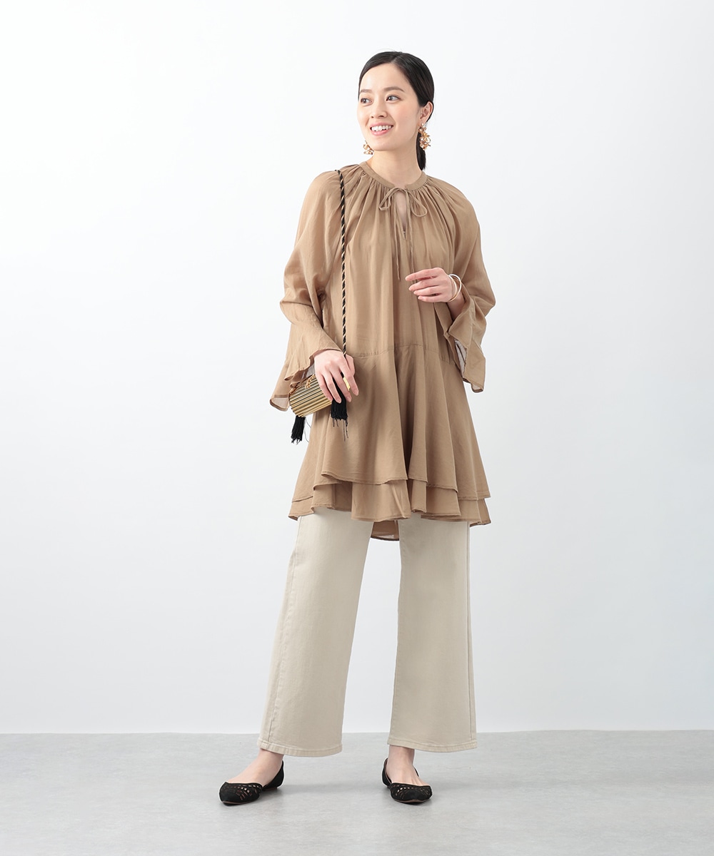 分量たっぷりのティアード切り替えで仕立てられたチュニックブラウス。スタイルアップ効果のあるハイウエストのデザインがすっきりとした着こなしを演出します。肌触りがやさしく軽やかなコットン素材を使用。シンプルなボトムスはもちろん、柄のパンツと合わせたスタイリングもおすすめです。
