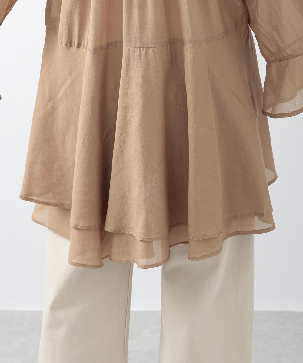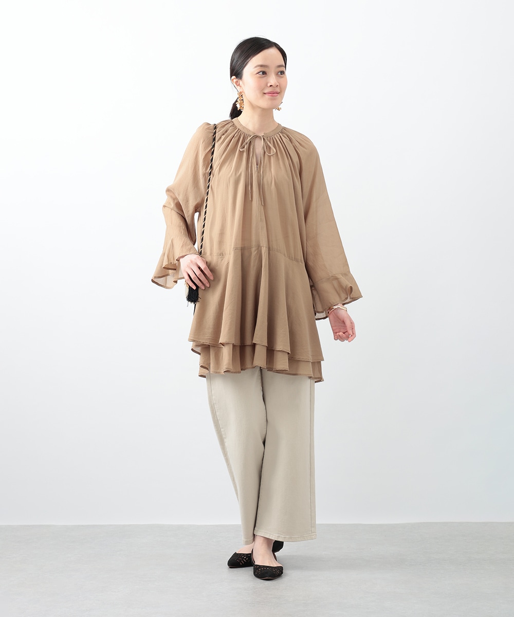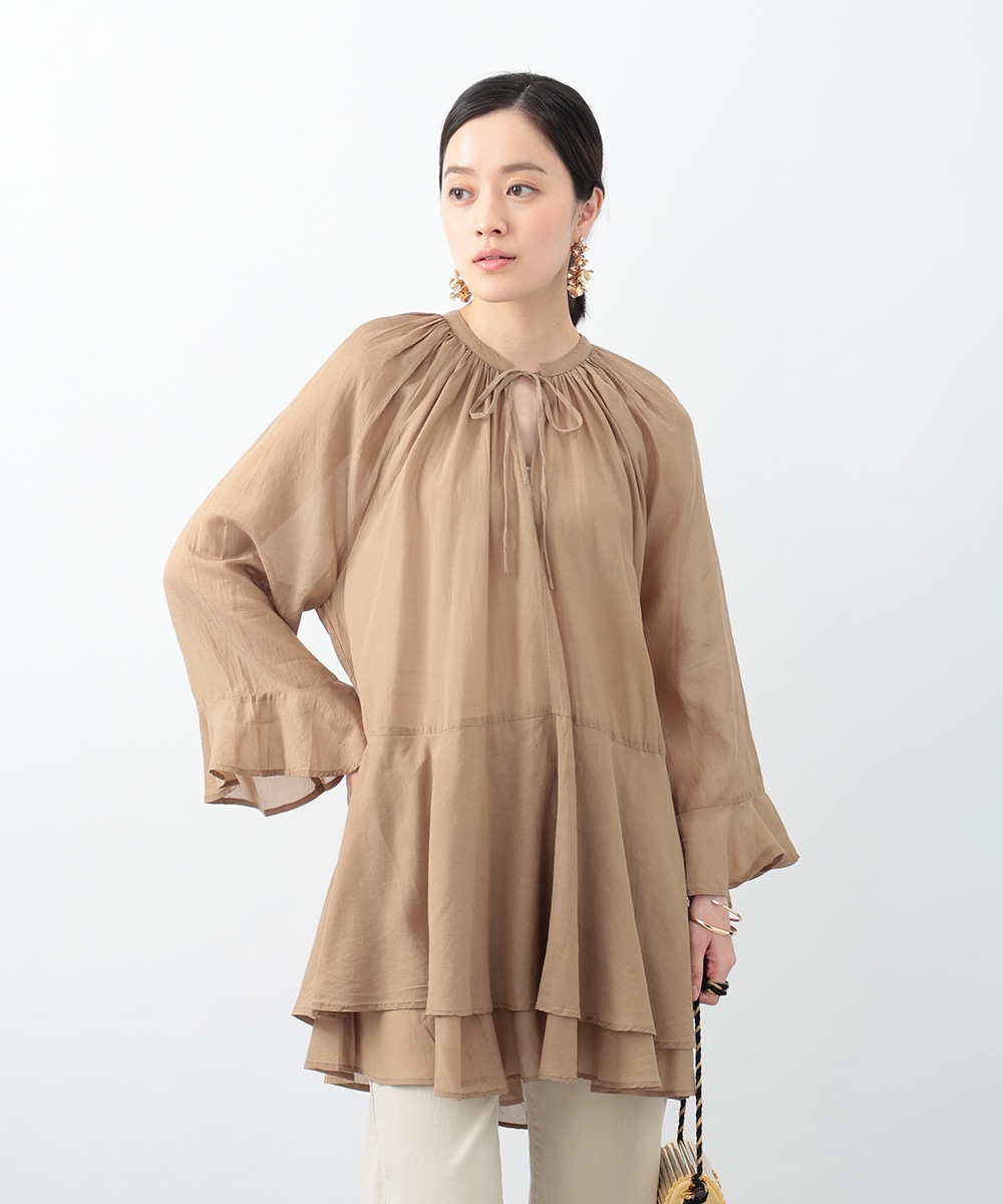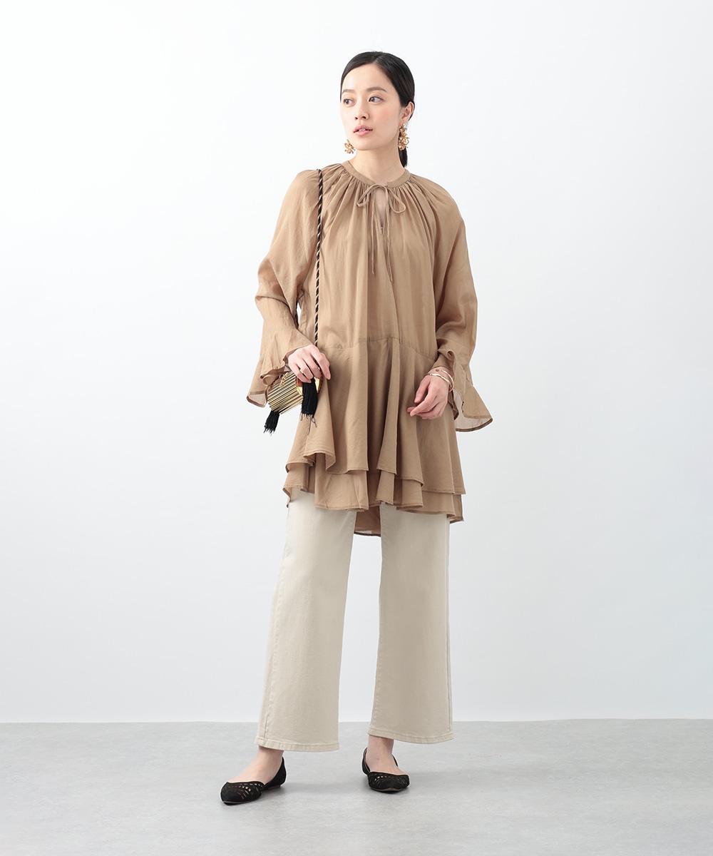 分量たっぷりのティアード切り替えで仕立てられたチュニックブラウス。スタイルアップ効果のあるハイウエストのデザインがすっきりとした着こなしを演出します。肌触りがやさしく軽やかなコットン素材を使用。シンプルなボトムスはもちろん、柄のパンツと合わせたスタイリングもおすすめです。