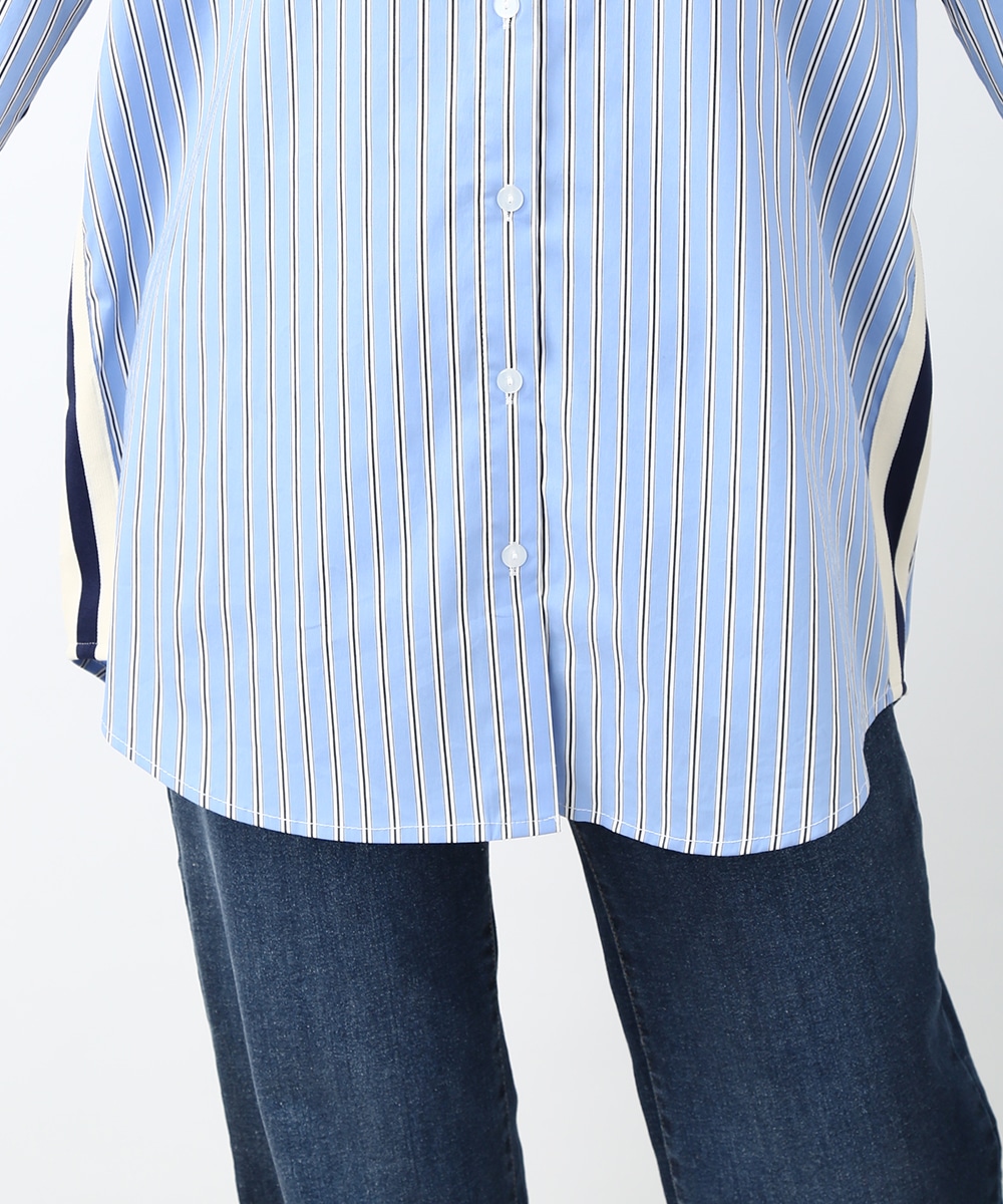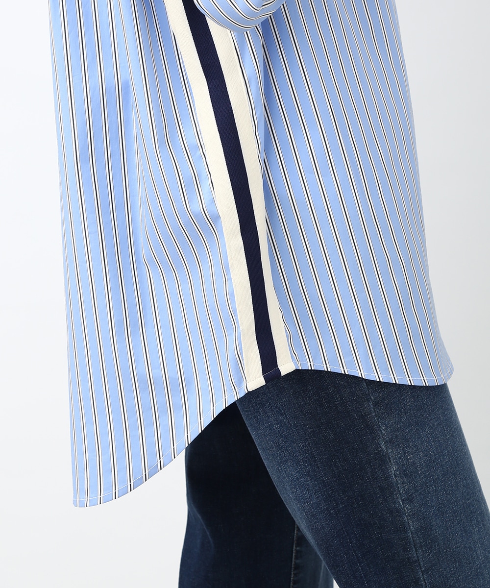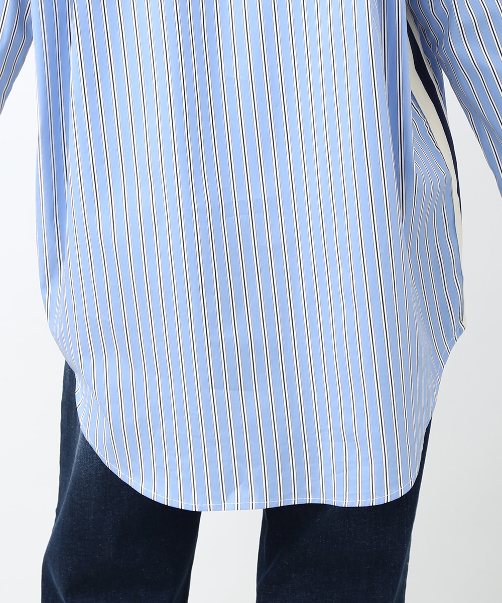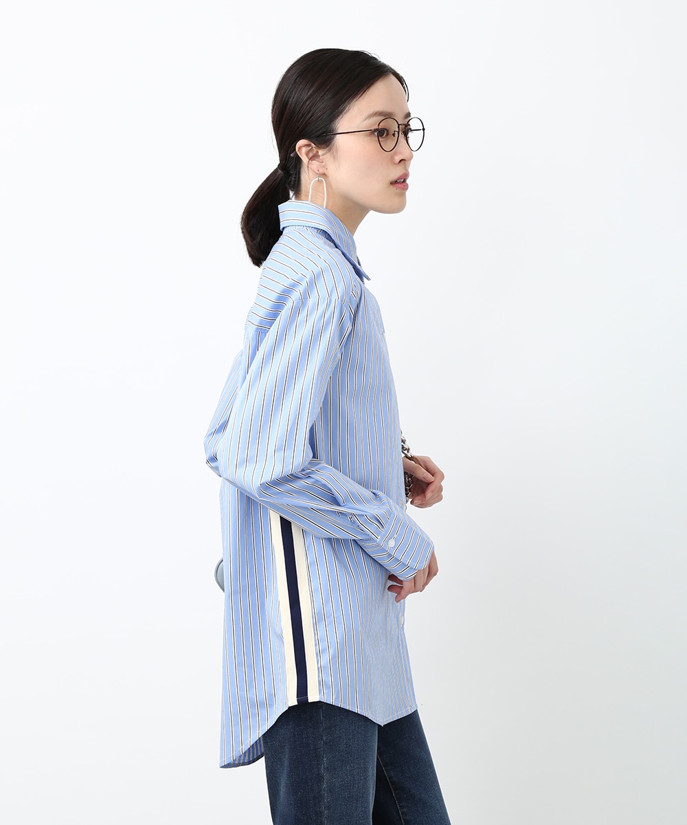 脇にライン入りのテープを施し、スポーティな要素を取り入れたストライプシャツ。ヒップにかかる丈感とゆとりのあるシルエットで、さらっと着るだけでバランスよくまとまるのもポイント。デニムパンツを穿いてラフに合わせたり、前を開けて羽織りとして取り入れることで、軽やかなレイヤードスタイルも楽しめます。