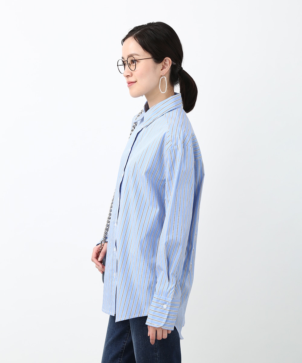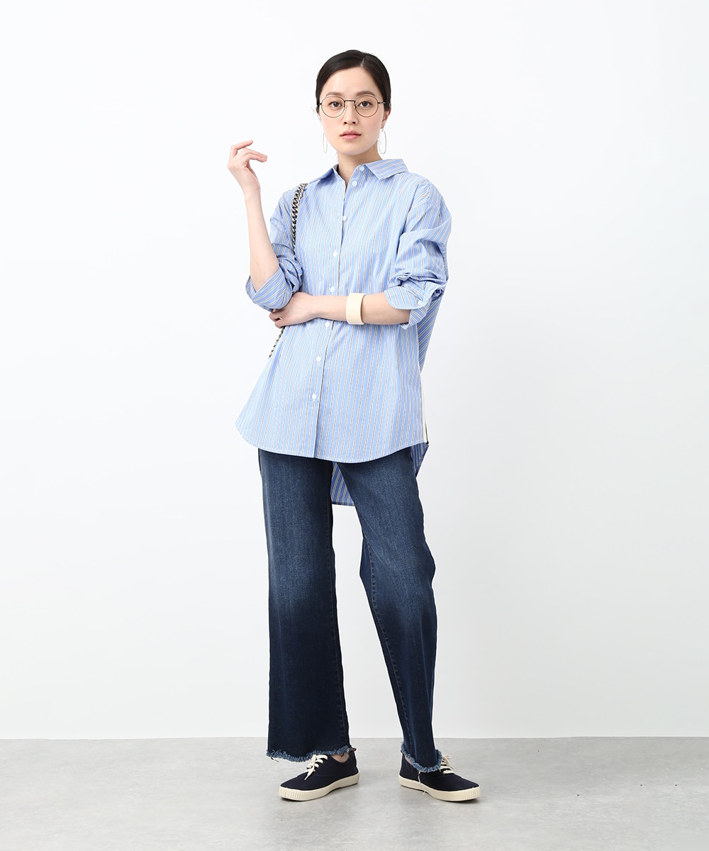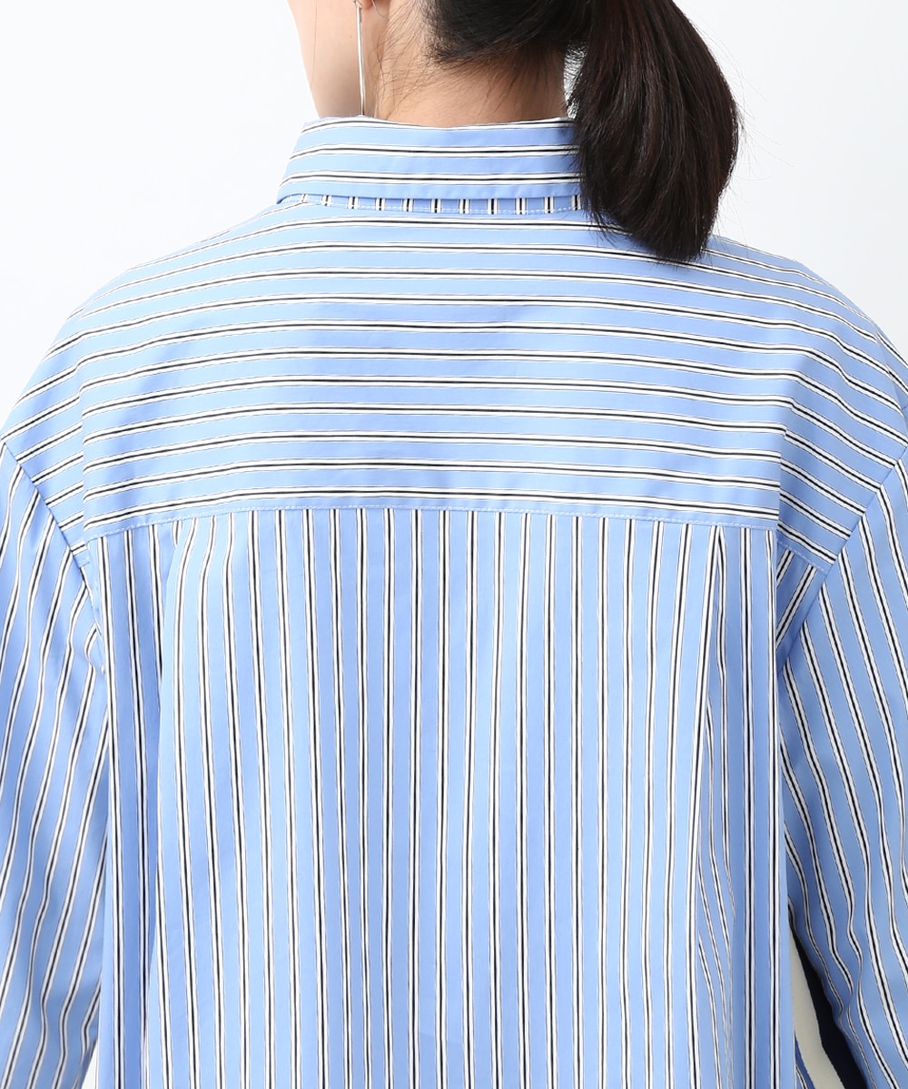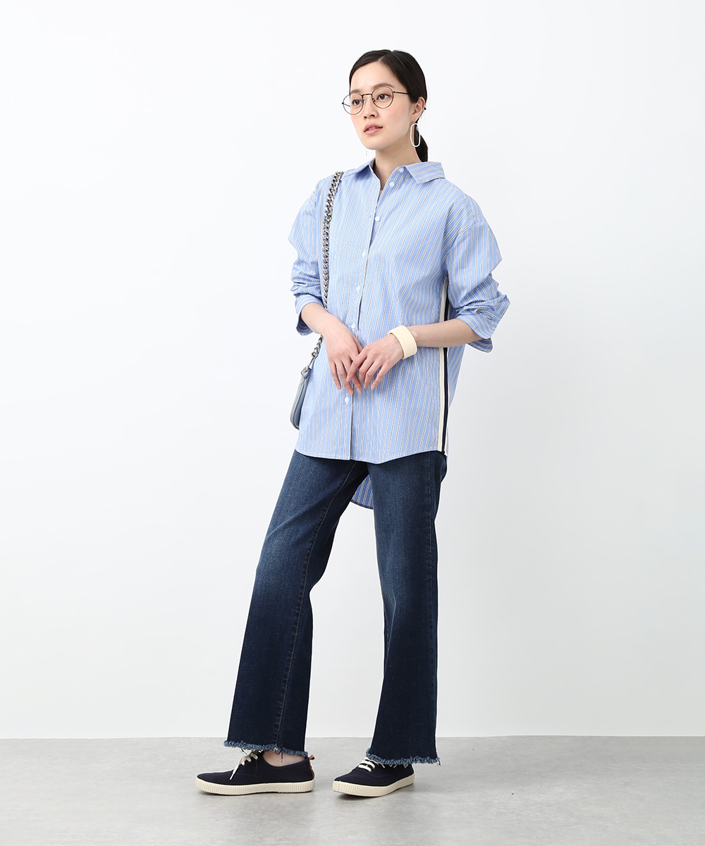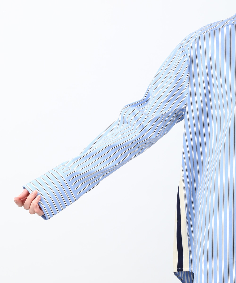 脇にライン入りのテープを施し、スポーティな要素を取り入れたストライプシャツ。ヒップにかかる丈感とゆとりのあるシルエットで、さらっと着るだけでバランスよくまとまるのもポイント。デニムパンツを穿いてラフに合わせたり、前を開けて羽織りとして取り入れることで、軽やかなレイヤードスタイルも楽しめます。