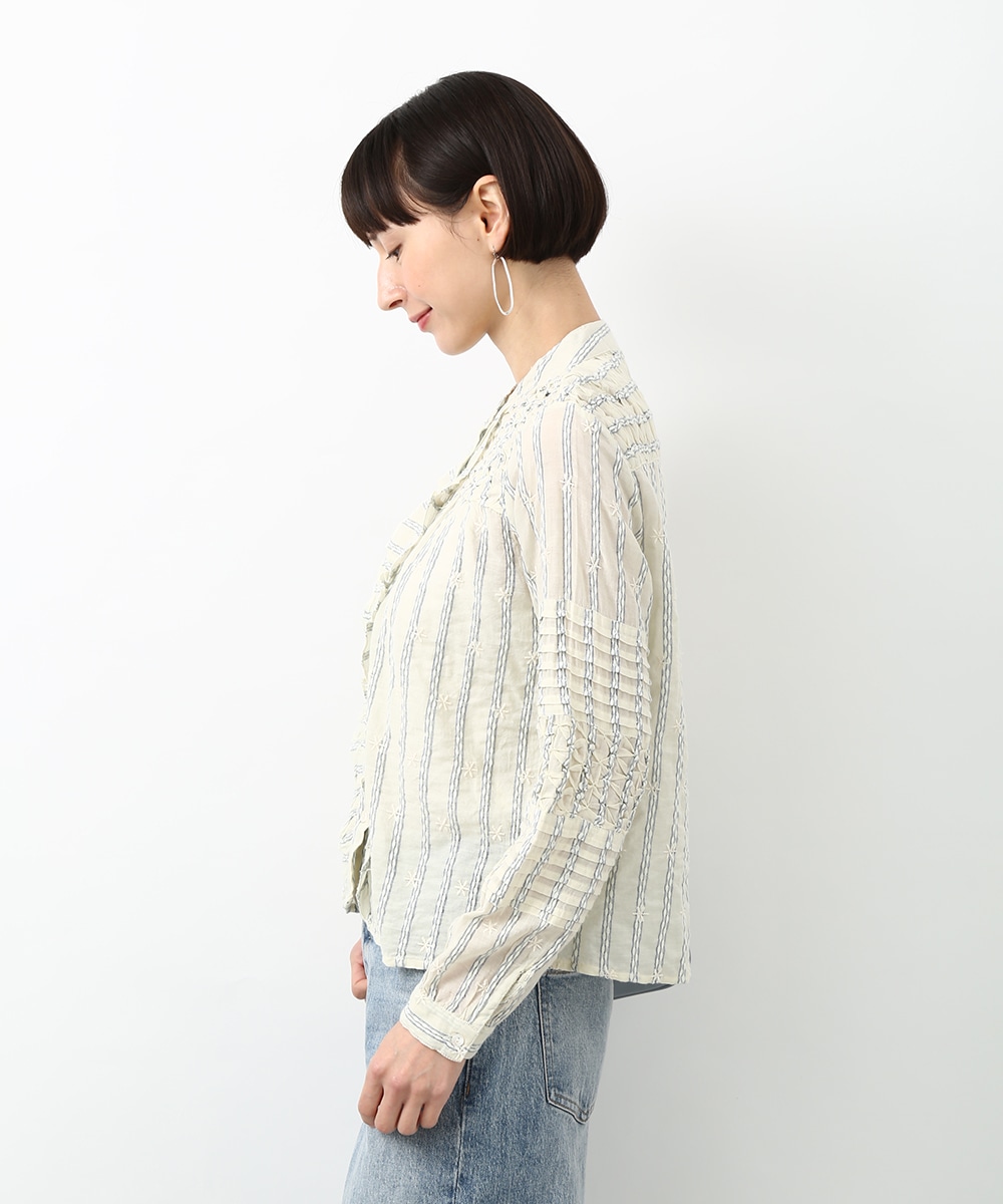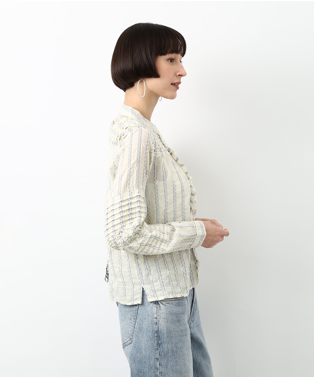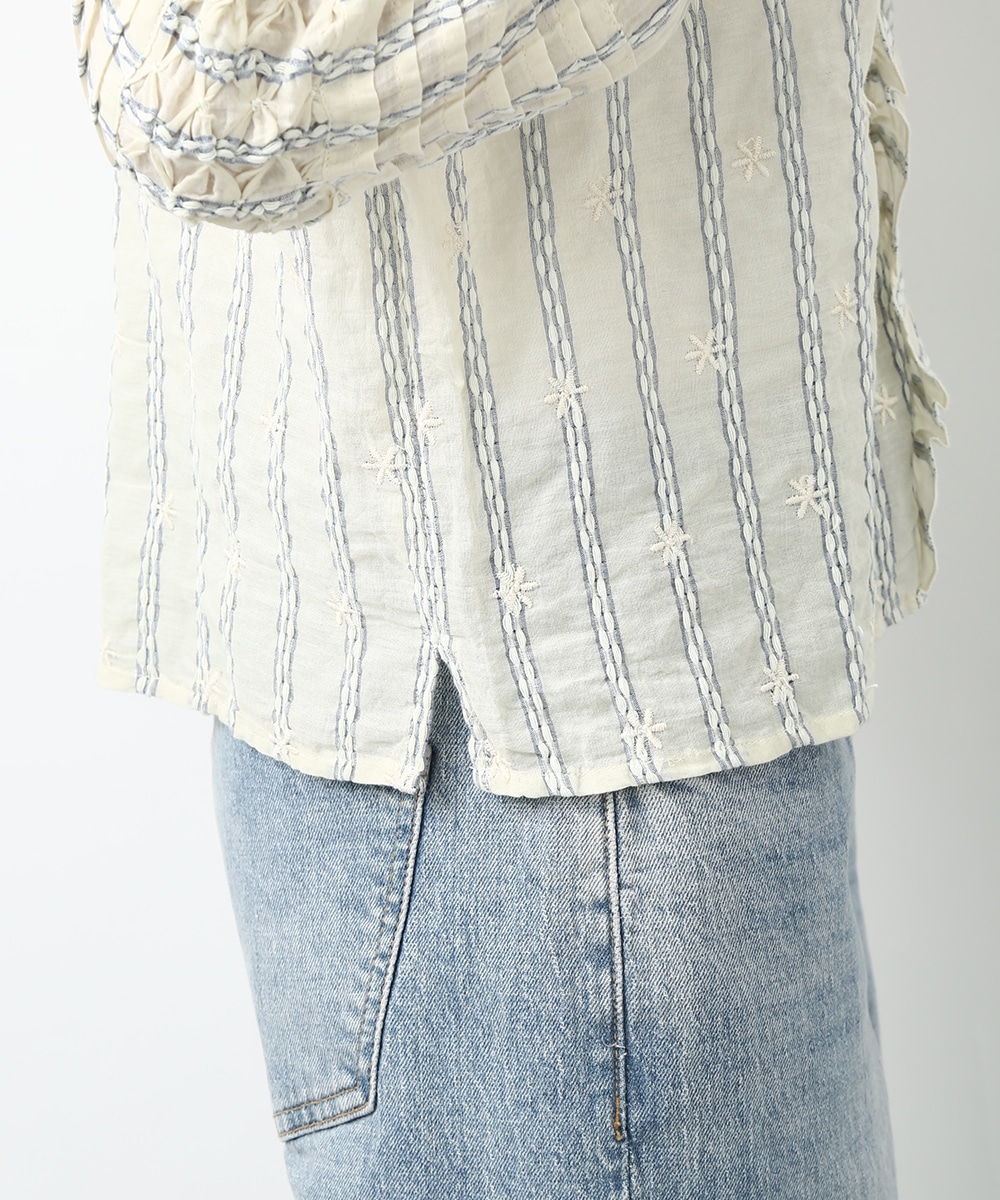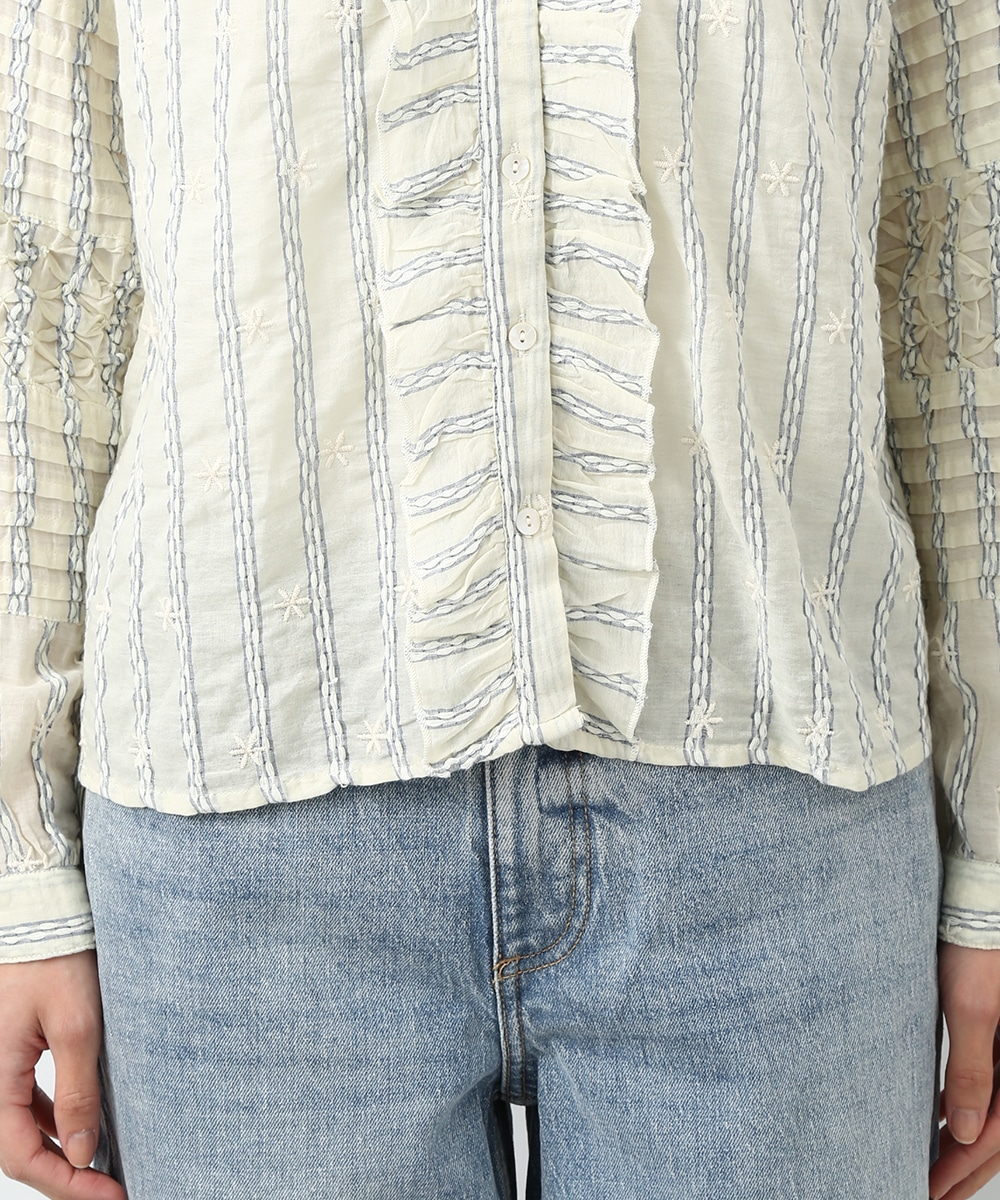 前立てに大胆なフリルをあしらった刺繍ブラウス。ストライプと刺繍の表情にフリルが重なり、奥行きのある印象に仕上げています。甘さを抑えたデザインですっきりとしたバランスで着られるのもポイント。デニムを穿いてカジュアルにまとめた、ほどよく抜け感のある着こなしもおすすめです。