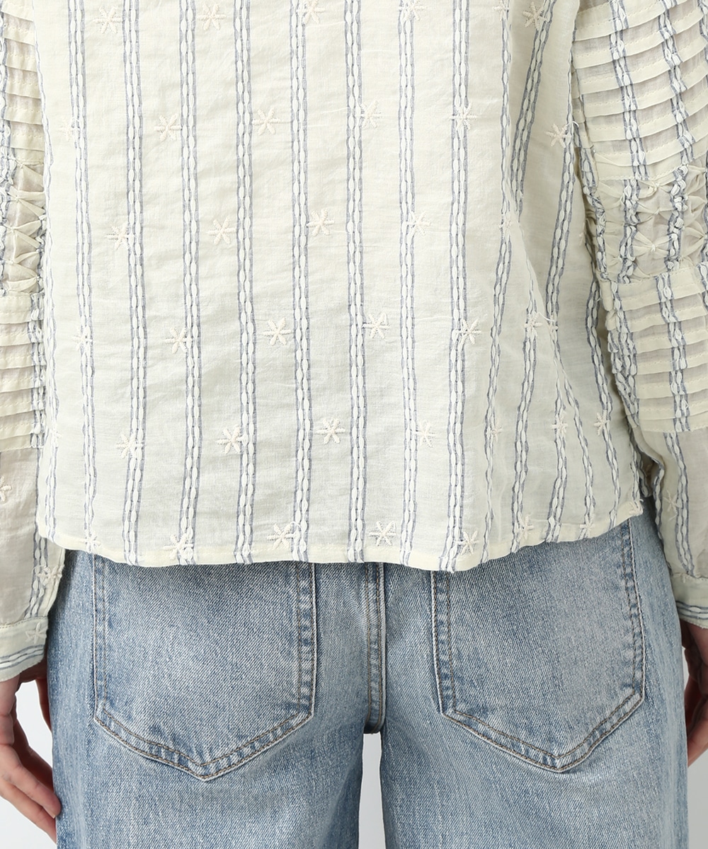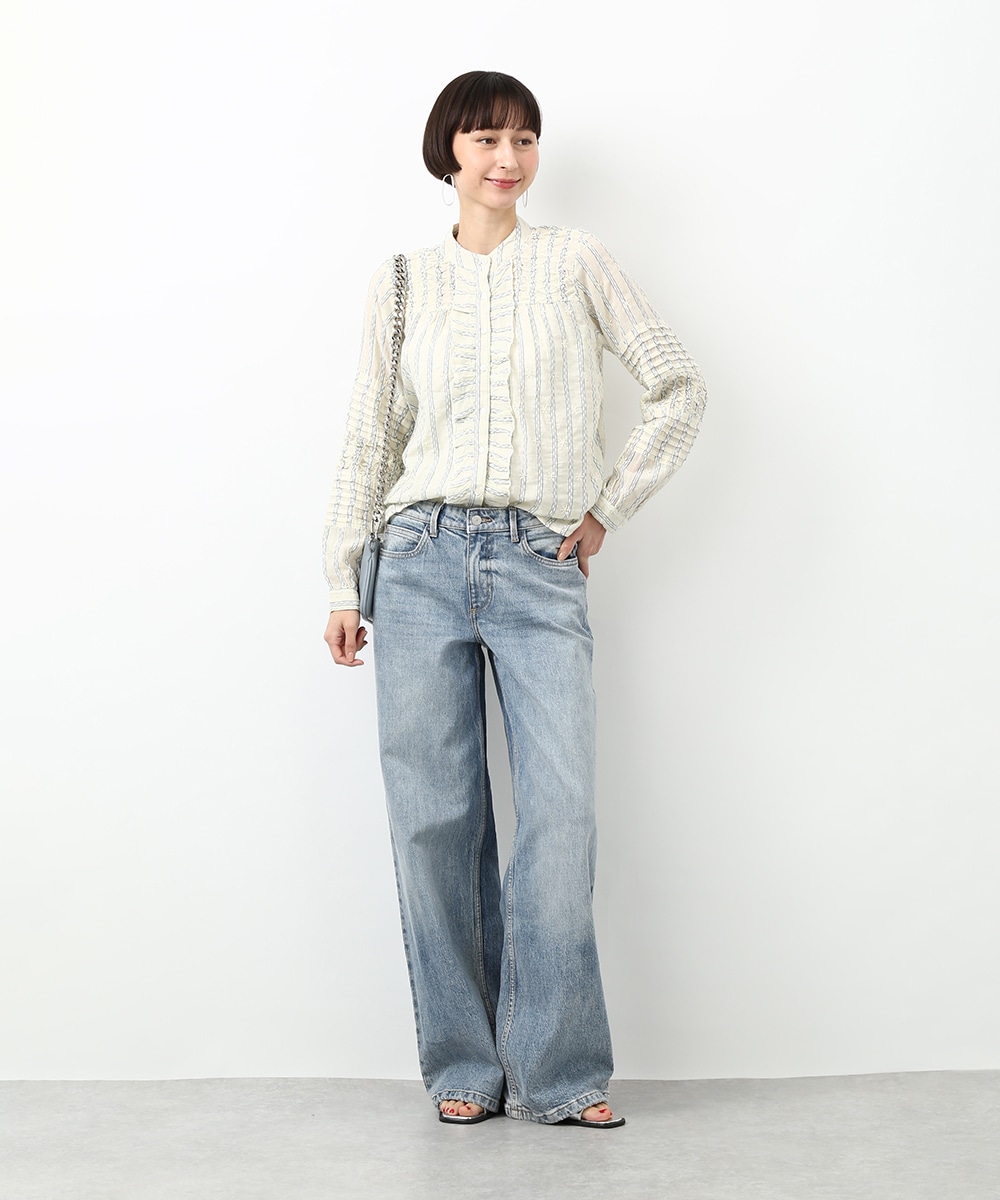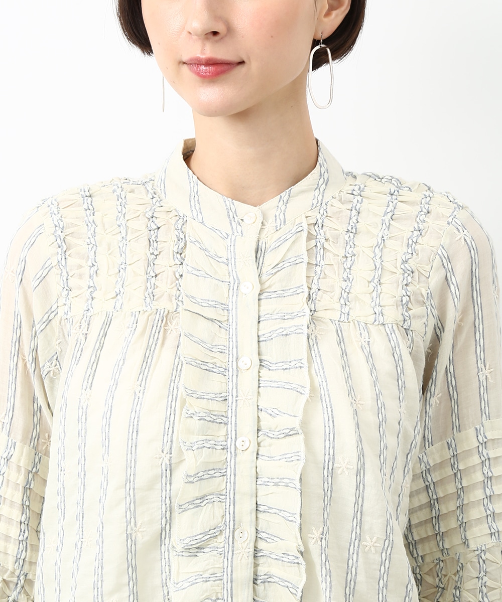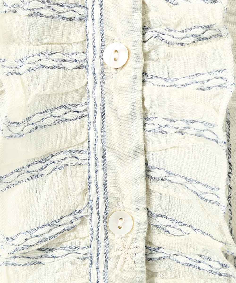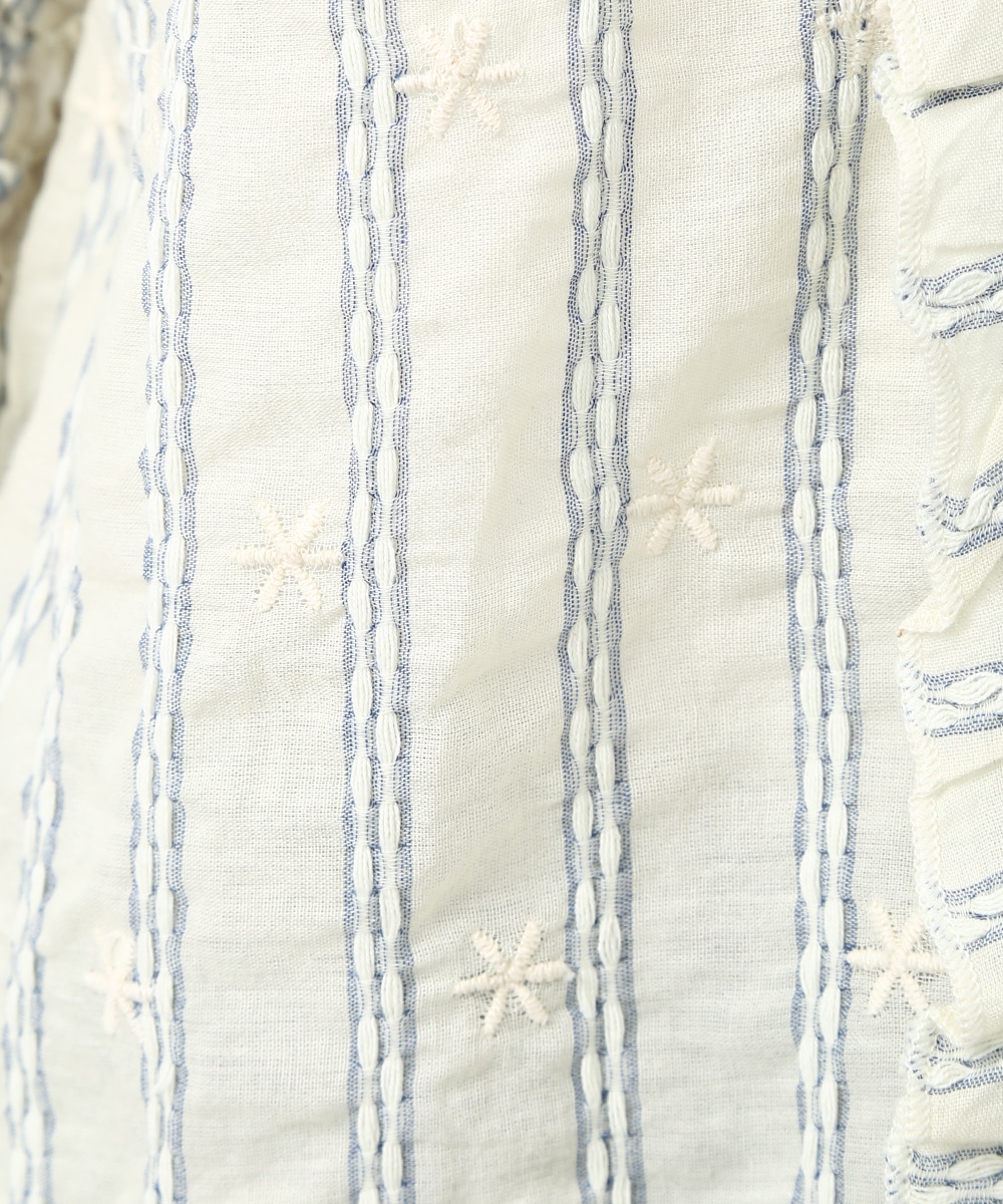 前立てに大胆なフリルをあしらった刺繍ブラウス。ストライプと刺繍の表情にフリルが重なり、奥行きのある印象に仕上げています。甘さを抑えたデザインですっきりとしたバランスで着られるのもポイント。デニムを穿いてカジュアルにまとめた、ほどよく抜け感のある着こなしもおすすめです。