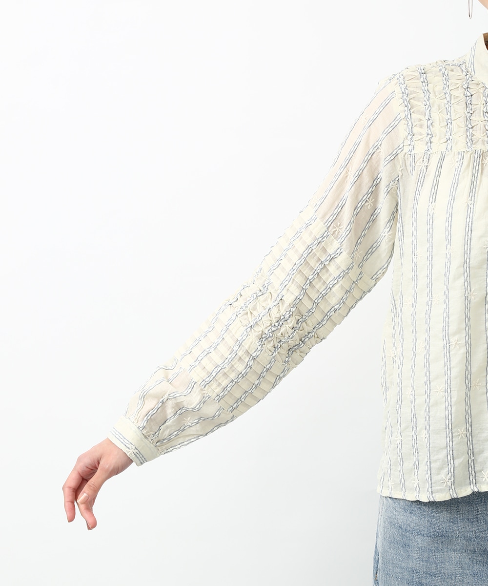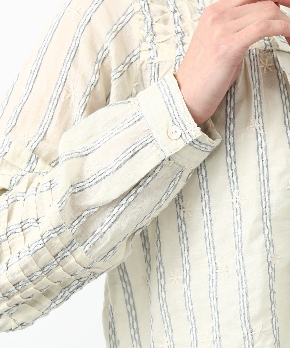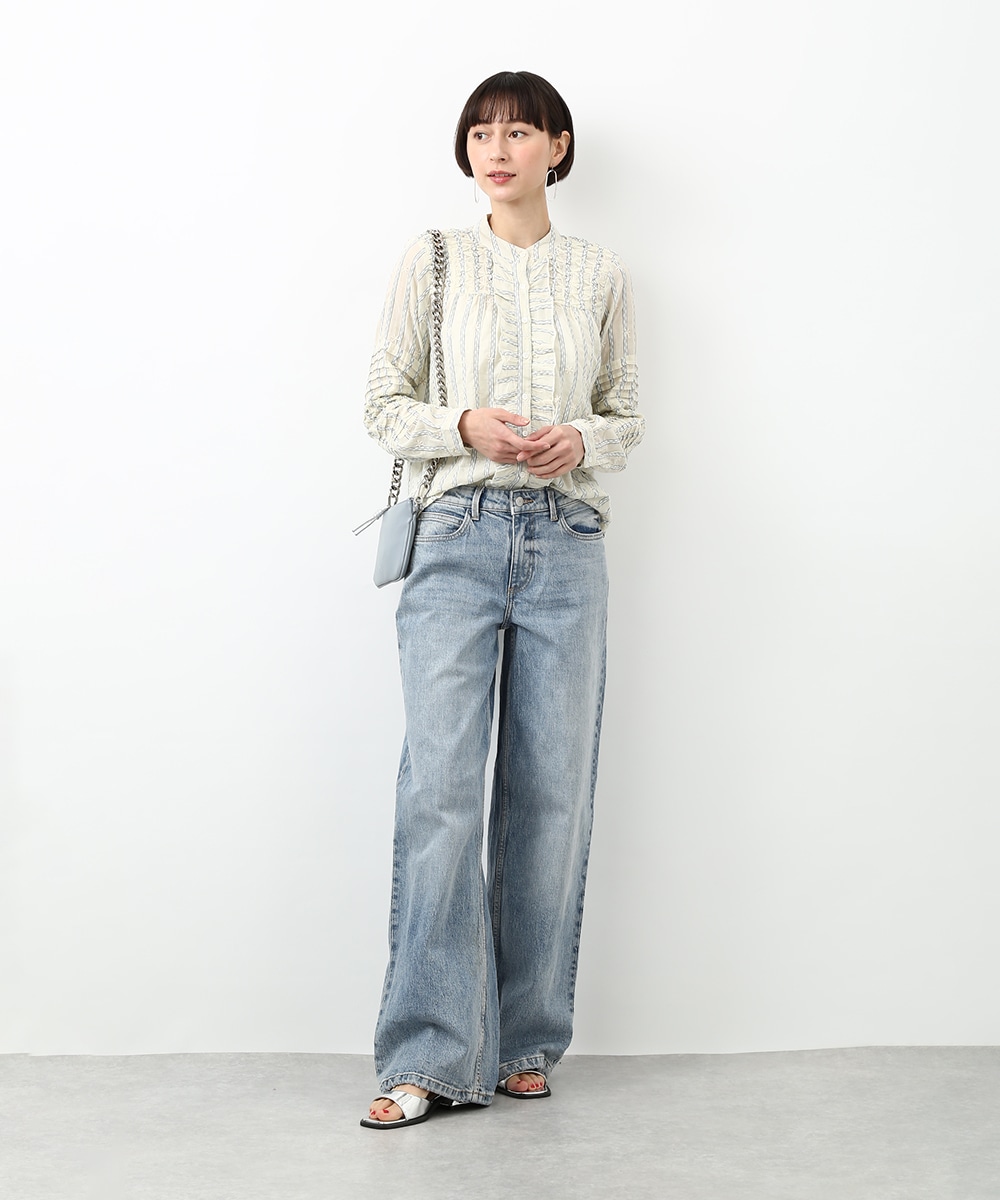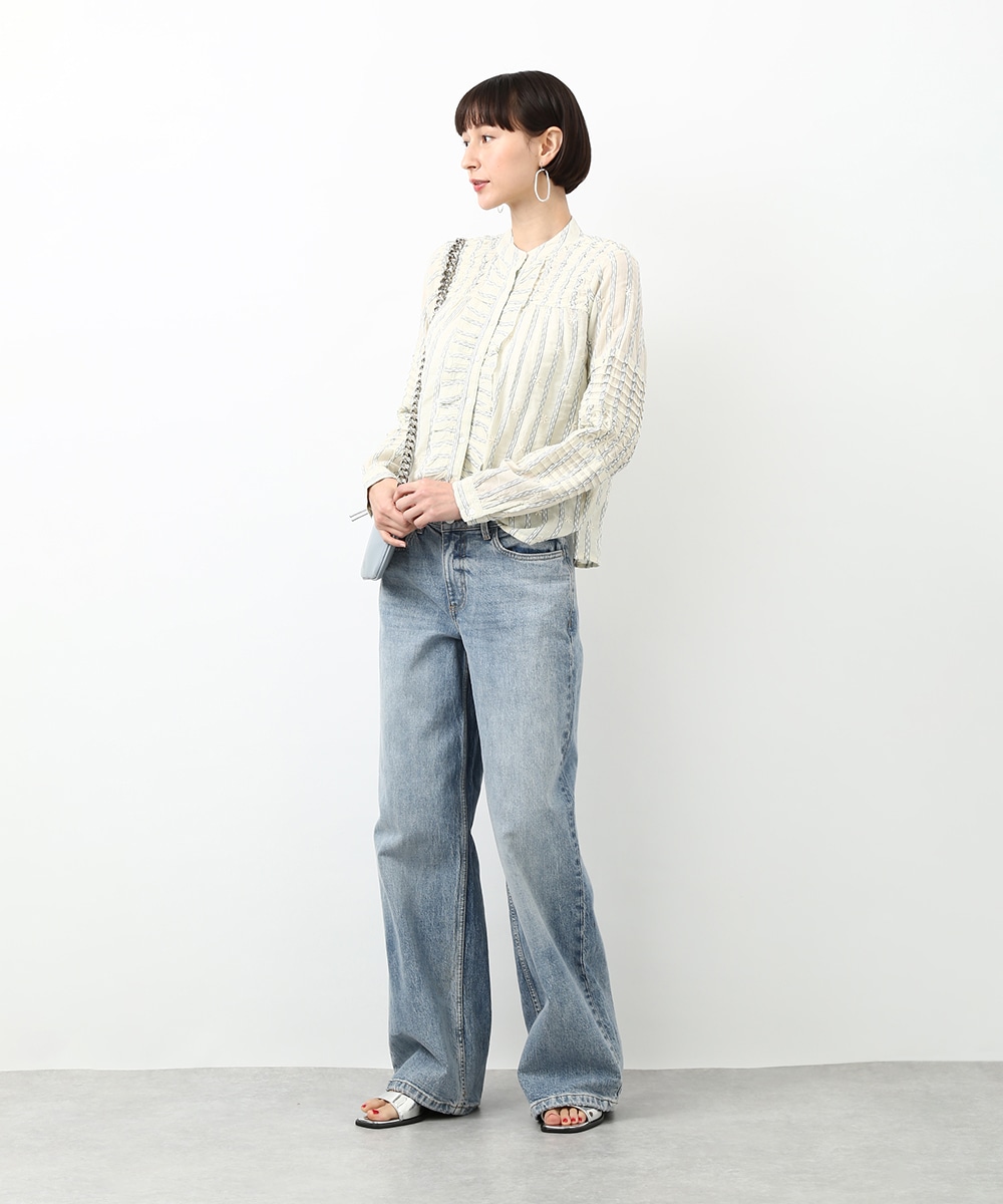 前立てに大胆なフリルをあしらった刺繍ブラウス。ストライプと刺繍の表情にフリルが重なり、奥行きのある印象に仕上げています。甘さを抑えたデザインですっきりとしたバランスで着られるのもポイント。デニムを穿いてカジュアルにまとめた、ほどよく抜け感のある着こなしもおすすめです。
