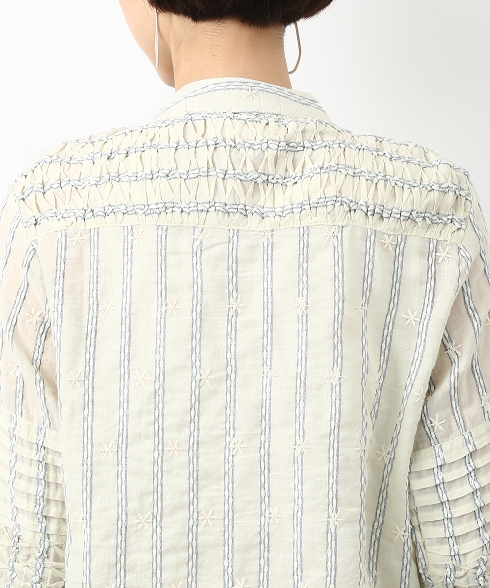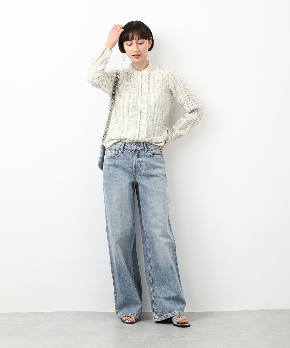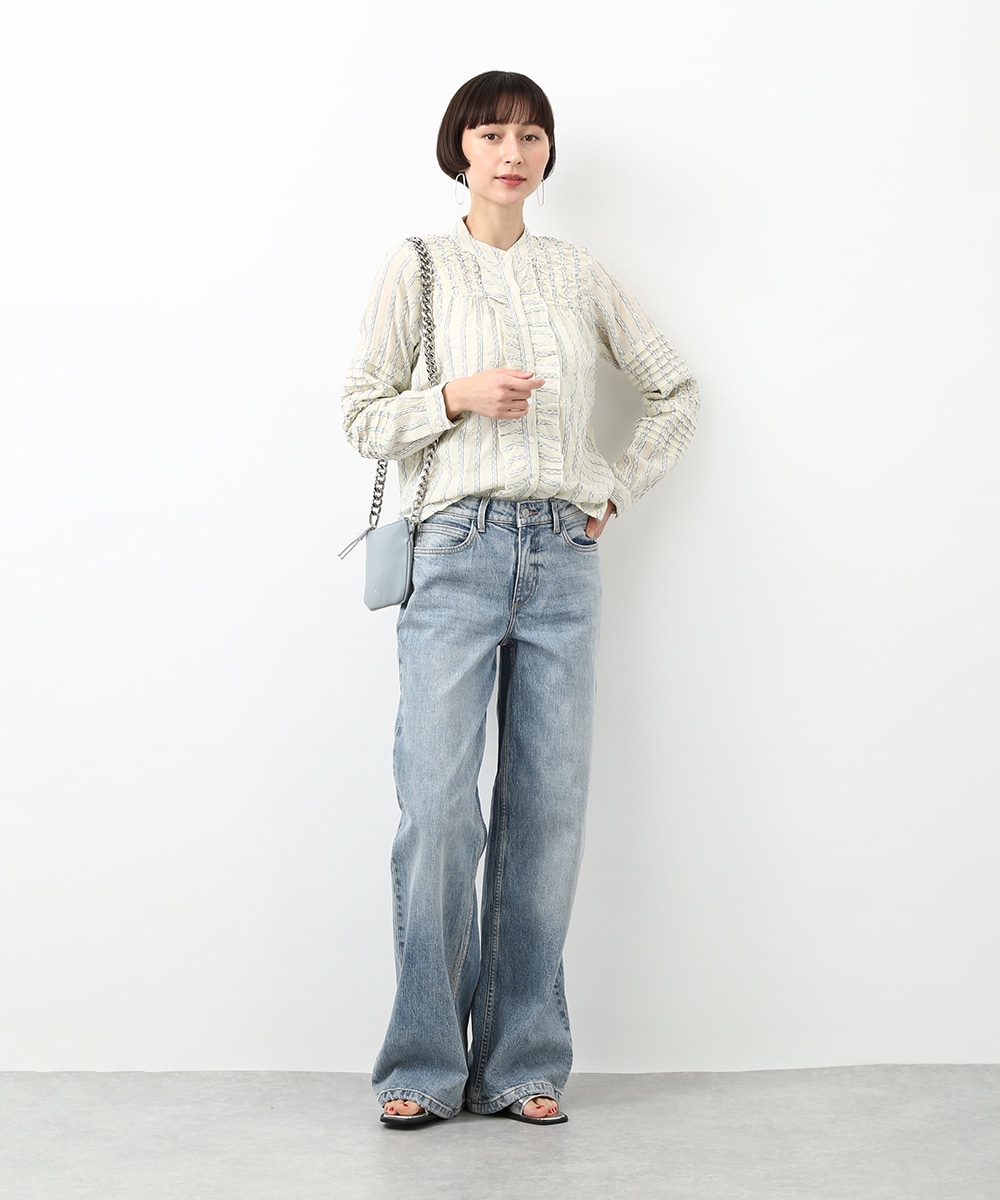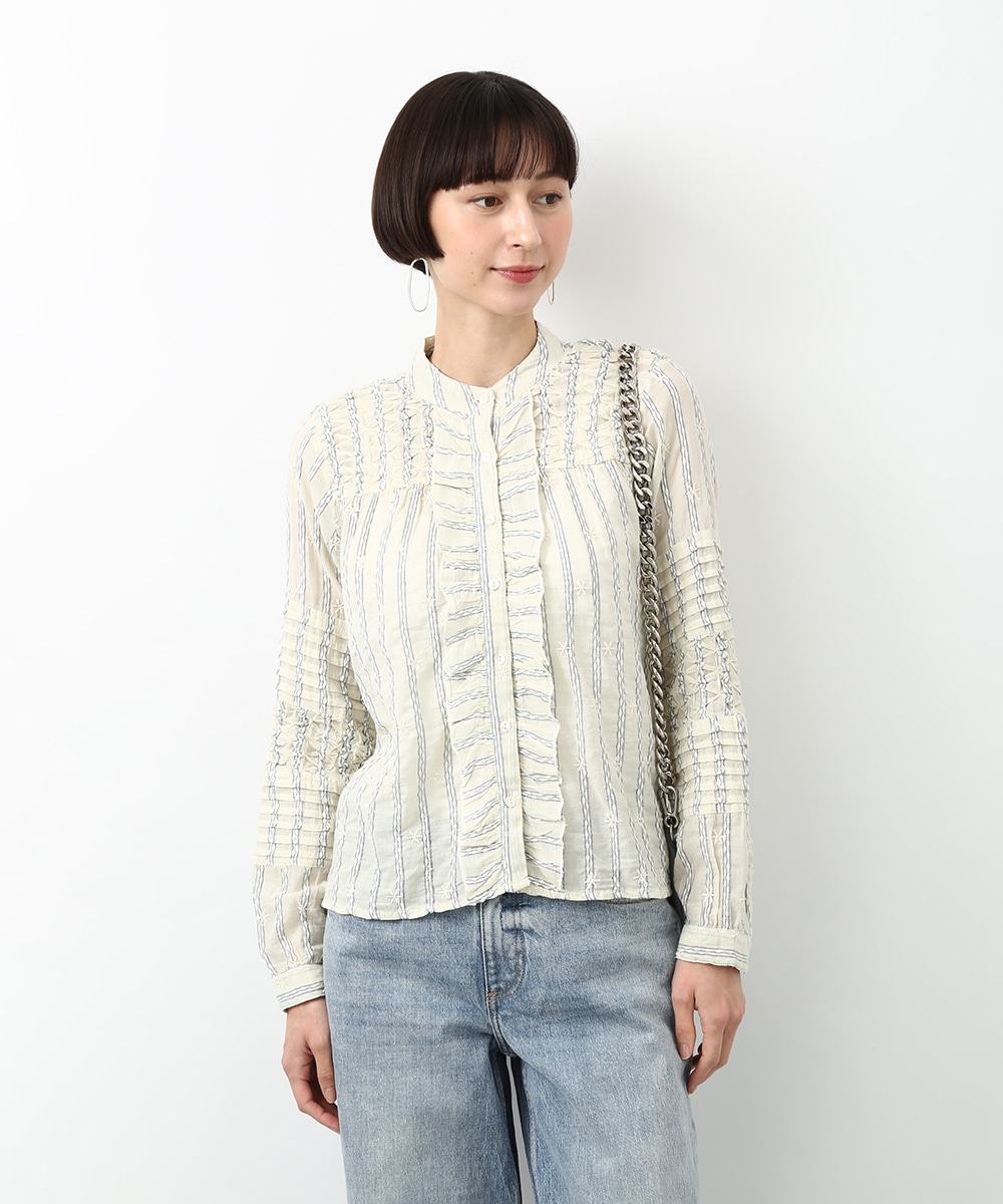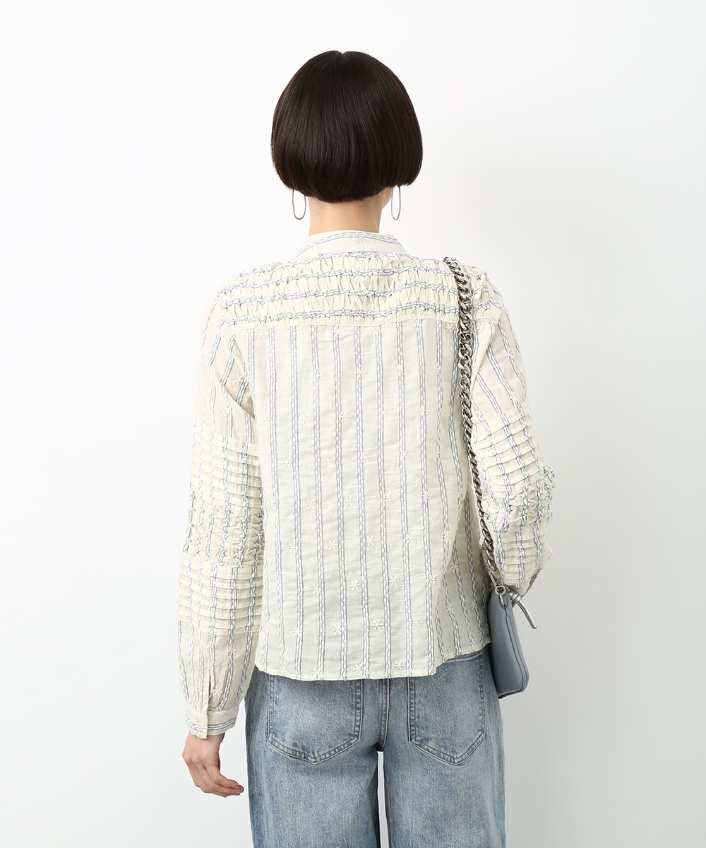 前立てに大胆なフリルをあしらった刺繍ブラウス。ストライプと刺繍の表情にフリルが重なり、奥行きのある印象に仕上げています。甘さを抑えたデザインですっきりとしたバランスで着られるのもポイント。デニムを穿いてカジュアルにまとめた、ほどよく抜け感のある着こなしもおすすめです。