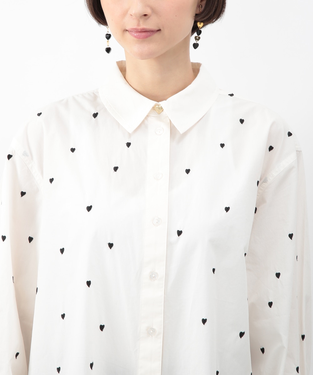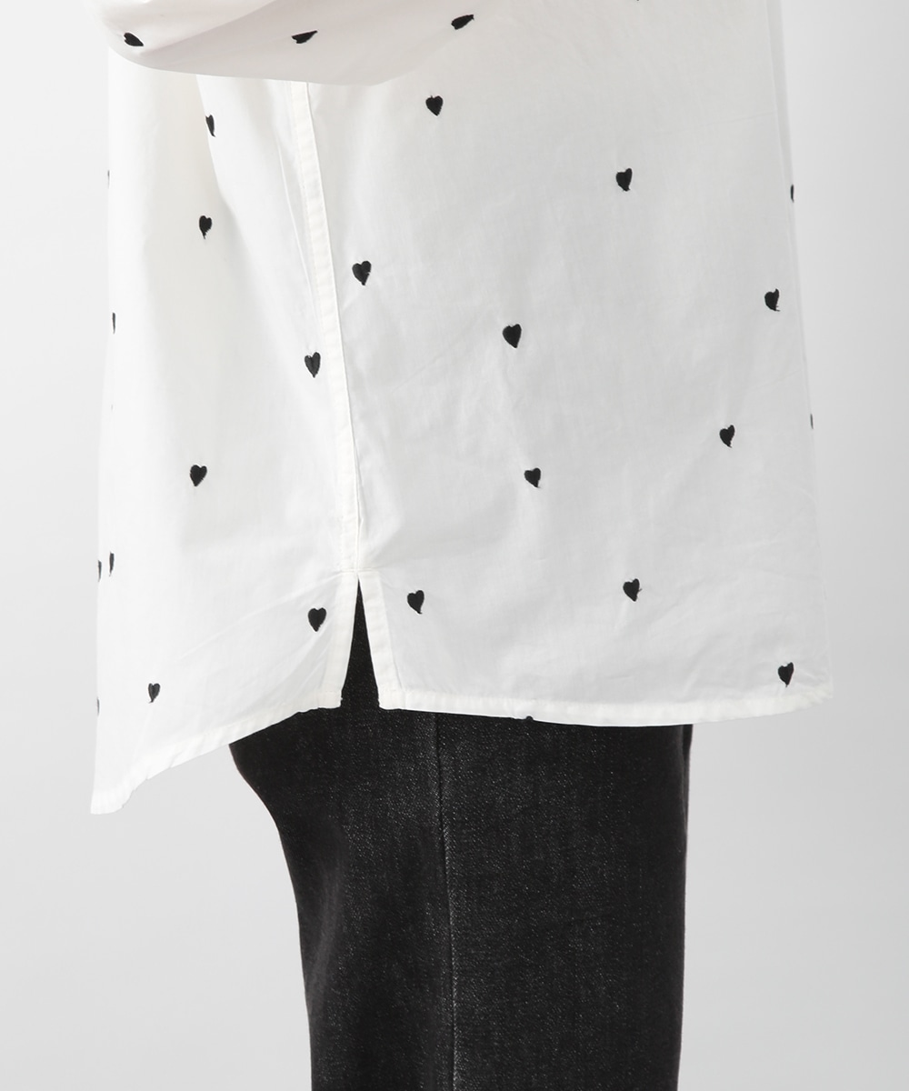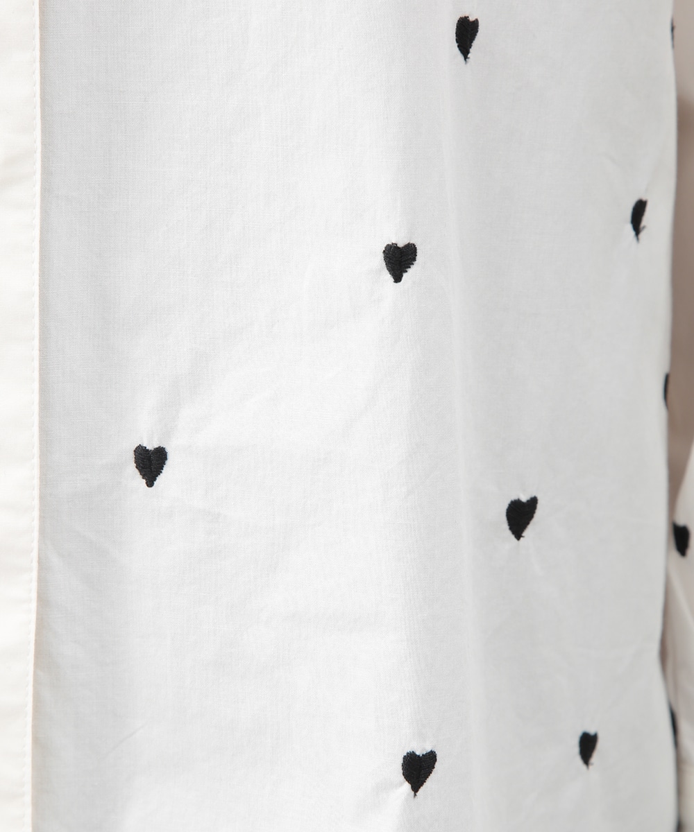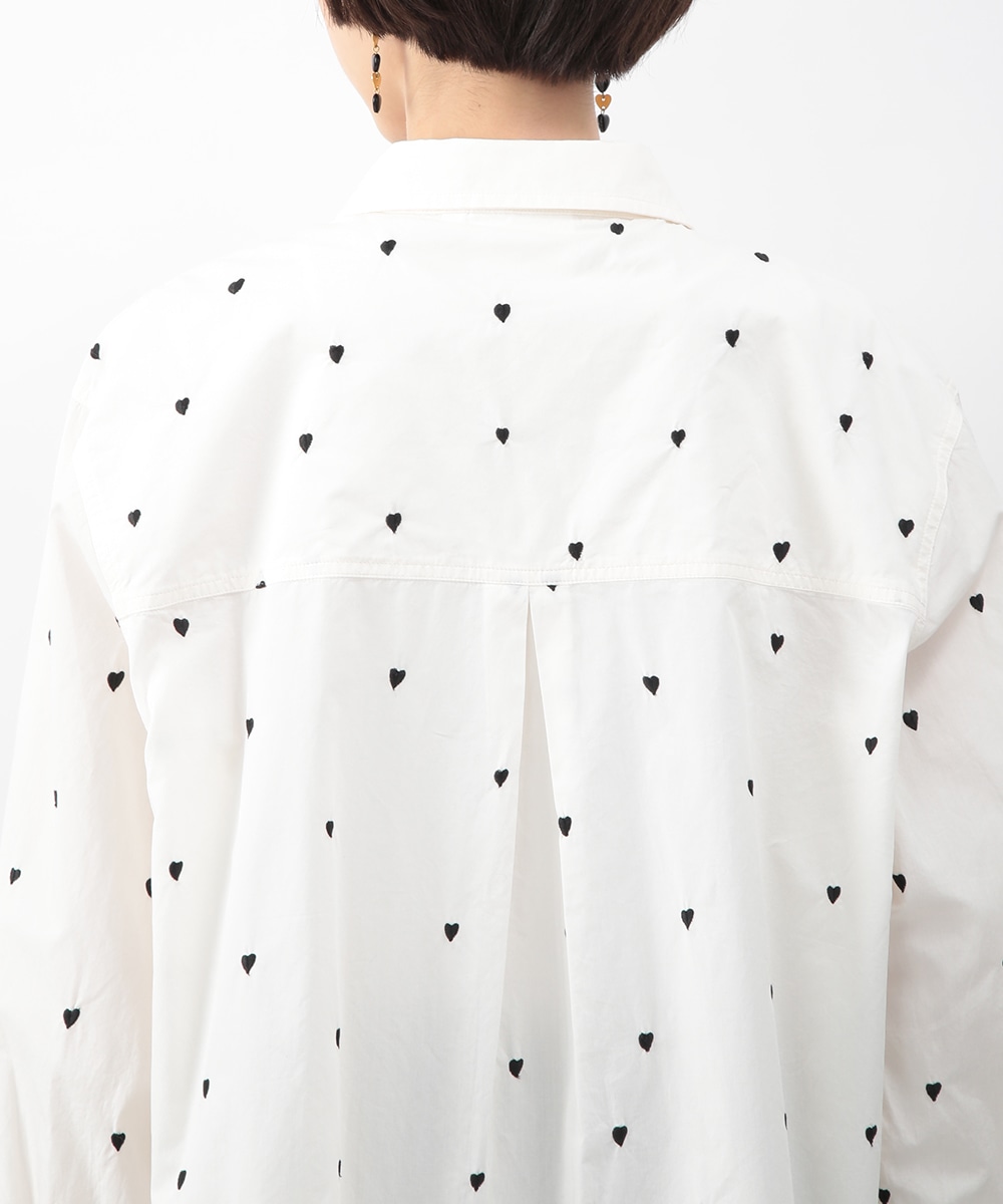 ブラックのハート刺しゅうを散りばめたコットンシャツ。甘さを抑えたモチーフがさりげないアクセントになり、大人らしい印象で着こなせます。後ろをやや長めに設計し、ヒップまわりをカバーしやすい丈感も魅力。ボタンを閉めて一枚で、軽い羽織りとしても取り入れやすく、デニムやスカートと幅広く合わせられるアイテムです。