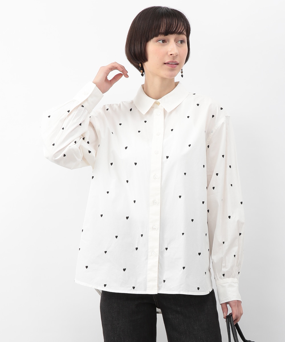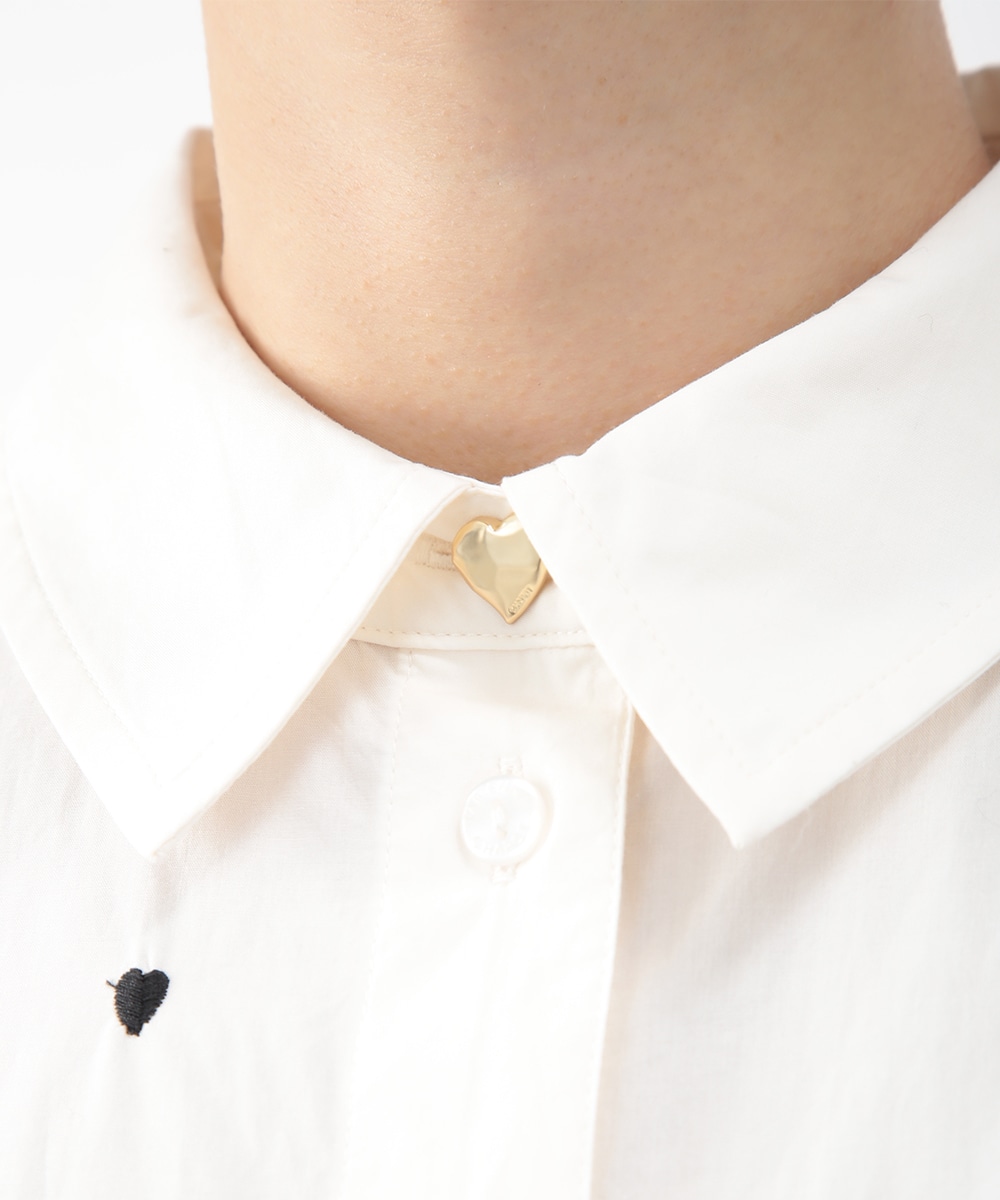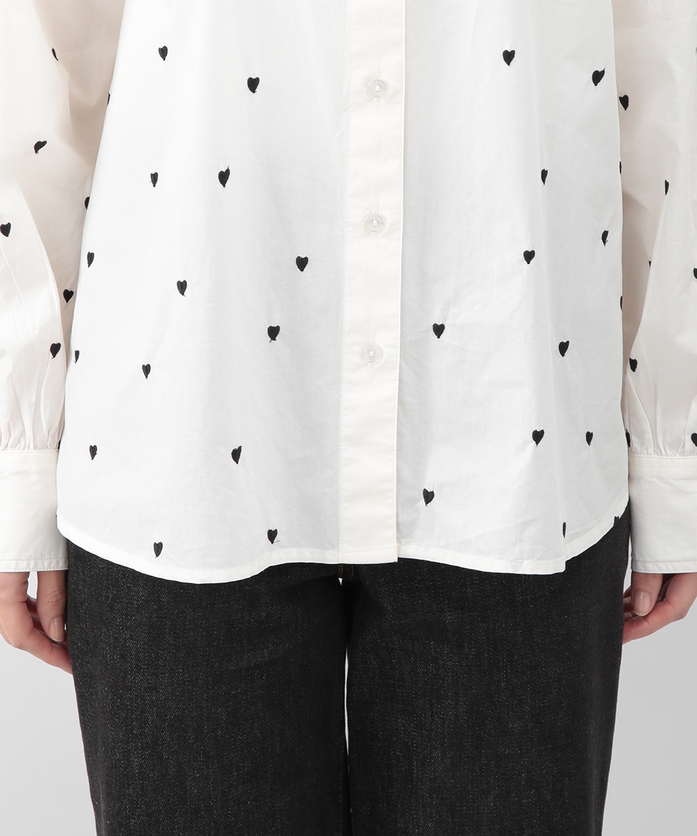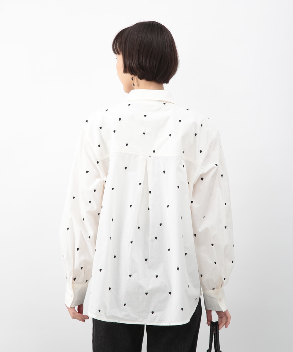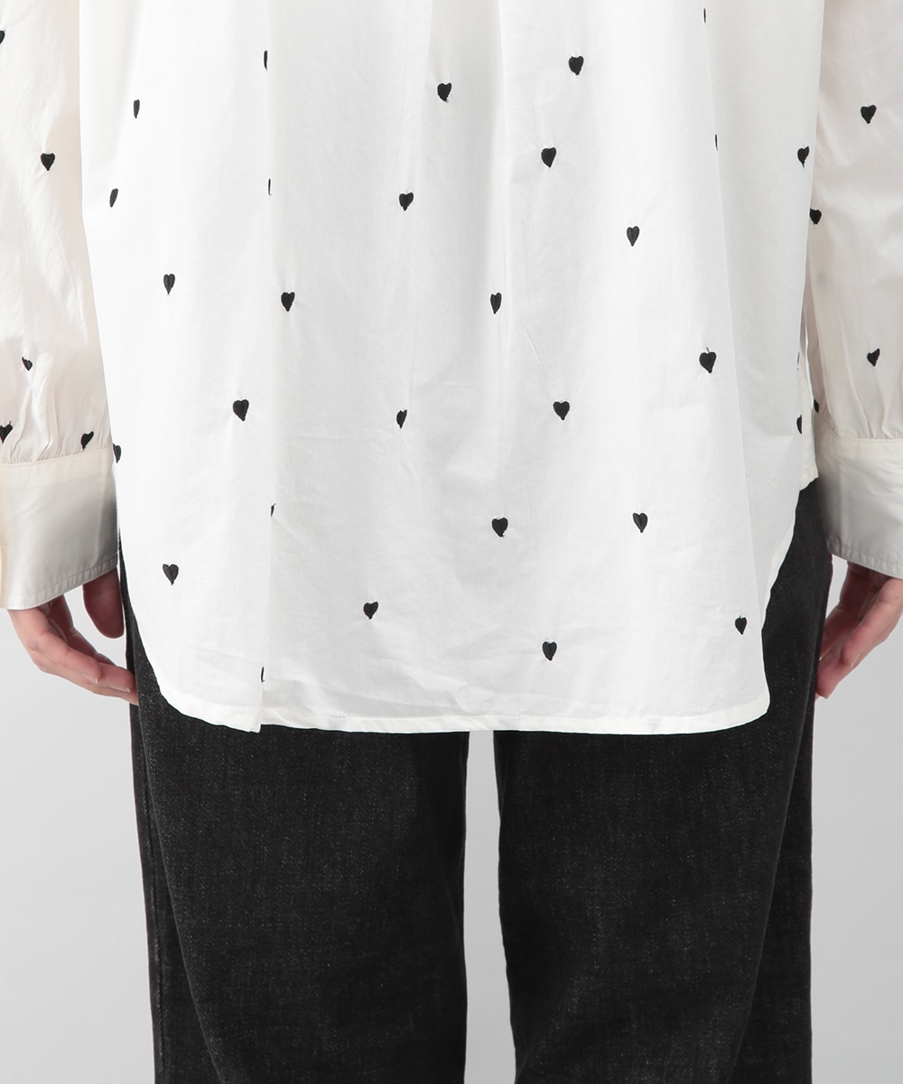 ブラックのハート刺しゅうを散りばめたコットンシャツ。甘さを抑えたモチーフがさりげないアクセントになり、大人らしい印象で着こなせます。後ろをやや長めに設計し、ヒップまわりをカバーしやすい丈感も魅力。ボタンを閉めて一枚で、軽い羽織りとしても取り入れやすく、デニムやスカートと幅広く合わせられるアイテムです。