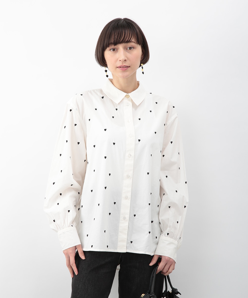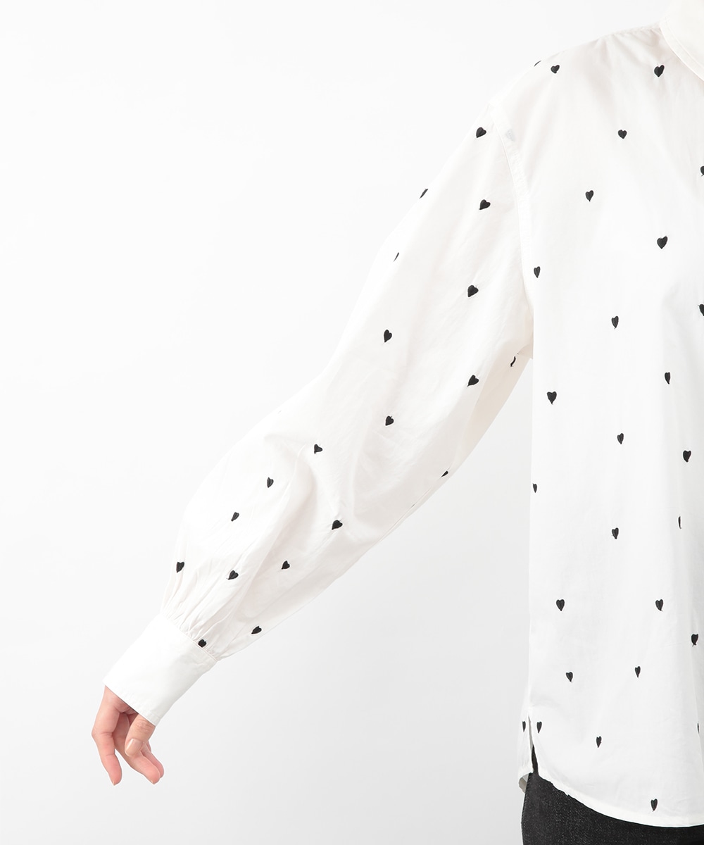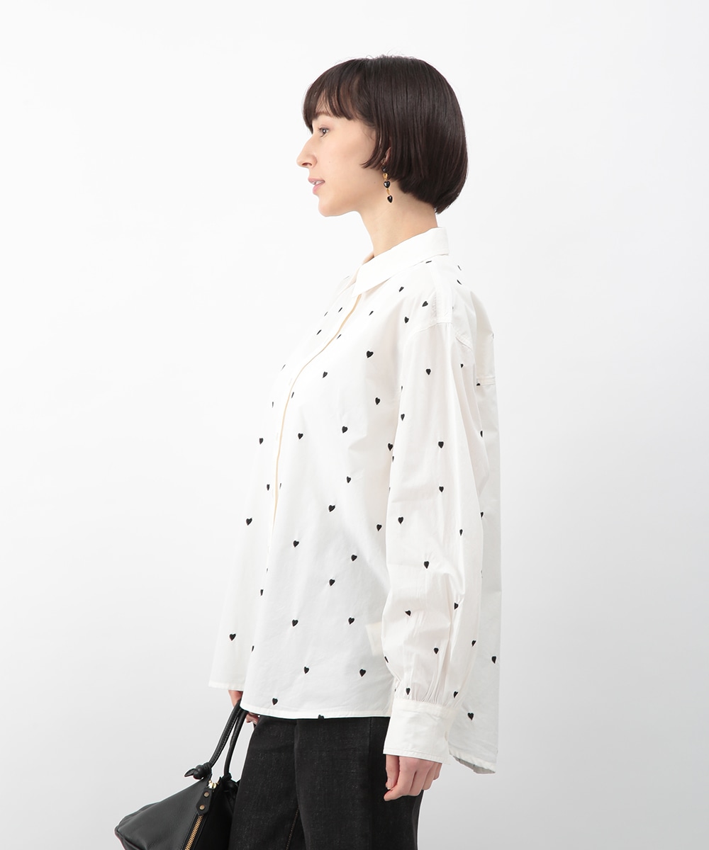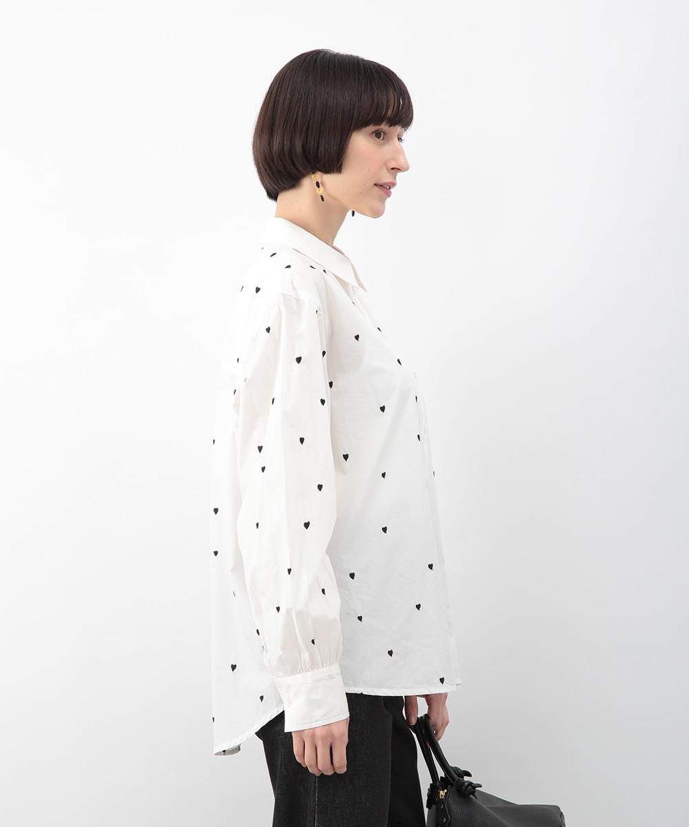 ブラックのハート刺しゅうを散りばめたコットンシャツ。甘さを抑えたモチーフがさりげないアクセントになり、大人らしい印象で着こなせます。後ろをやや長めに設計し、ヒップまわりをカバーしやすい丈感も魅力。ボタンを閉めて一枚で、軽い羽織りとしても取り入れやすく、デニムやスカートと幅広く合わせられるアイテムです。