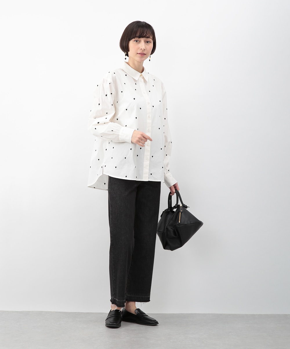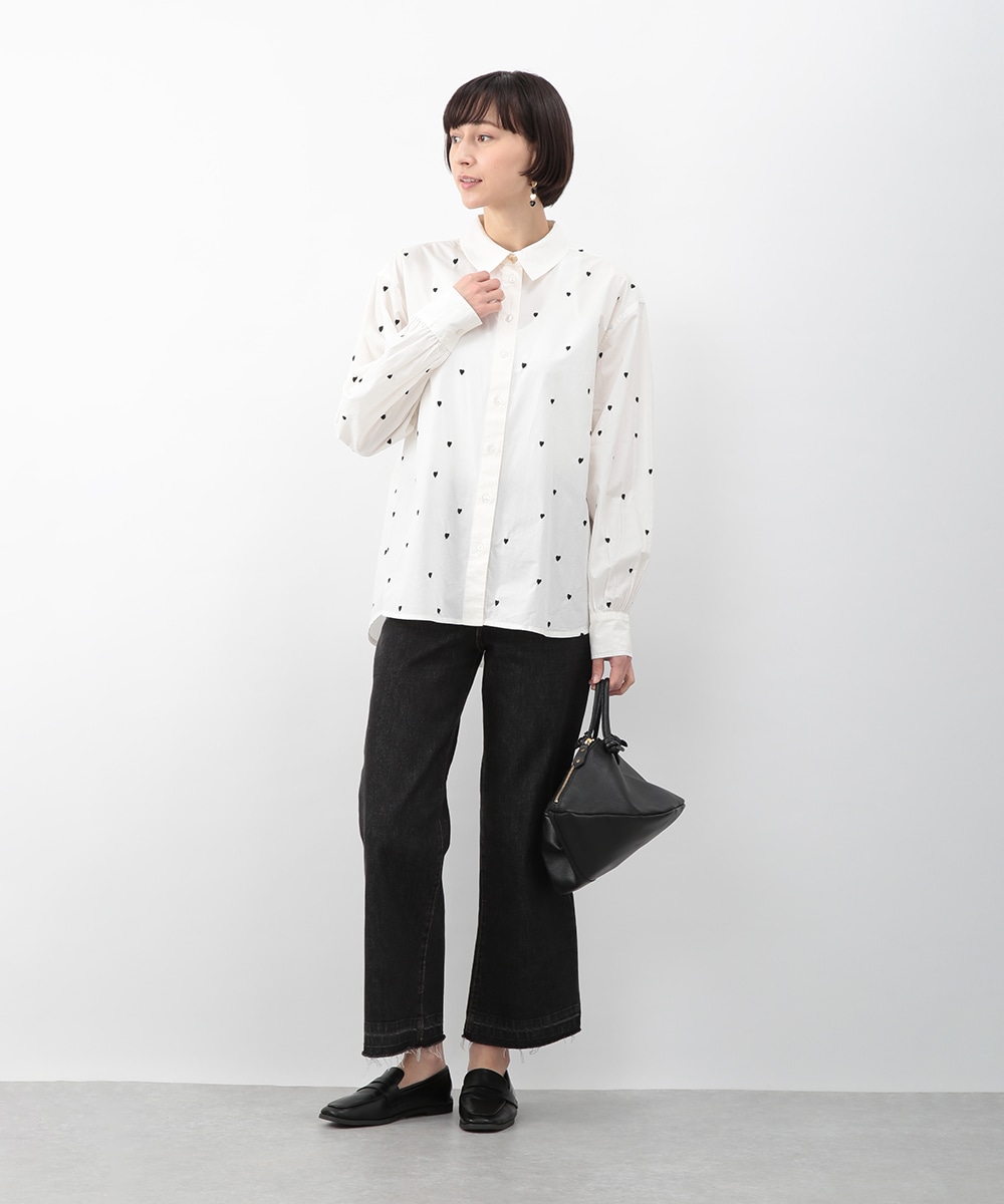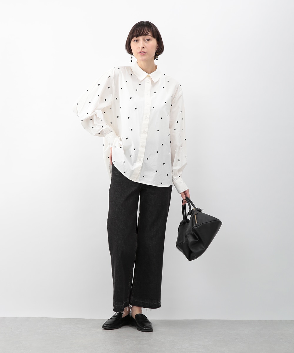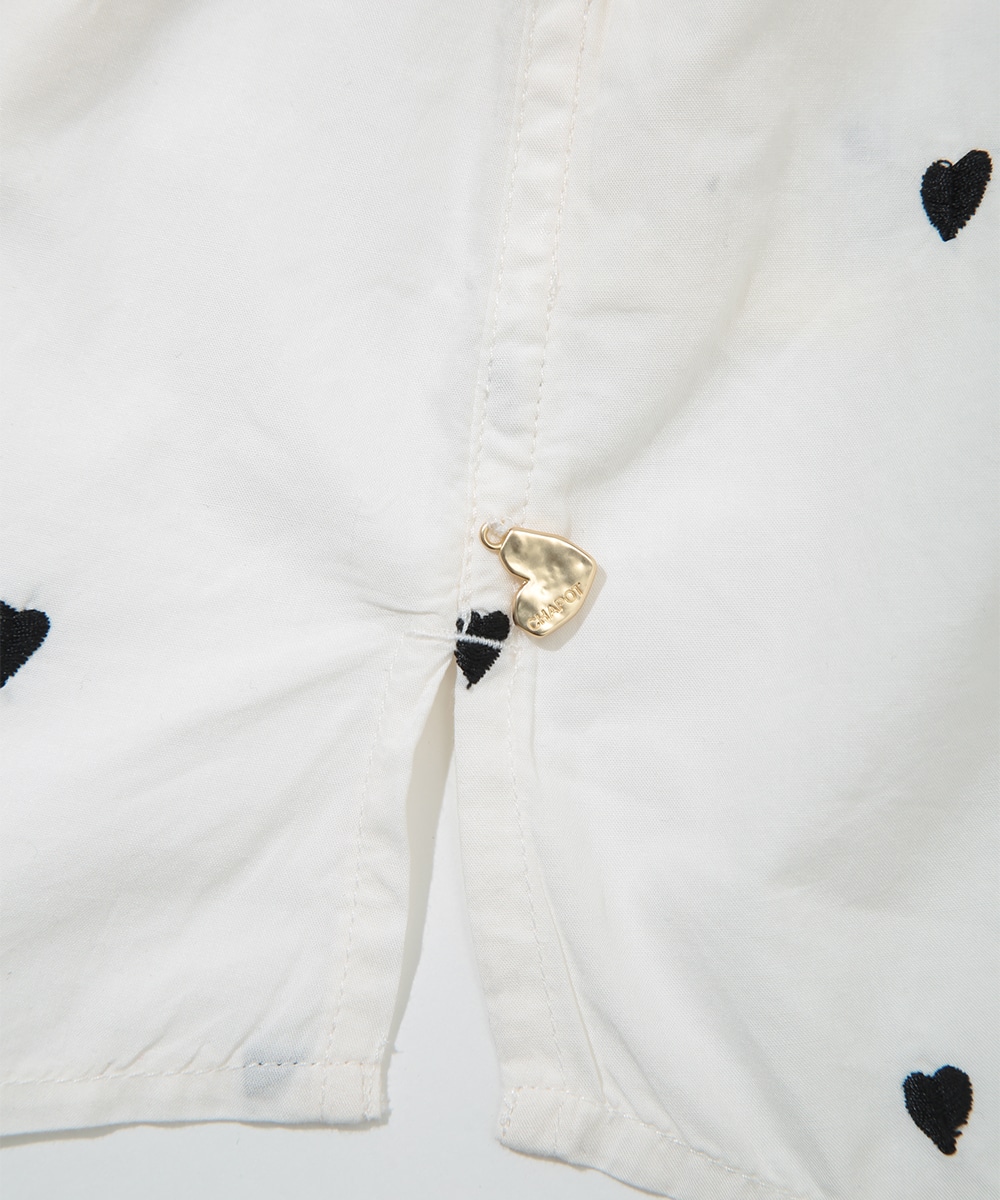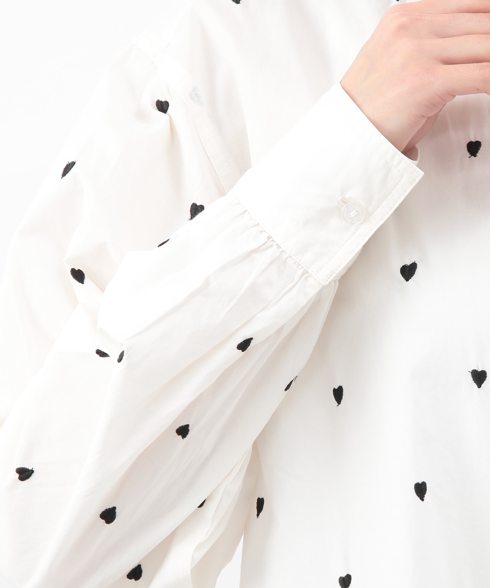 ブラックのハート刺しゅうを散りばめたコットンシャツ。甘さを抑えたモチーフがさりげないアクセントになり、大人らしい印象で着こなせます。後ろをやや長めに設計し、ヒップまわりをカバーしやすい丈感も魅力。ボタンを閉めて一枚で、軽い羽織りとしても取り入れやすく、デニムやスカートと幅広く合わせられるアイテムです。