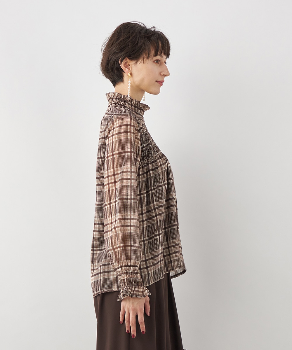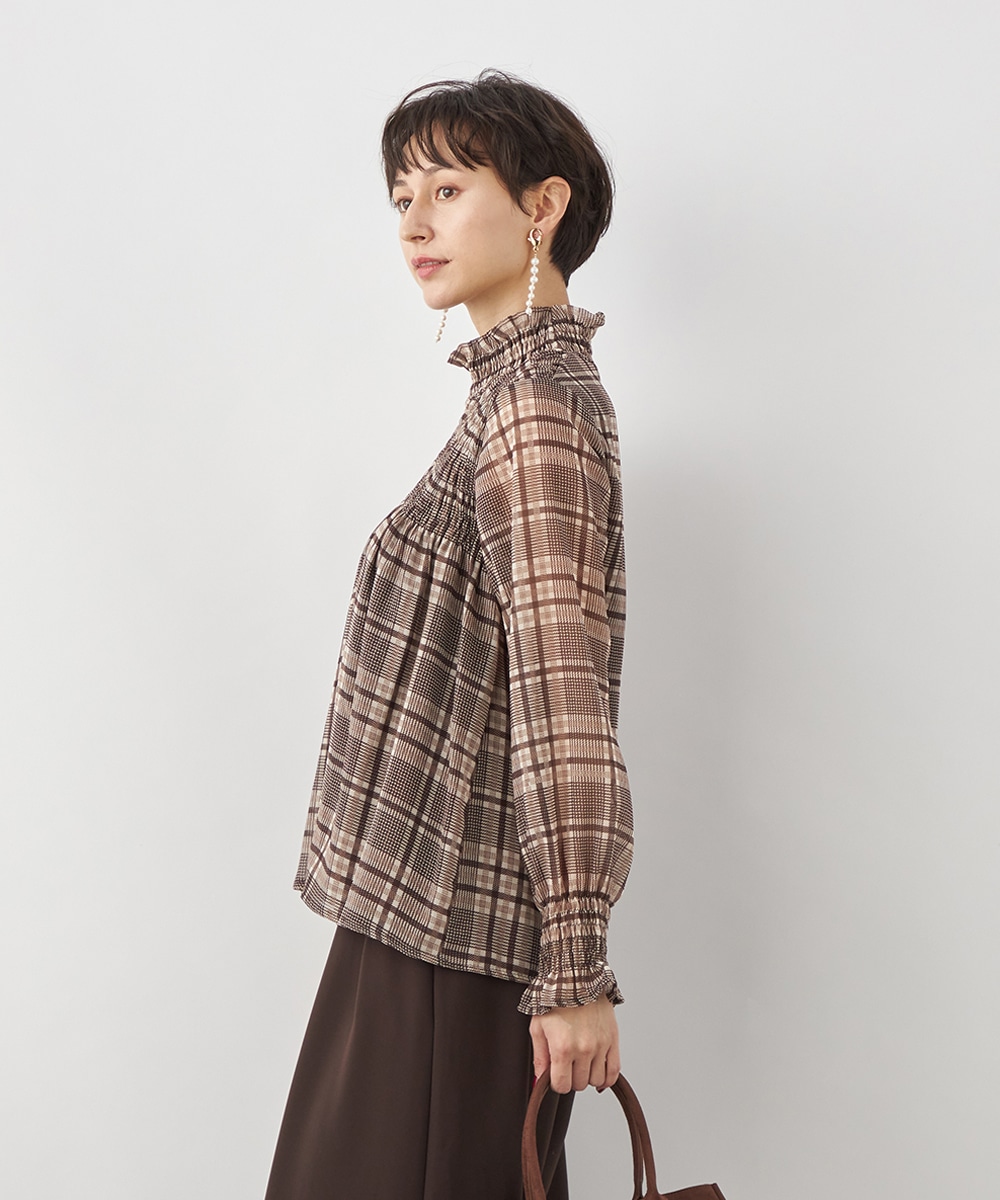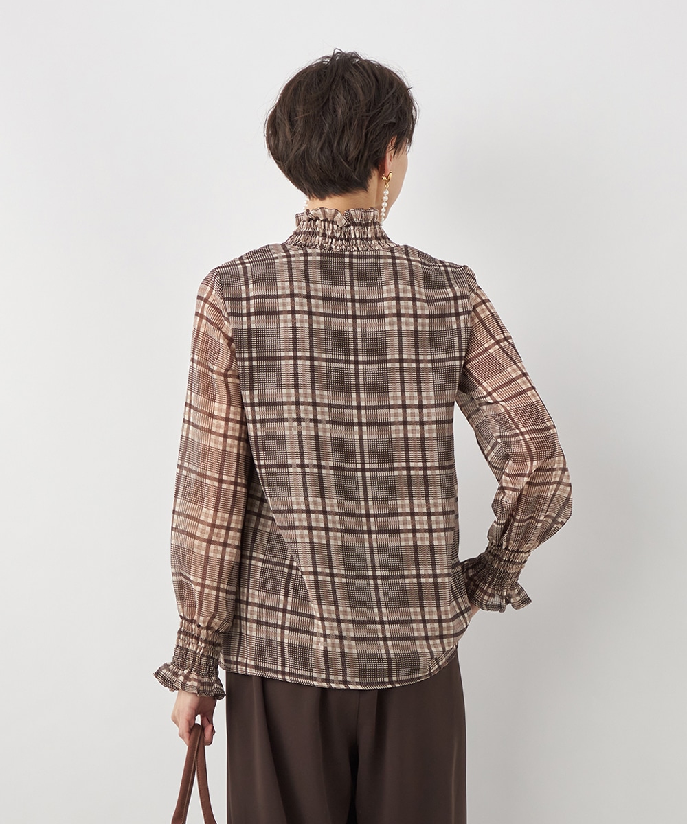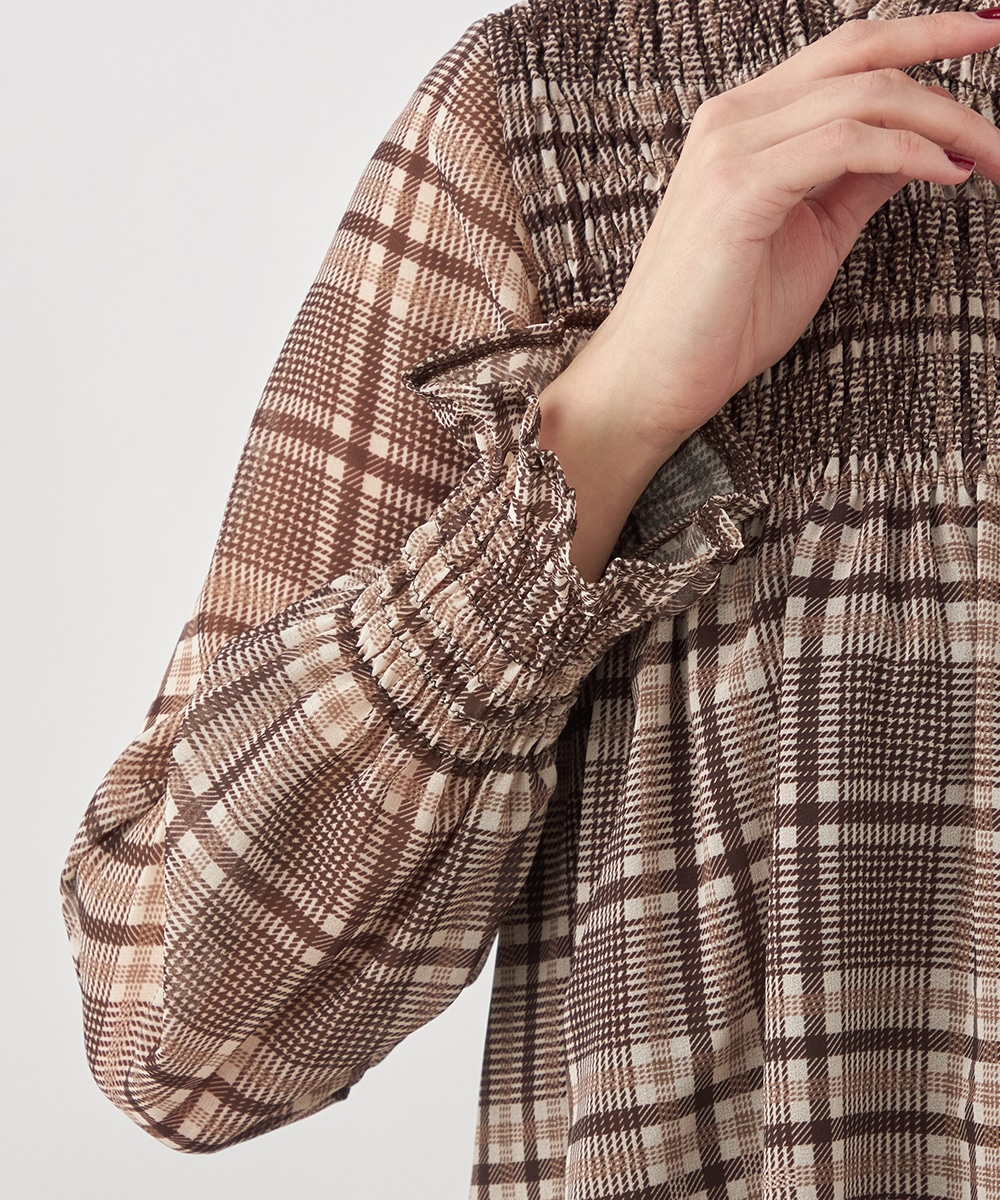 トラディショナルなチェック柄のデザイン。シャーリングのくしゅくしゅ感や襟元と袖口のフリルがフェミニンさをプラスします。生地の繊細な風合いも魅力です。上品な印象と存在感のあるデザインは幅広いシーンで活用できます。ちょっとしたお出かけにもぴったりです。