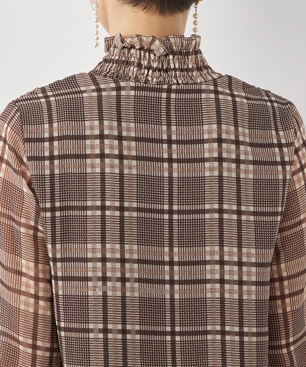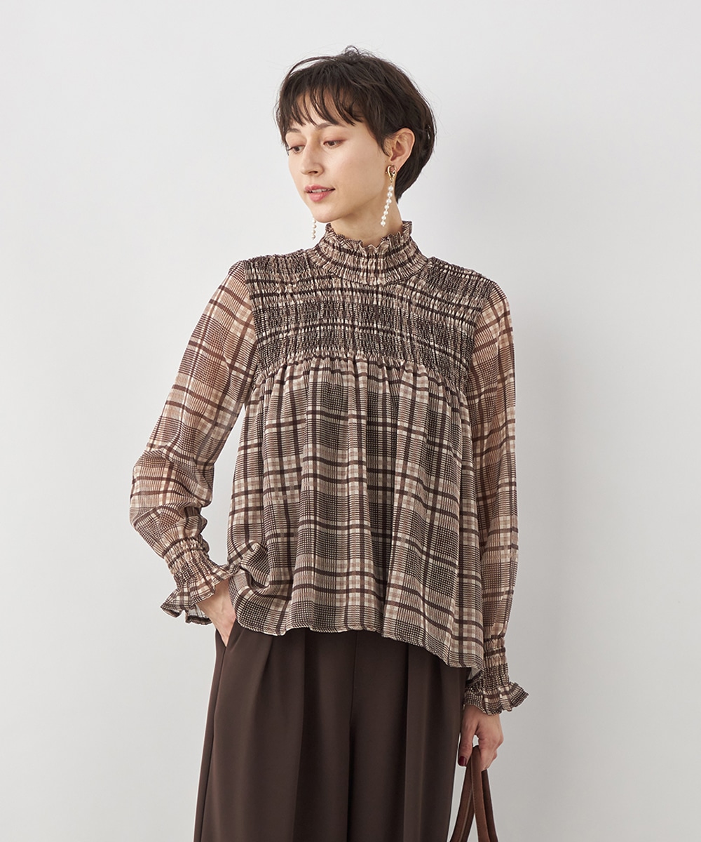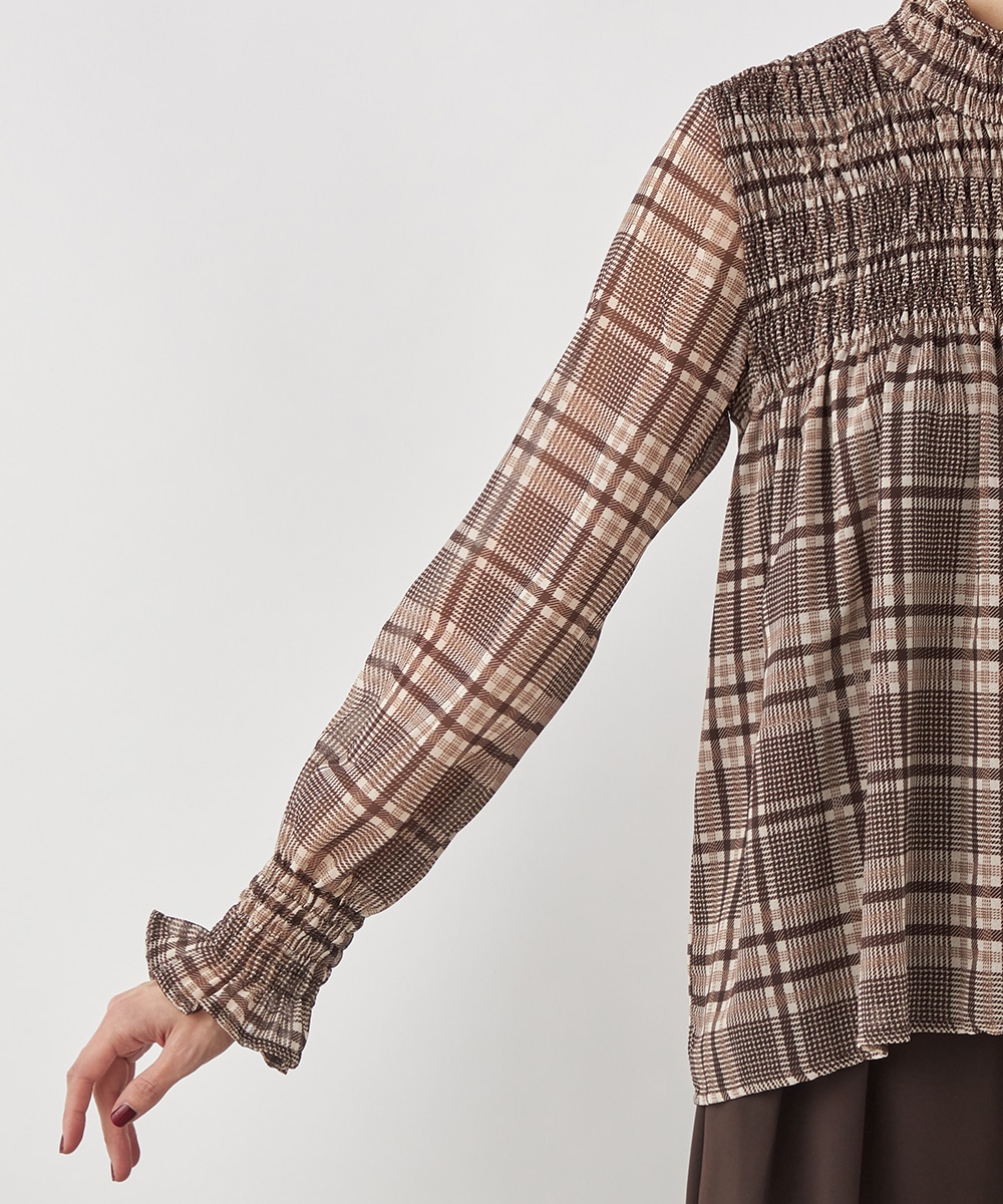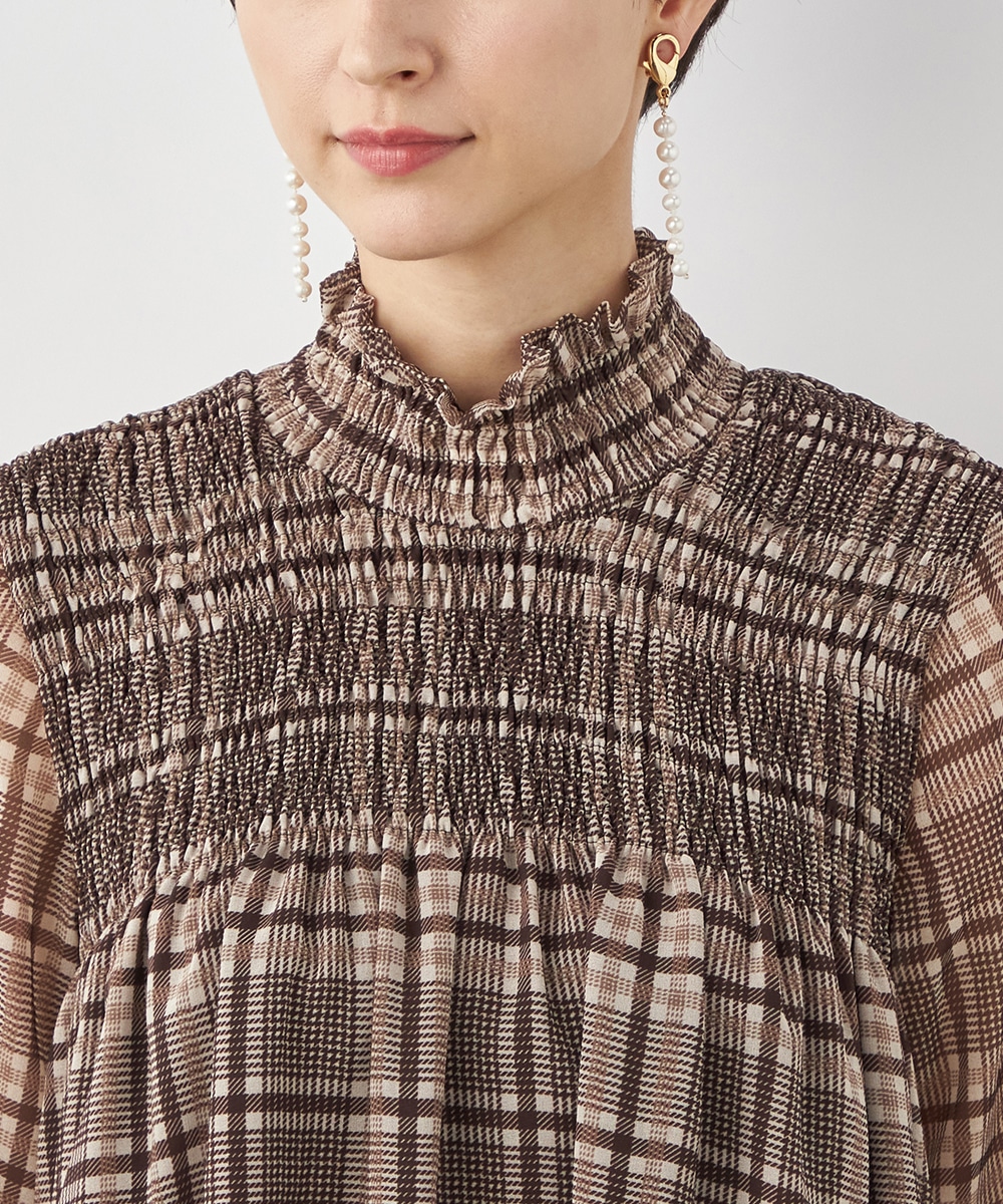 トラディショナルなチェック柄のデザイン。シャーリングのくしゅくしゅ感や襟元と袖口のフリルがフェミニンさをプラスします。生地の繊細な風合いも魅力です。上品な印象と存在感のあるデザインは幅広いシーンで活用できます。ちょっとしたお出かけにもぴったりです。