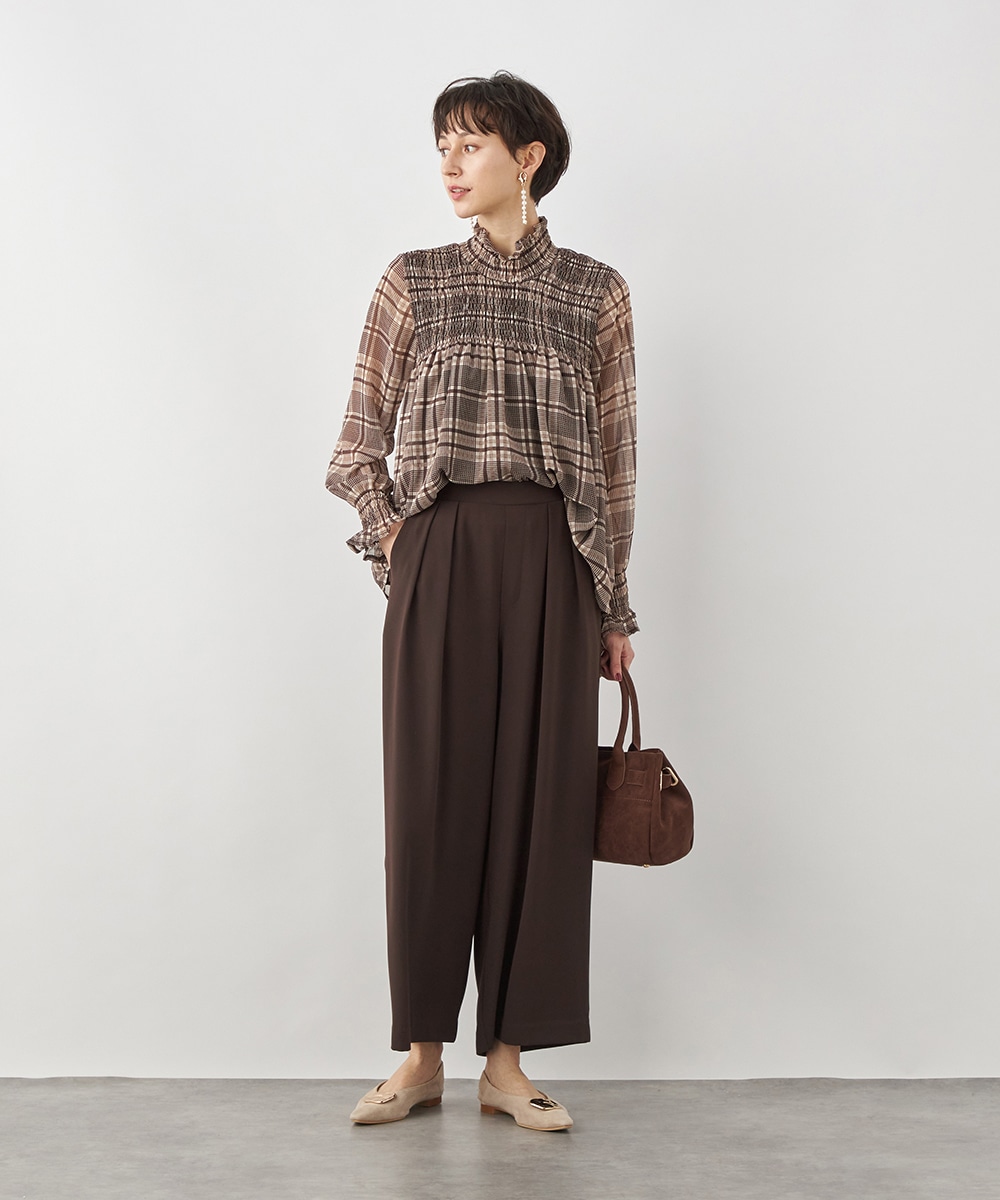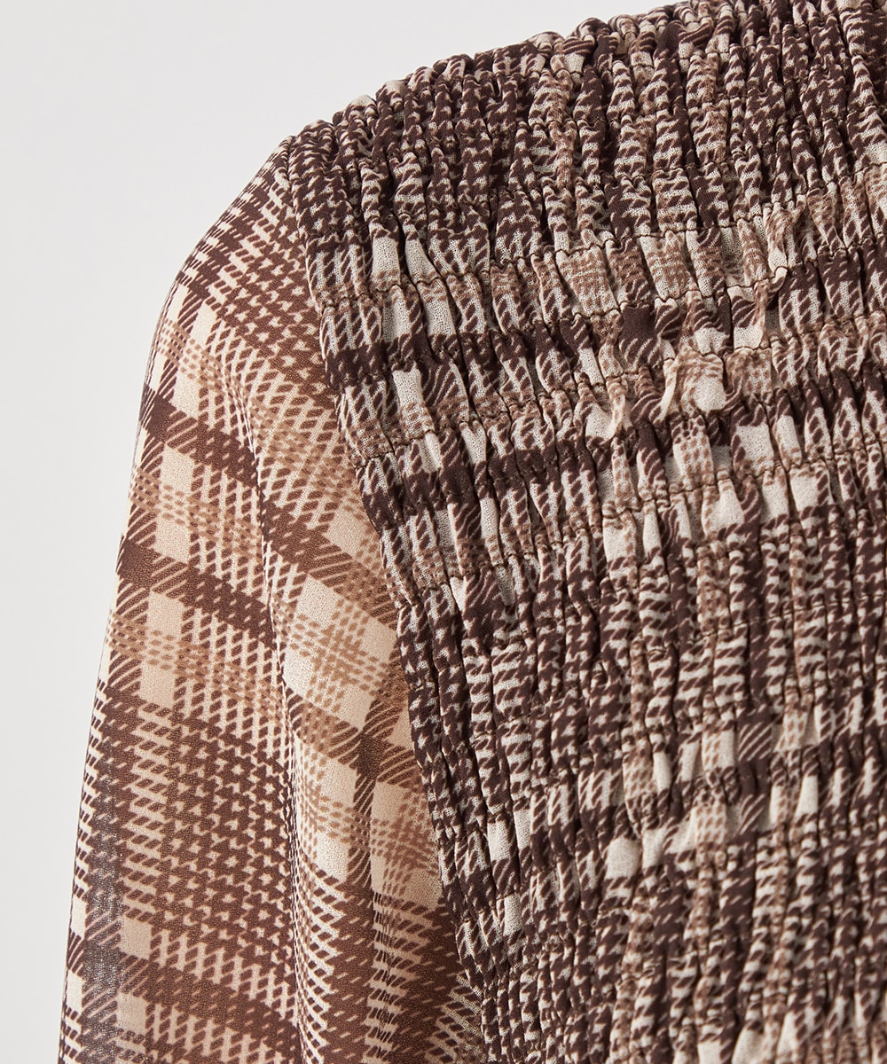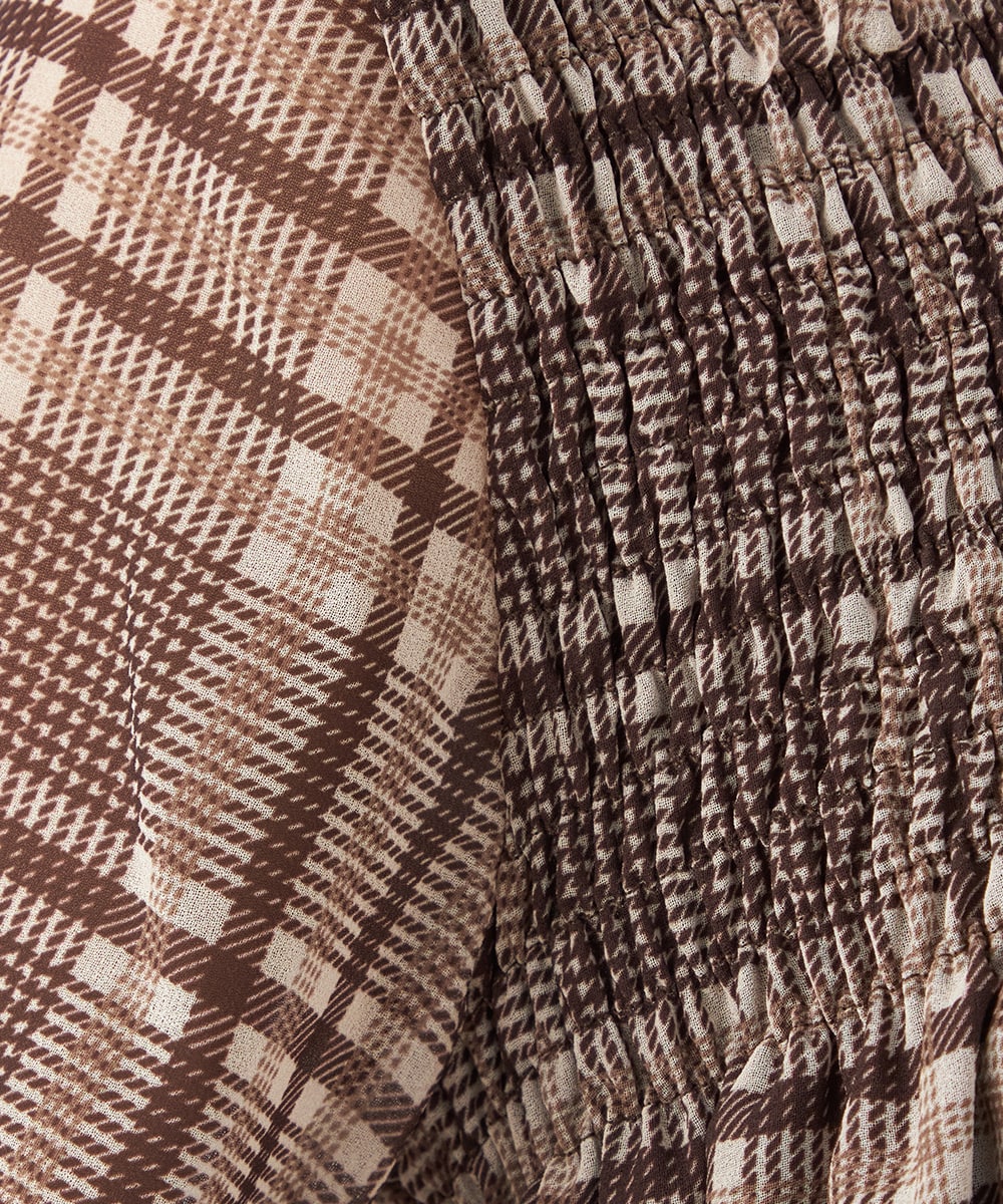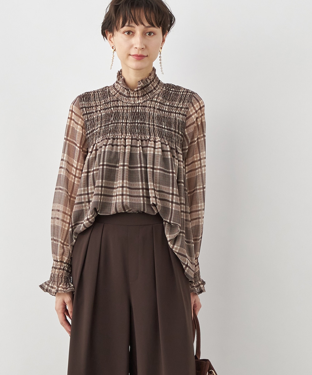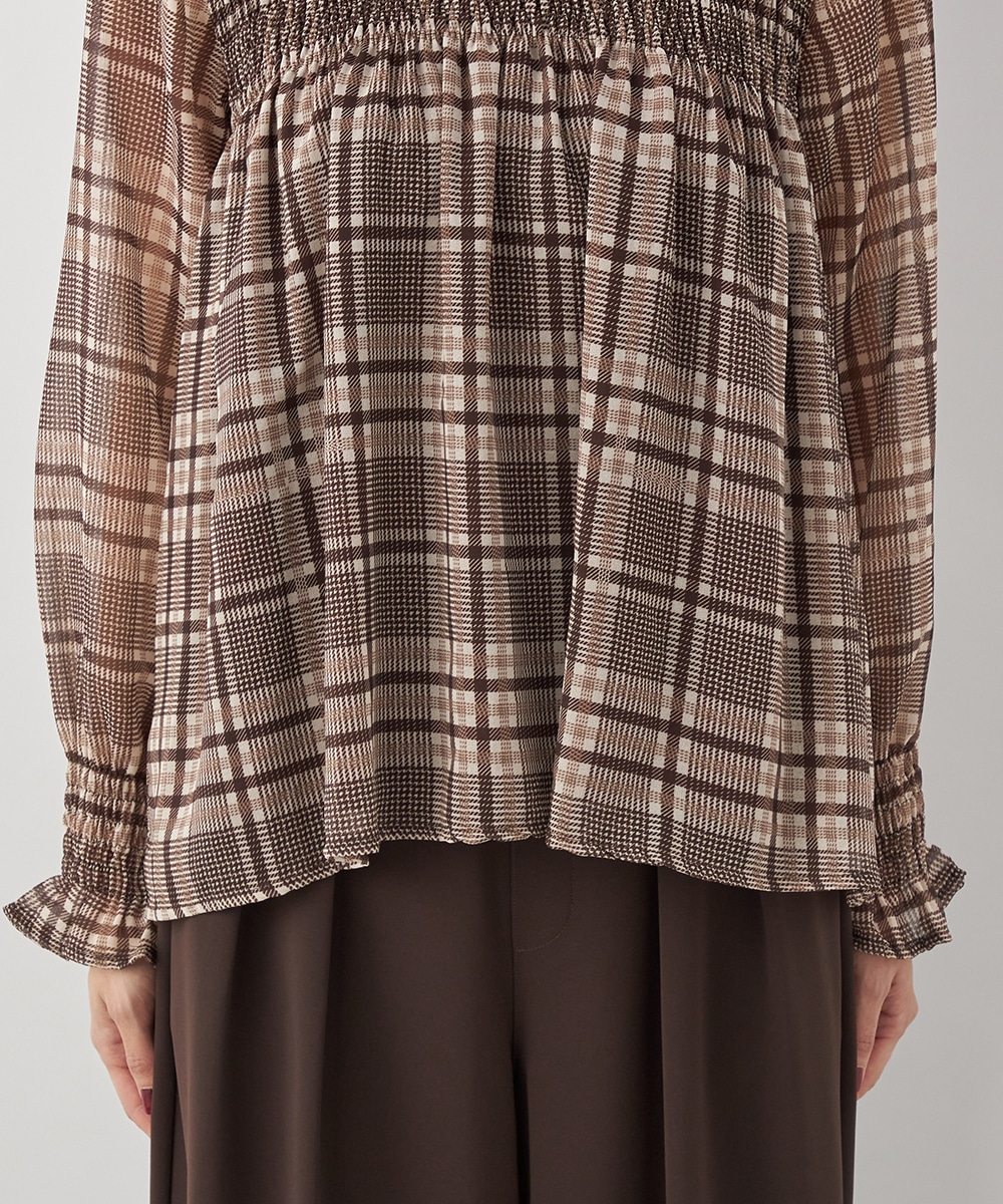 トラディショナルなチェック柄のデザイン。シャーリングのくしゅくしゅ感や襟元と袖口のフリルがフェミニンさをプラスします。生地の繊細な風合いも魅力です。上品な印象と存在感のあるデザインは幅広いシーンで活用できます。ちょっとしたお出かけにもぴったりです。