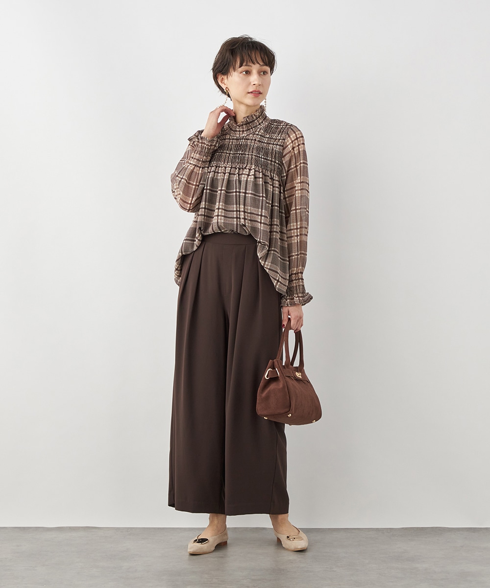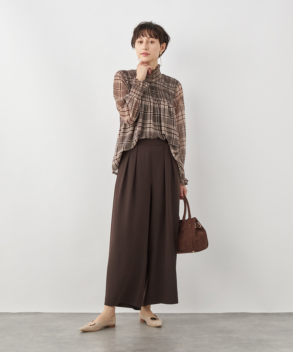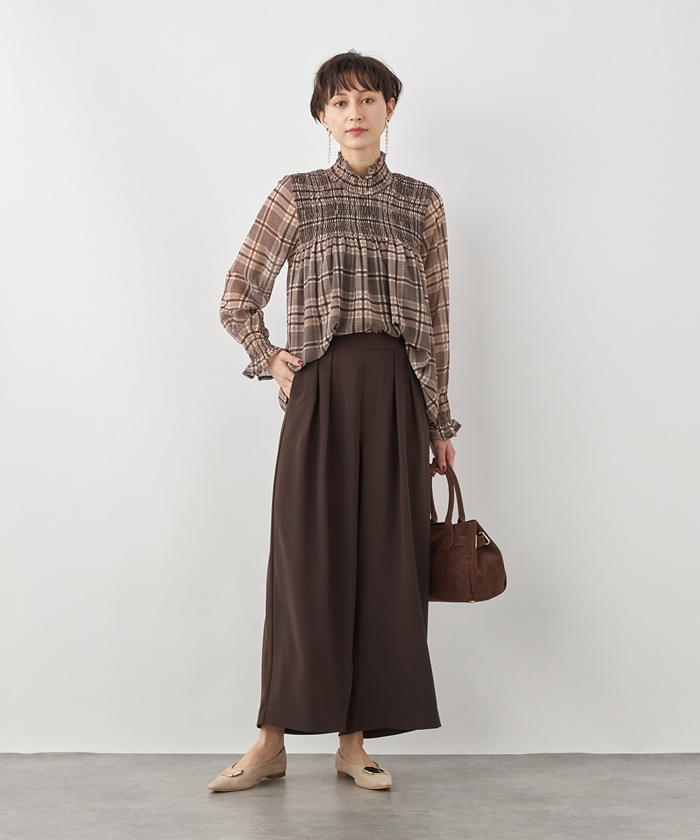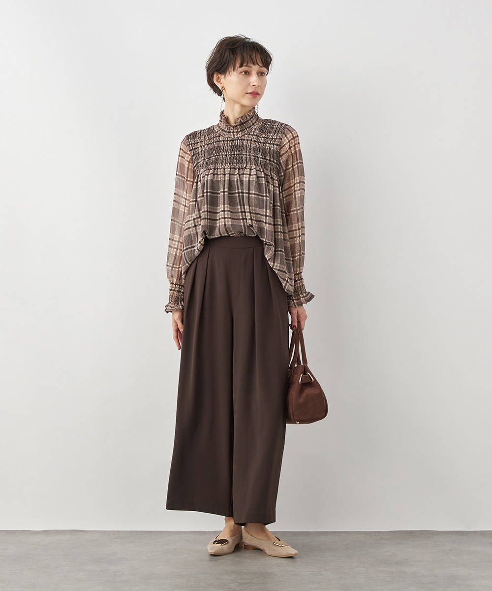 トラディショナルなチェック柄のデザイン。シャーリングのくしゅくしゅ感や襟元と袖口のフリルがフェミニンさをプラスします。生地の繊細な風合いも魅力です。上品な印象と存在感のあるデザインは幅広いシーンで活用できます。ちょっとしたお出かけにもぴったりです。