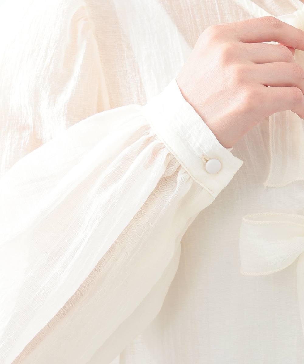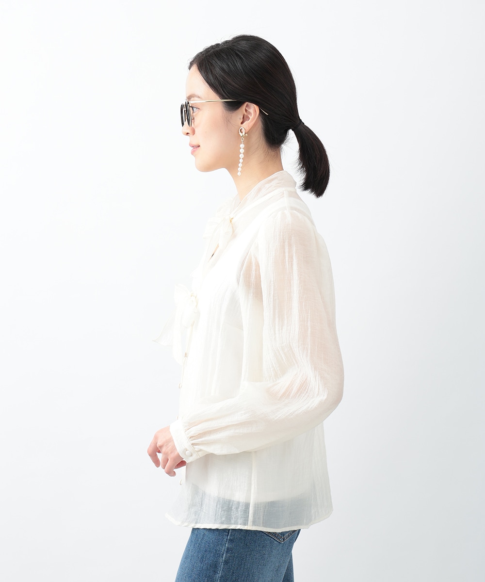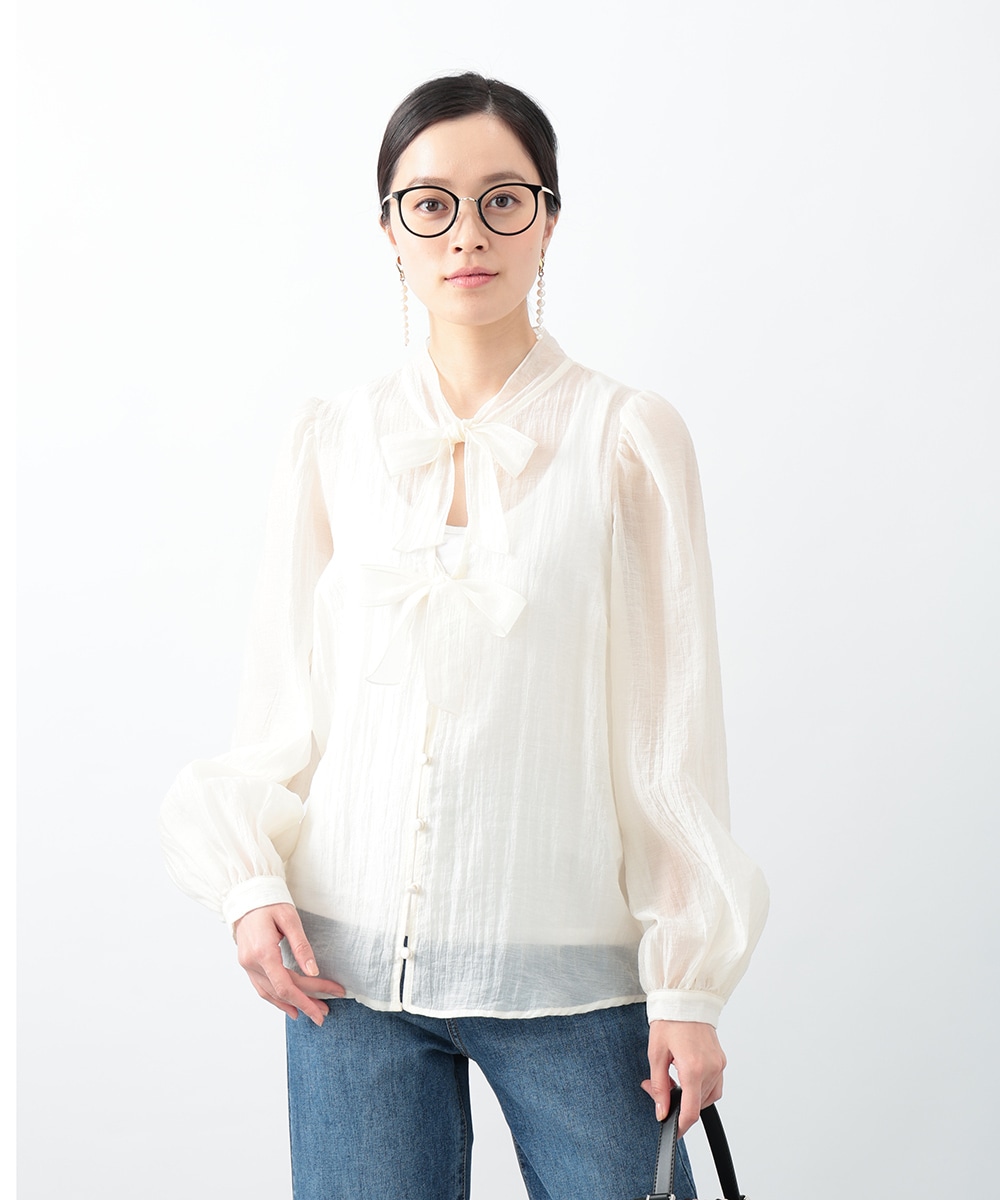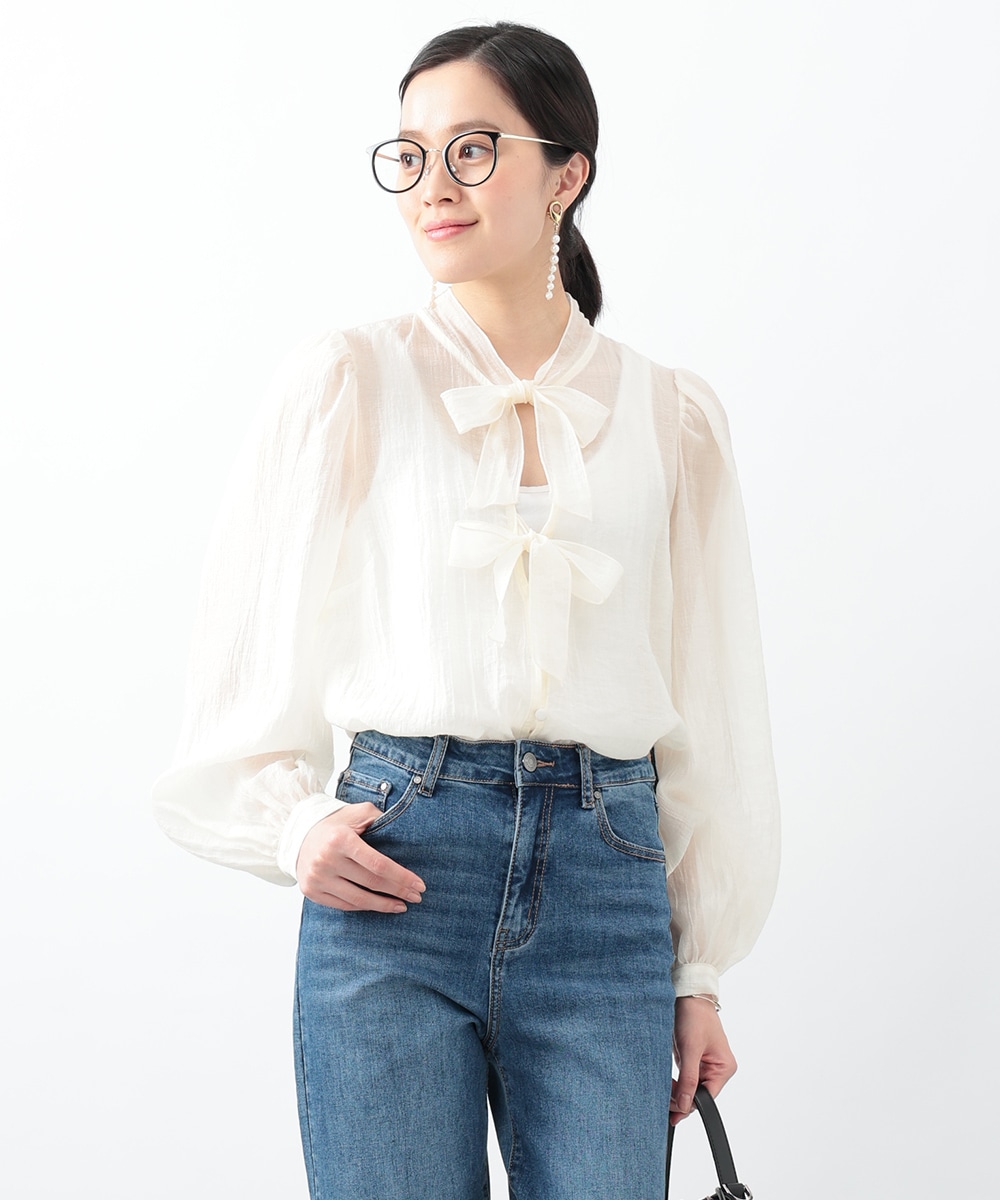 フロントのダブルリボンが女性らしいアクセントになるブラウス。透け感のあるシアー素材で柔らかく仕立て、スタイリングに軽やかな雰囲気を演出します。ふんわりとした立体的なスリーブがポイント。デニムと合わせて甘さを抑えたコーディネートもおすすめです。