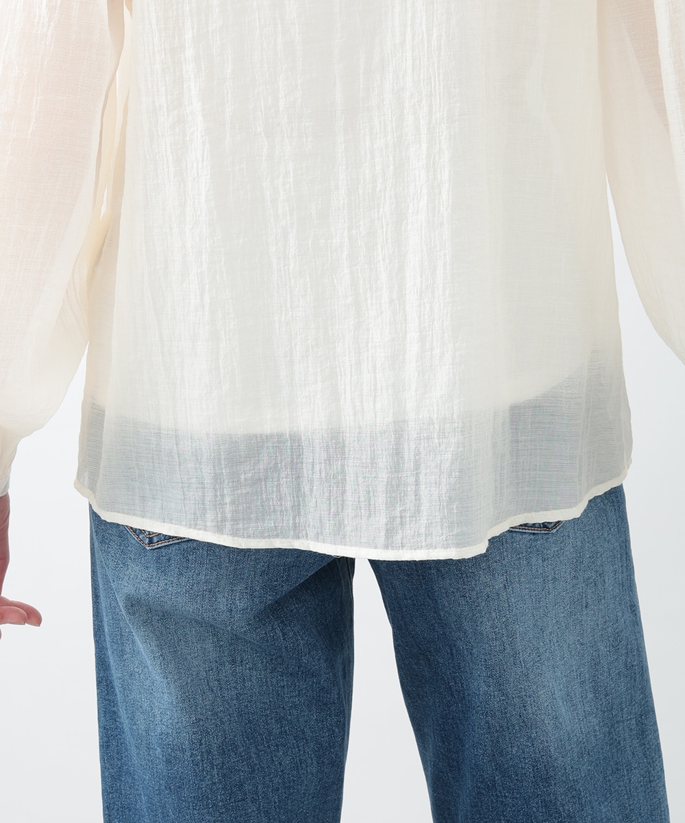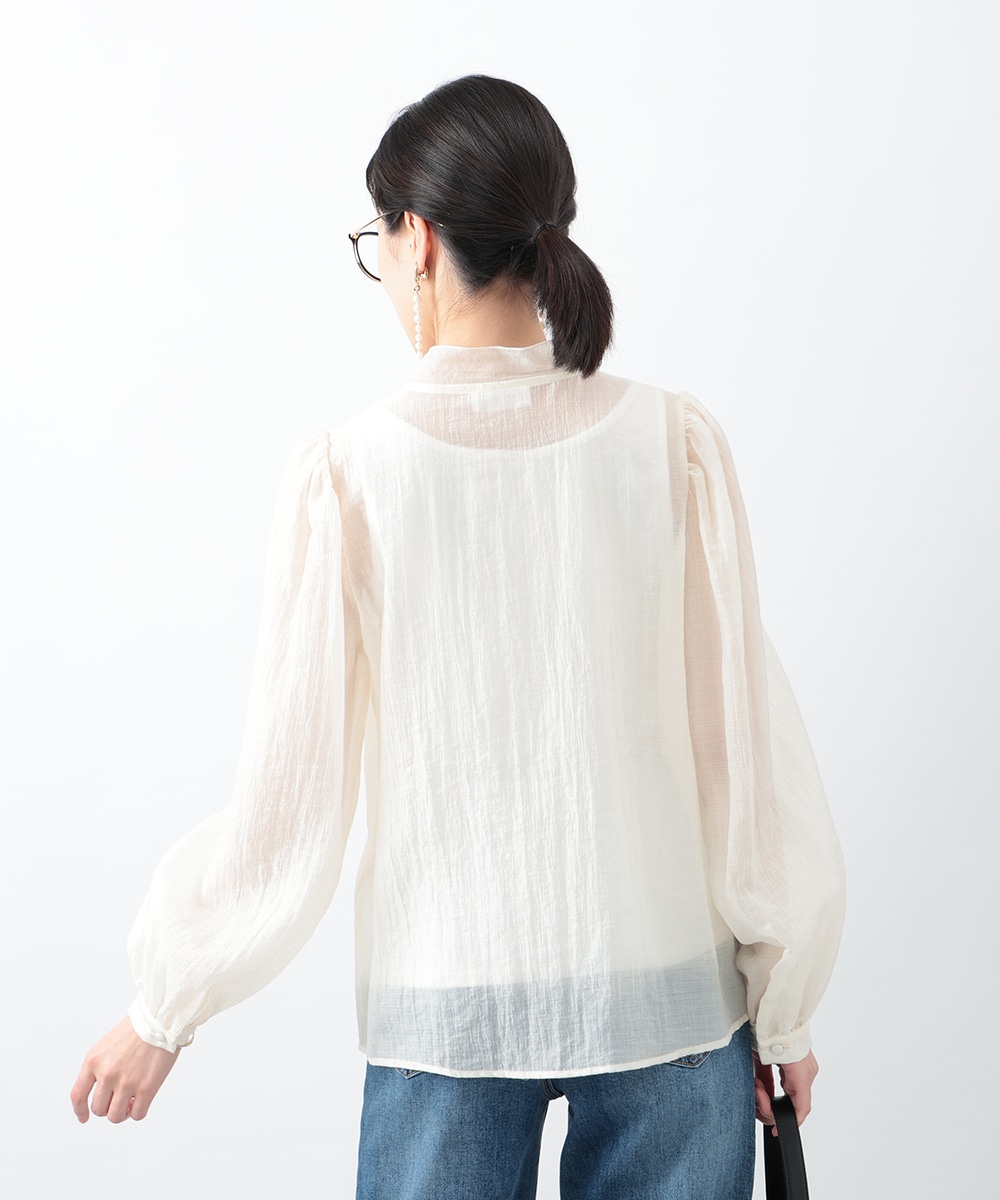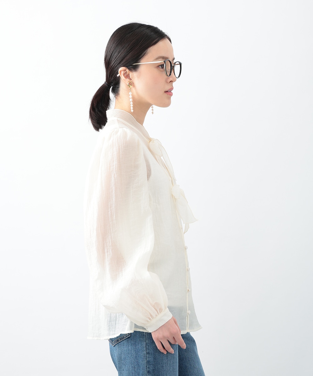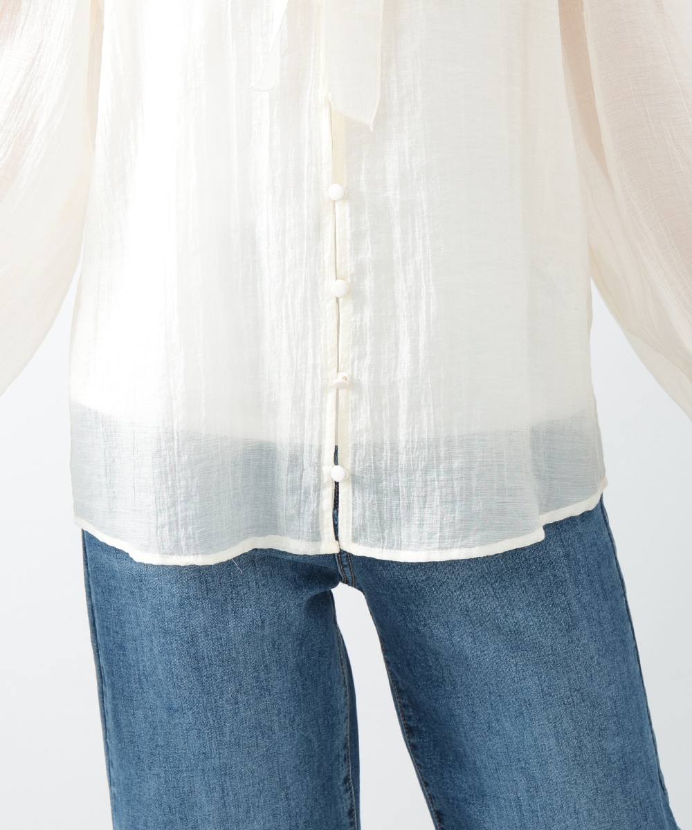フロントのダブルリボンが女性らしいアクセントになるブラウス。透け感のあるシアー素材で柔らかく仕立て、スタイリングに軽やかな雰囲気を演出します。ふんわりとした立体的なスリーブがポイント。デニムと合わせて甘さを抑えたコーディネートもおすすめです。