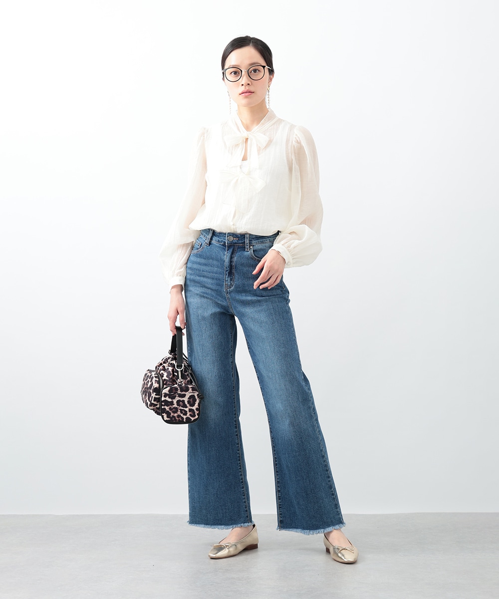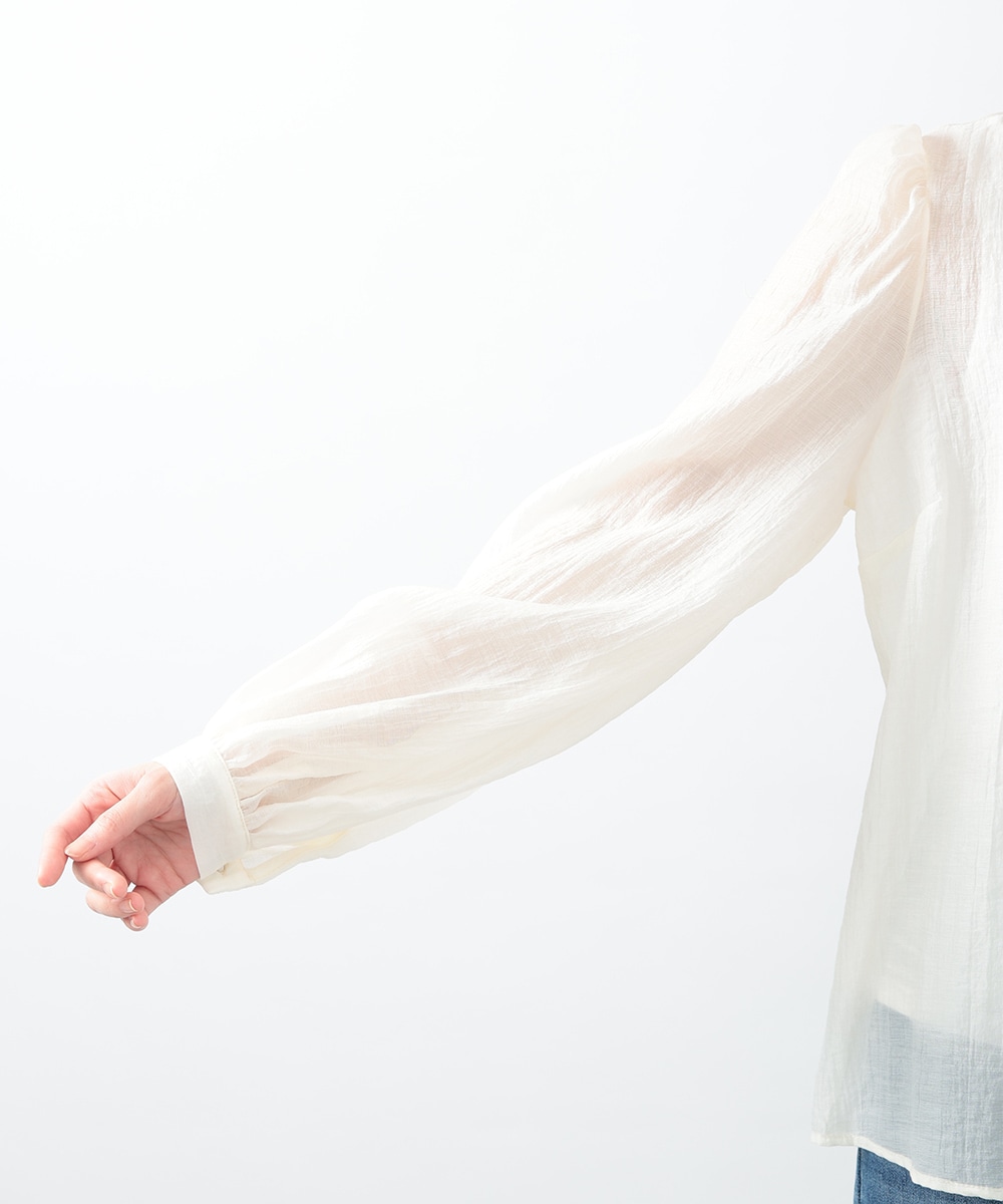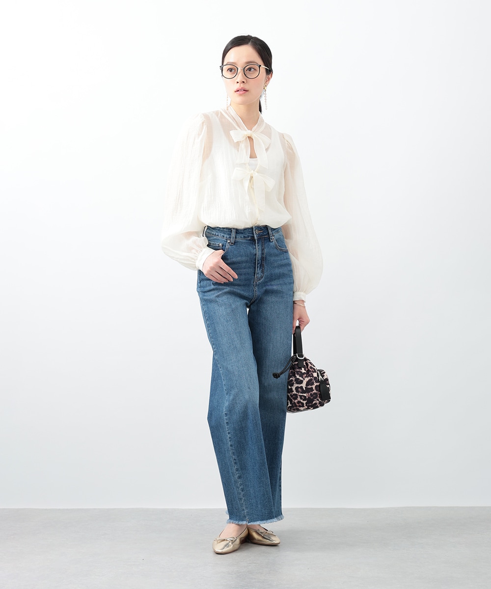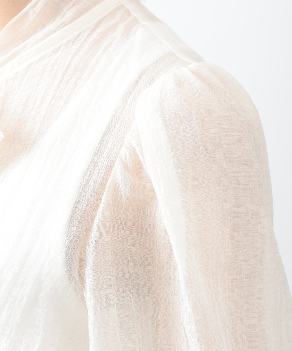 フロントのダブルリボンが女性らしいアクセントになるブラウス。透け感のあるシアー素材で柔らかく仕立て、スタイリングに軽やかな雰囲気を演出します。ふんわりとした立体的なスリーブがポイント。デニムと合わせて甘さを抑えたコーディネートもおすすめです。